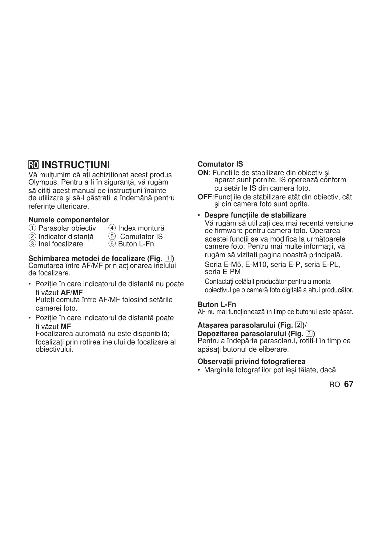 - Despre funcţiile de stabilizare Vă rugăm să utilizaţi cea mai recentă versiune de firmware pentru camera foto. Operarea acestei funcţii se va modifica la următoarele camere foto. Pentru mai multe informaţii, vă rugăm să vizitaţi pagina noastră principală. Seria E-M5, E-M10, seria E-P, seria E-PL, seria E-PM Contactaţi celălalt producător pentru a monta obiectivul pe o cameră foto digitală a altui producător. Buton L-Fn AF nu mai funcţionează în timp ce butonul este apăsat. Ataşarea parasolarului (Fig. 2)/ Depozitarea parasolarului (Fig. 3) Pentru a îndepărta parasolarul, rotiţi-l în timp ce apăsaţi butonul de eliberare. Observaţii privind fotografierea