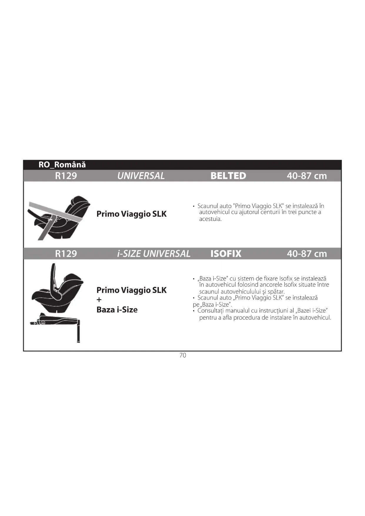 - Consultaţi manualul cu instrucţiuni al „Bazei i-Size” pentru a afla procedura de instalare în autovehicul. R129 UNIVERSAL BELTED 40-87 cm R129 i-SIZE UNIVERSAL ISOFIX 40-87 cm Primo Viaggio SLK Primo Viaggio SLK