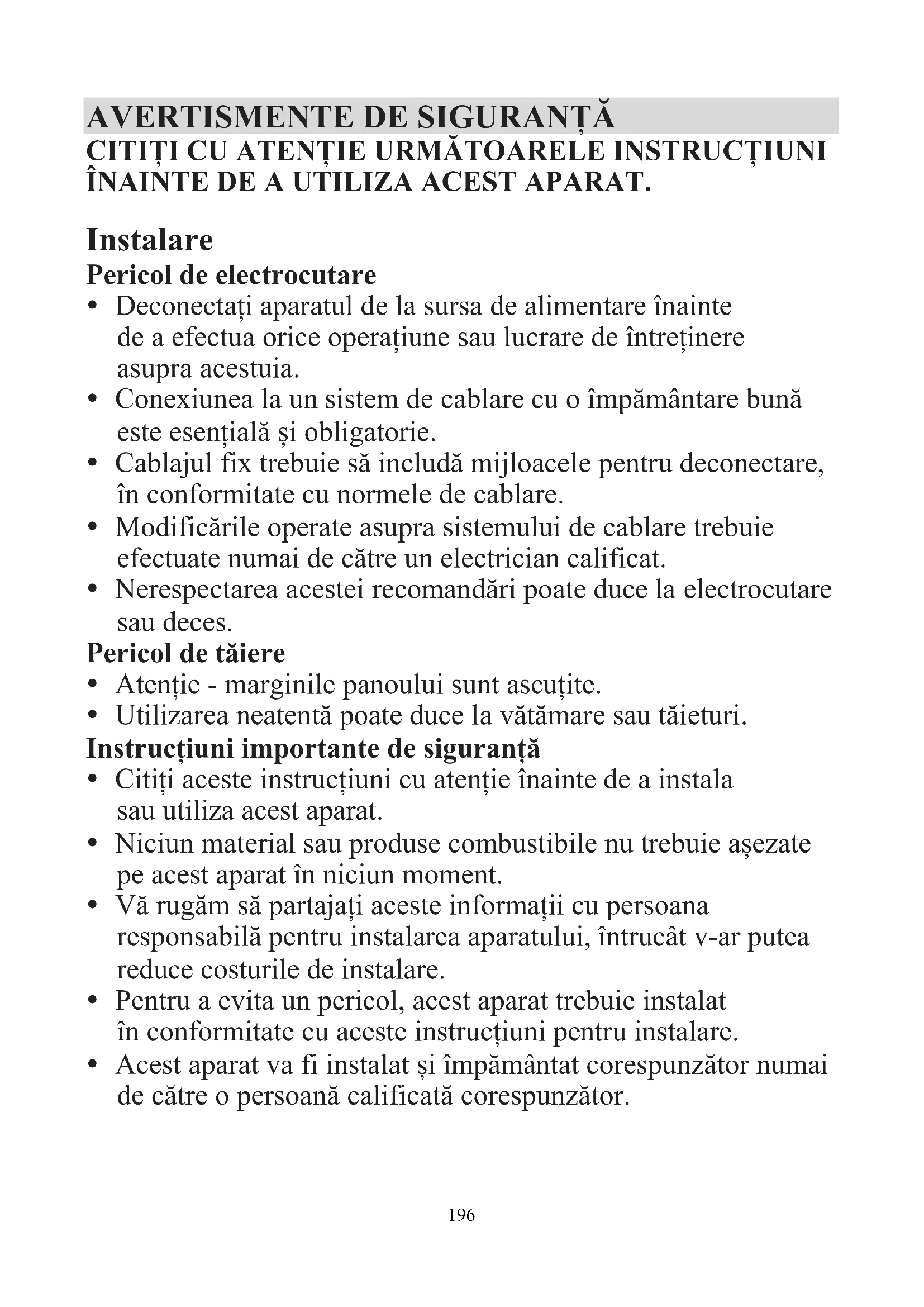 CITIȚI CU ATENȚIE URMĂTOARELE INSTRUCȚIUNI ÎNAINTE DE A UTILIZA ACEST APARAT. Instalare Pericol de electrocutare Deconectați aparatul de la sursa de alimentare înainte de a efectua orice operațiune sau lucrare de întreținere asupra acestuia. Conexiunea la un sistem de cablare cu o împământare bună este esențială și obligatorie. Cablajul fix trebuie să includă mijloacele pentru deconectare, în conformitate cu normele de cablare. Modificările operate asupra sistemului de cablare trebuie efectuate numai de către un electrician calificat. Nerespectarea acestei recomandări poate duce la electrocutare sau deces. Pericol de tăiere Atenție - marginile panoului sunt ascuțite. Utilizarea neatentă poate duce la vătămare sau tăieturi. Instrucțiuni importante de siguranță Citiți aceste instrucțiuni cu atenție înainte de a instala sau utiliza acest aparat. Niciun material sau produse combustibile nu trebuie așezate pe acest aparat în niciun moment. Vă rugăm să partajați aceste informații cu persoana responsabilă pentru instalarea aparatului, întrucât v-ar putea reduce costurile de instalare. Pentru a evita un pericol, acest aparat trebuie instalat în conformitate cu aceste instrucțiuni pentru instalare. Acest aparat va fi instalat și împământat corespunzător numai de către o persoană calificată corespunzător.197 Acest aparat trebuie conectat la un circuit care încorporează un comutator de izolare ce oferă deconectarea completă de la sursa de alimentare. AVERTIZARE: Folosiți doar protecții ale plitei concepute de producătorul aparatului de gătit sau indicate de producătorul aparatului în instrucțiunile de utilizare, după caz, sau protecții ale plitei încorporate în aparat. Utilizarea unor dispozitive de protecție necorespunzătoare poate provoca accidente. Nereușita de a instala aparatul corect poate invalida orice pretenții de garanție sau răspundere. În ceea ce privește detaliile de instalare, consultați secțiunea <Instalare>. Operare și întreținere Pericol de electrocutare Nu gătiți pe o plită defectă sau fisurată. În cazul în care suprafața plitei se sparge sau se fisurează, opriți imediat aparatul de la sursa de alimentare (comutatorul din perete) și contactați un tehnician calificat. Opriți plita de la comutatorul de pe perete înaintea curățării sau a întreținerii. Nerespectarea acestei recomandări poate duce la electrocutare sau deces. Pericol pentru sănătate Acest aparat este conform cu standardele de siguranță electromagnetică. Pericol de suprafață fierbinte În timpul utilizării, părțile accesibile ale acestui aparat se vor înfierbânta suficient încât să cauzeze arsuri. Nu lăsați părți ale corpului, hainele sau are alt articol în afară de ustensilele de bucătărie adecvate să intre în contact cu sticla ceramică până când nu se răcește suprafața.198 Obiectele metalice precum cuțitele, furculițele, lingurile și capacele nu trebuie așezate pe suprafața plitei, deoarece se pot încălzi.4 Copiii cu vârsta mai mică de 8 ani vor fi ținuți la distanță, mai puțin când sunt supravegheați permanent. Mânerele tigăilor pot fi fierbinți la atingere. Verificați ca mânerele tigăii să nu fie suspendate deasupra altor zone de gătit care sunt aprinse. Nu lăsați mânerele la îndemâna copiilor. Nerespectarea acestei recomandări poate duce la arsuri și opărituri. Pericol de tăiere Lama extrem de ascuțită a unei raclete pentru suprafețe de gătit este expusă când se retrage capacul de protecție. Folosiți cu multă atenție și depozitați întotdeauna în siguranță și nu lăsați la îndemâna copiilor. Utilizarea neatentă poate duce la vătămare sau tăieturi. Instrucțiuni importante de siguranță Nu lăsați niciodată aparatul nesupravegheat în timpul utilizării. Fierberea în exces cauzează apariția fumului și scurgeri de grăsime care se pot aprinde. Nu utilizați niciodată aparatul drept suprafață de lucru sau depozitare. Nu lăsați niciodată obiecte sau ustensile pe aparat. Nu folosiți niciodată aparatul pentru încălzirea camerei. După utilizare, opriți întotdeauna zonele de gătit și suprafața de gătit conform descrierii din acest manual (adică folosind comenzile tactile). Nu vă bazați pe opțiunea de detectare a tigăii pentru a opri zonele de gătit atunci când luați tigaia de pe plită. Nu lăsați copiii să se joace cu aparatul sau să se așeze sau să urce pe aceasta.199 Nu depozitați articole de interes pentru copii în dulapurile de deasupra aparatului. Copiii care se urcă pe suprafața de gătit pot suferi vătămări grave. Nu lăsați copiii singuri sau nesupravegheați în zona unde aparatul este în funcțiune. Copiii sau persoanele cu dizabilități care le limitează capacitatea de a folosi aparatul trebuie să fie instruiți de o persoană responsabilă și competentă privind utilizarea acestuia. Instructorul trebuie să fie mulțumit că aceștia pot folosi aparatul fără a se pune în pericol pe ei înșiși sau mediul înconjurător. Nu reparați sau nu înlocuiți nicio piesă a aparatului mai puțin atunci când în manual există prevederi specifice în acest sens. Toate celelalte lucrări de service trebuie efectuate de un tehnician calificat. Nu folosiți un dispozitiv de curățare cu aburi pentru plita dvs. de gătit. Nu așezați și nu scăpați obiecte grele pe plita de gătit. Nu stați pe plita dvs. de gătit. Nu folosiți tigăi cu margini zimțate sau nu trageți de tigaie de-a lungul suprafeței din sticlă, întrucât acest lucru poate zgâria sticla. Nu folosiți bureți de sârmă sau agenți de curățare abrazivi pentru a vă curăța plita de gătit, întrucât acest lucru poate zgâria sticla ceramică. În cazul în care cablul de alimentare este deteriorat, acesta trebuie înlocuit de către producător, agentul său de service sau persoane calificate simila