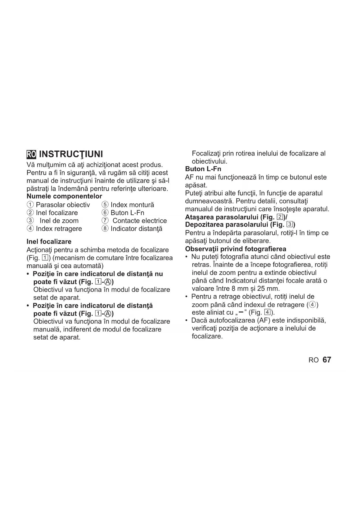- Poziţieîncareindicatoruldedistanţă poatefivăzut(Fig.1-A) Obiectivul va funcţiona în modul de focalizare manuală, indiferent de modul de focalizare setat de aparat. Focalizaţi prin rotirea inelului de focalizare al obiectivului. Buton L-Fn AF nu mai funcţionează în timp ce butonul este apăsat. Puteţi atribui alte funcţii, în funcţie de aparatul dumneavoastră. Pentru detalii, consultaţi manualul de instrucţiuni care însoţeşte aparatul. Ataşareaparasolarului(Fig.2)/ Depozitarea parasolarului (Fig. 3) Pentru a îndepărta parasolarul, rotiţi-l în timp ce apăsaţi butonul de eliberare. Observaţiiprivindfotografierea