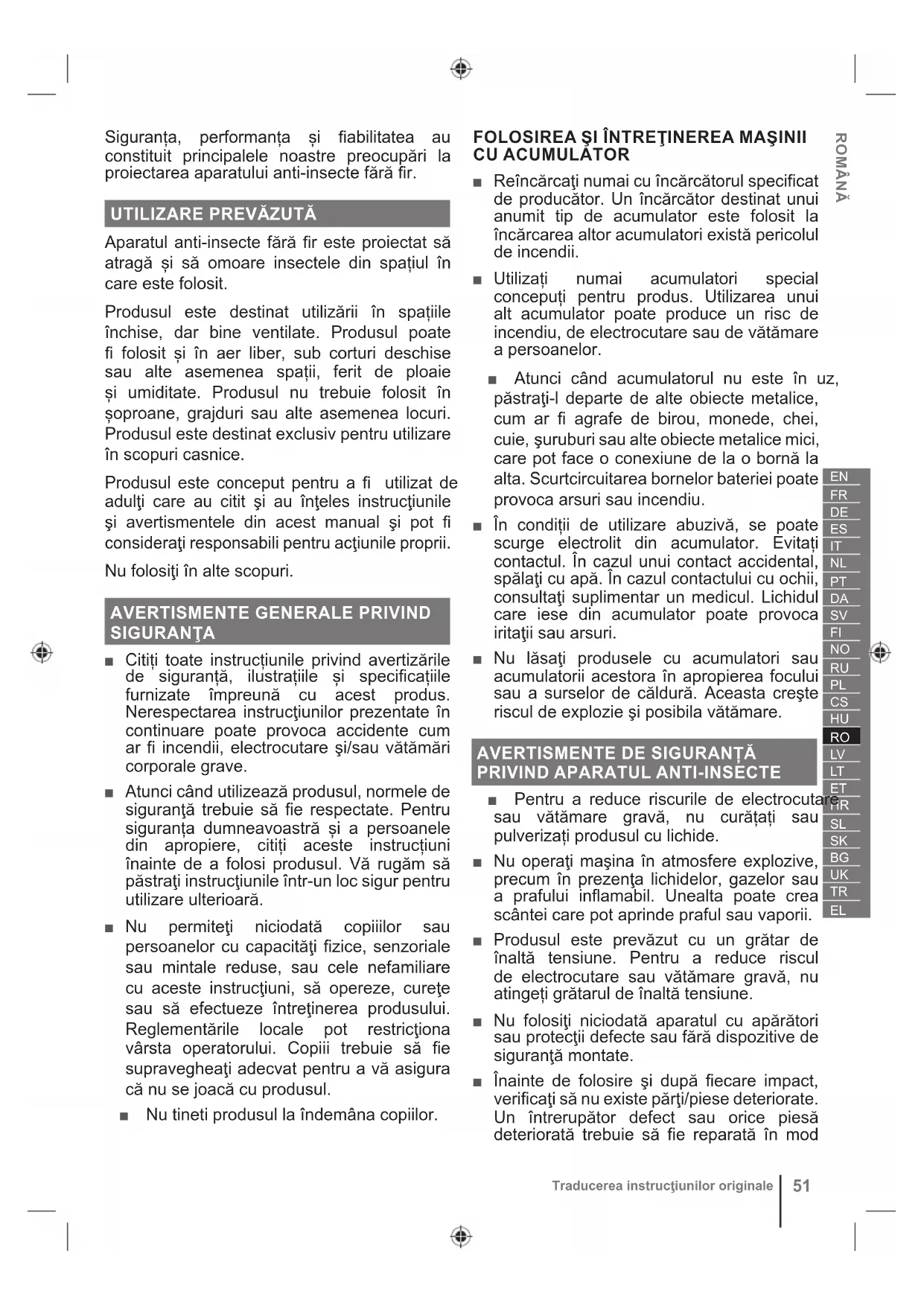 ■ Pentru a reduce riscurile de electrocutare sau vătămare gravă, nu curățați sau pulverizați produsul cu lichide. ■ Nu operaţi maşina în atmosfere explozive, precum în prezenţa lichidelor, gazelor sau a prafului inflamabil. Unealta poate crea scântei care pot aprinde praful sau vaporii. ■ Produsul este prevăzut cu un grătar de înaltă tensiune. Pentru a reduce riscul de electrocutare sau vătămare gravă, nu atingeți grătarul de înaltă tensiune. ■ Nu folosiţi niciodată aparatul cu apărători sau protecţii defecte sau fără dispozitive de siguranţă montate. ■ Înainte de folosire şi după fiecare impact, verificaţi să nu existe părţi/piese deteriorate. Un întrerupător defect sau orice piesă deteriorată trebuie să fie reparată în mod52 Traducerea instrucţiunilor originale corespunzător sau înlocuită de un service autorizat. ■ Nu modificați niciodată produsul în niciun fel. În caz contrar poate rezulta rănirea gravă a dvs. şi a altor peroane din jur. ■ Opriți echipamentul, scoateți acumulatorul și lăsați produsul să se răcească: ● înainte de efectuarea reparațiilor ● înainte de a îndepărta un obiect ce a determinat un blocaj ● înainte de a verifica, curăţa sau lucra asupra produslui ● înainte de a schimba accesoriile ● în timpul lucrărilor de întreținere a produsului ■ Opriţi imediat maşina şi îndepărtați acumulatorul în caz de accident sau defecţiune. Nu utilizaţi din nou produsul înainte de a realiza o verificare completă, la un centru de service autorizat. ■ Pentru a evita vătămarea, nu priviți în lumina UV cu LED. AVERTISMENTE SUPLIMENTARE