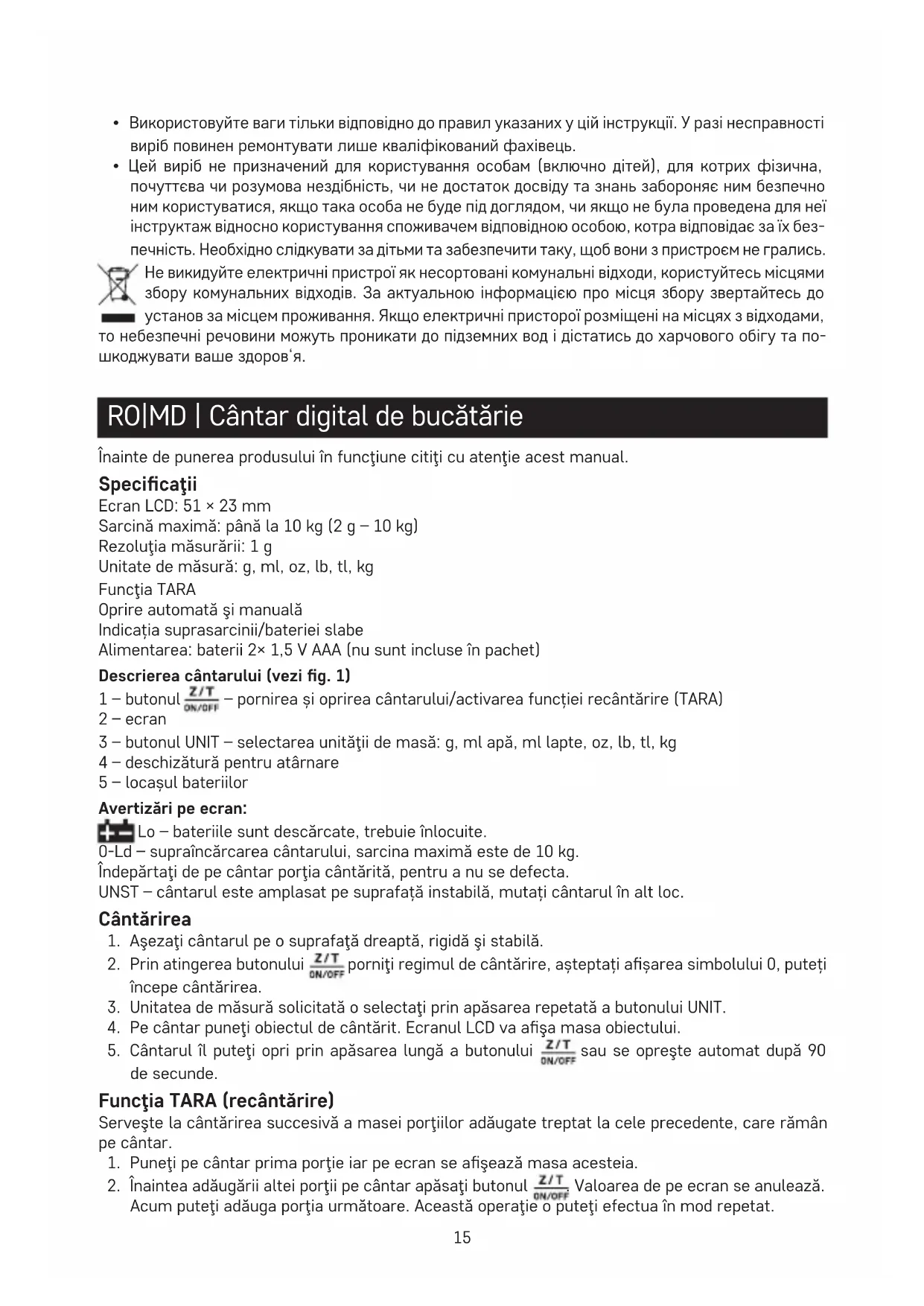 - Acest cântar este destinat doar pentru cântărirea alimentelor în uz casnic.
