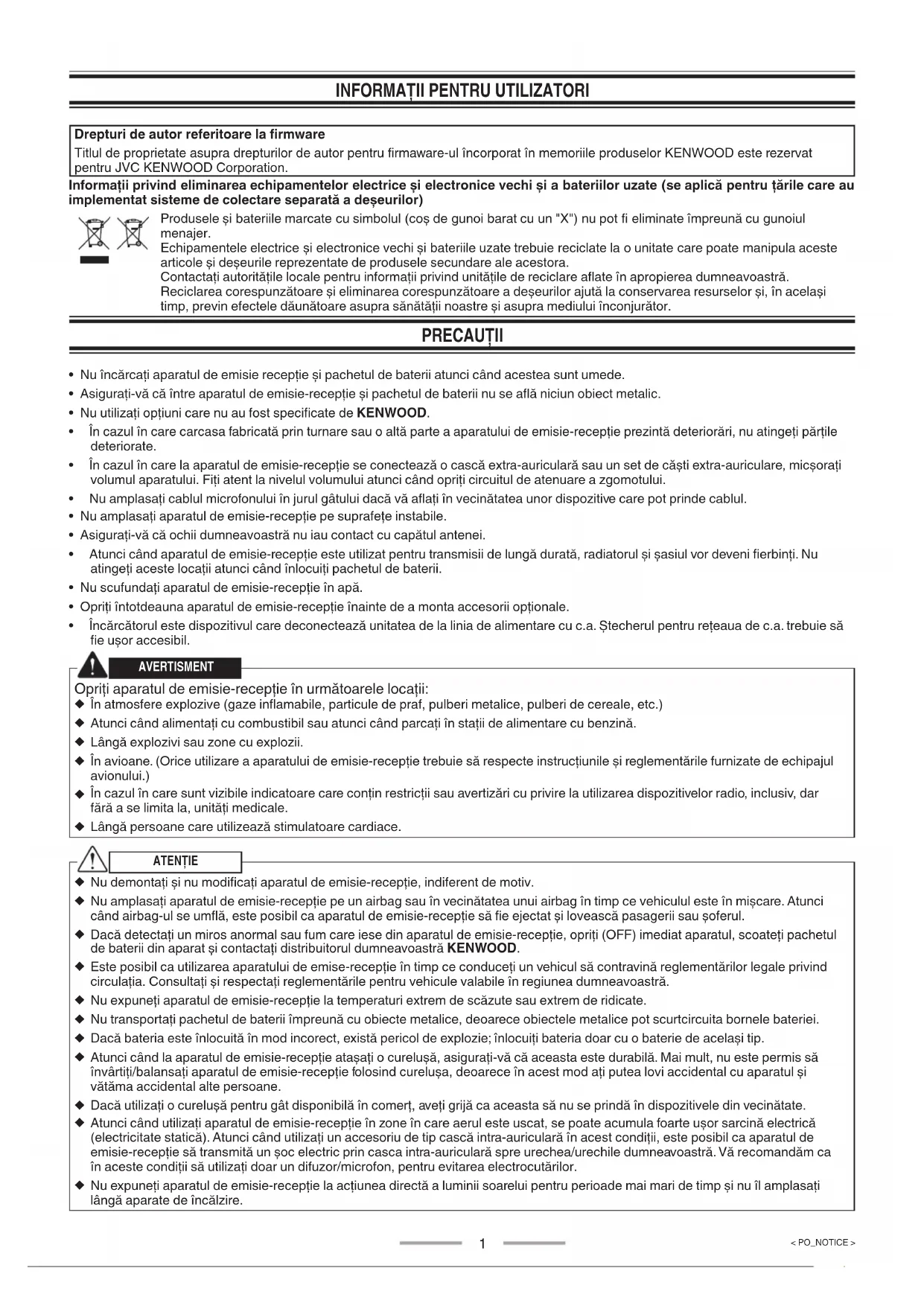 Drepturi de autor referitoare la firmware Titlul de proprietate asupra drepturilor de autor pentru firmaware-ul încorporat în memoriile produselor KENWOOD este rezervat pentru JVC KENWOOD Corporation. Informații privind eliminarea echipamentelor electrice și electronice vechi și a bateriilor uzate (se aplică pentru țările care au implementat sisteme de colectare separată a deșeurilor) Produsele și bateriile marcate cu simbolul (coș de gunoi barat cu un "X") nu pot fi eliminate împreună cu gunoiul menajer. Echipamentele electrice și electronice vechi și bateriile uzate trebuie reciclate la o unitate care poate manipula aceste articole și deșeurile reprezentate de produsele secundare ale acestora. Contactați autoritățile locale pentru informații privind unitățile de reciclare aflate în apropierea dumneavoastră. Reciclarea corespunzătoare și eliminarea corespunzătoare a deșeurilor ajută la conservarea resurselor și, în același timp, previn efectele dăunătoare asupra sănătății noastre și asupra mediului înconjurător. PRECAUȚII