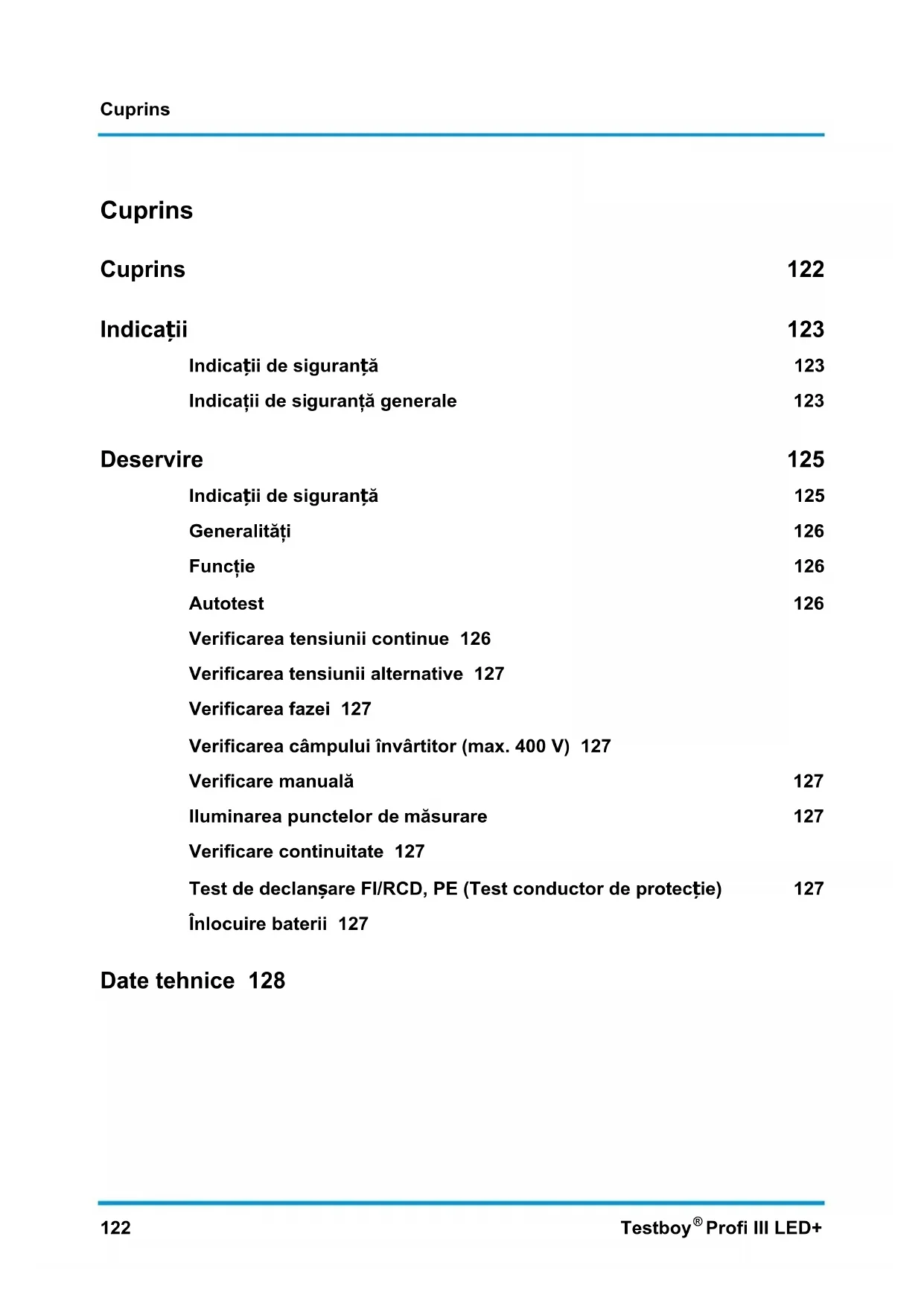 Profi III LED+ Cuprins Cuprins 122 Indicații 123 Indicații de siguranță 123 Indicaţii de siguranţă generale 123 Deservire 125 Indicații de siguranță 125 Generalităţi 126 Funcţie 126 Autotest 126 Verificarea tensiunii continue 126 Verificarea tensiunii alternative 127 Verificarea fazei 127 Verificarea câmpului învârtitor (max. 400 V) 127 Verificare manuală 127 Iluminarea punctelor de măsurare 127 Verificare continuitate 127 Test de declanșare FI/RCD, PE (Test conductor de protecție) 127 Înlocuire baterii 127 Date tehnice 128Indicații Testboy