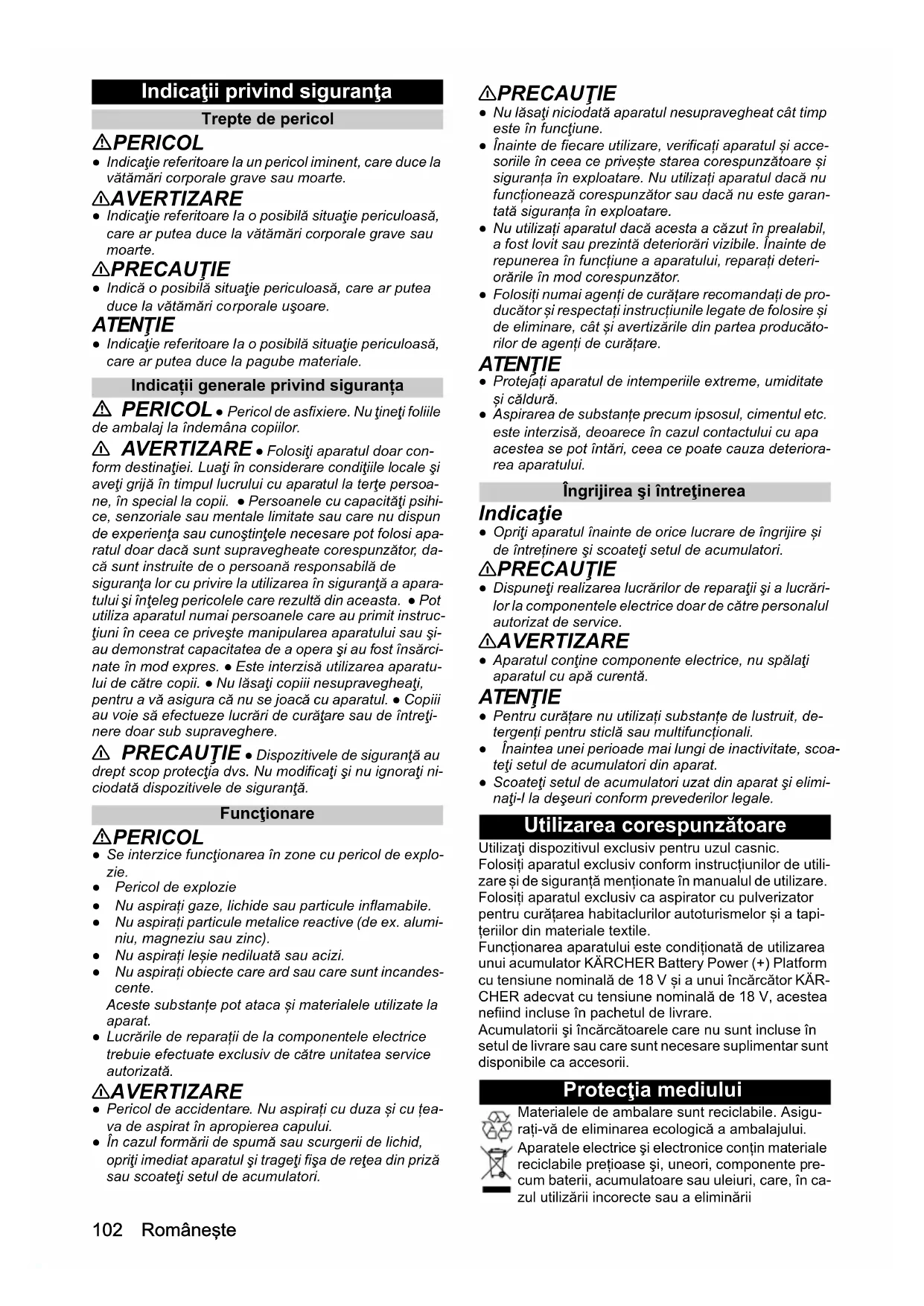 몇 AVERTIZARE ● Folosiţi aparatul doar con- form destinaţiei. Luaţi în considerare condiţiile locale şi aveţi grijă în timpul lucrului cu aparatul la terţe persoa- ne, în special la copii. ● Persoanele cu capacităţi psihi- ce, senzoriale sau mentale limitate sau care nu dispun de experienţa sau cunoştinţele necesare pot folosi apa- ratul doar dacă sunt supravegheate corespunzător, da- că sunt instruite de o persoană responsabilă de siguranţa lor cu privire la utilizarea în siguranţă a apara- tului şi înţeleg pericolele care rezultă din aceasta. ● Pot utiliza aparatul numai persoanele care au primit instruc- ţiuni în ceea ce priveşte manipularea aparatului sau şi- au demonstrat capacitatea de a opera şi au fost însărci- nate în mod expres. ● Este interzisă utilizarea aparatu- lui de către copii. ● Nu lăsaţi copiii nesupravegheaţi, pentru a vă asigura că nu se joacă cu aparatul. ● Copiii au vo ie să efectueze lucrări de curăţare sau de întreţi- nere doar sub supraveghere. 몇 PRECAUŢIE ● Dispozitivele de siguranţă au drept scop protecţia dvs. Nu modificaţi şi nu ignoraţi ni- ciodată dispozitivele de siguranţă. Funcţionare PERICOL ● Se interzice funcţionarea în zone cu pericol de explo- zie. ● Pericol de explozie ● Nu aspirați gaze, lichide sau particule inflamabile. ● Nu aspirați particule metalice reactive (de ex. alumi- niu, magneziu sau zinc). ● Nu aspirați leșie nediluată sau acizi. ● Nu aspirați obiecte care ard sau care sunt incandes- cente. Aceste substanțe pot ataca și materialele utilizate la aparat. ● Lucrările de reparații de la componentele electrice trebuie efectuate exclusiv de către unitatea service autorizată. 몇 AVERTIZARE ● Pericol de accidentare. Nu aspirați cu duza și cu țea- va de aspirat în apropierea capului. ● În cazul formării de spumă sau scurgerii de lichid, opriţi imediat aparatul şi trageţi fişa de reţea din priză sau scoateţi setul de acumulatori. 몇 PRECAUŢIE ● Nu lăsaţi niciodată aparatul nesupravegheat cât timp este în funcţiune. ● Înainte de fiecare utilizare, verificați aparatul și acce- soriile în ceea ce privește starea corespunzătoare și siguranța în exploatare. Nu utilizați aparatul dacă nu funcționează corespunzător sau dacă nu este garan- tată siguranța în exploatare. ● Nu utilizați aparatul dacă acesta a căzut în prealabil, a fost lovit sau prezintă deteriorări vizibile. Înainte de repunerea în funcțiune a aparatului, reparați deteri- orările în mod corespunzător. ● Folosiți numai agenți de curățare recomandați de pro- ducător și respectați instrucțiunile legate de folosire și de eliminare, cât și avertizările din partea producăto- rilor de agenți de curățare. ATENŢIE ● Protejați aparatul de intemperiile extreme, umiditate și căldură. ● Aspirarea de substanțe precum ipsosul, cimentul etc. este interzisă, deoarece în cazul contactului cu apa acestea se pot întări, ceea ce poate cauza deteriora- rea aparatului. Îngrijirea şi întreţinerea Indicaţie ● Opriţi aparatul înainte de orice lucrare de îngrijire și de întreținere şi scoateţi setul de acumulatori. 몇 PRECAUŢIE ● Dispuneţi realizarea lucrărilor de reparaţii şi a lucrări- lor la componentele electrice doar de către personalul autorizat de service. 몇 AVERTIZARE ● Aparatul conţine componente electrice, nu spălaţi aparatul cu apă curentă. ATENŢIE ● Pentru curățare nu utilizați substanțe de lustruit, de- tergenți pentru sticlă sau multifuncționali. ● Înaintea unei perioade mai lungi de inactivitate, scoa- teţi setul de acumulatori din aparat. ● Scoateţi setul de acumulatori uzat din aparat şi elimi- naţi-l la deşeuri conform prevederilor legale. Utilizarea corespunzătoare Utilizaţi dispozitivul exclusiv pentru uzul casnic. Folosiți aparatul exclusiv conform instrucțiunilor de utili- zare și de siguranță menționate în manualul de utilizare. Folosiți aparatul exclusiv ca aspirator cu pulverizator pentru curățarea habitaclurilor autoturismelor și a tapi- țeriilor din materiale textile. Funcționarea aparatului este condiționată de utilizarea unui acumulator KÄRCHER Battery Power (+) Platform cu tensiune nominală de 18 V și a unui încărcător KÄR- CHER adecvat cu tensiune nominală de 18 V, acestea nefiind incluse în pachetul de livrare. Acumulatorii şi încărcătoarele care nu sunt incluse în setul de livrare sau care sunt necesare suplimentar sunt disponibile ca accesorii. Protecţia mediului Materialele de ambalare sunt reciclabile. Asigu- rați-vă de eliminarea ecologică a ambalajului. Aparatele electrice şi electronice conțin materiale reciclabile prețioase şi, uneori, componente pre- cum baterii, acumulatoare sau uleiuri, care, în ca- zul utilizării incorecte sau a eliminăriiRomâneşte 103 necorespunzătoare, pot periclita sănătatea şi mediul în- conjurător. Pentru funcţionarea corectă a aparatului, aceste componente sunt necesare. Este interzisă elimi- narea cu deșeurile menajere a aparatelor marcate cu acest simbol. Observaţii referitoare la materialele conţinute (RE- ACH) Informații actuale referitoare la materialele conținute sunt disponibile la adresa: www.kaercher.de/REACH Serviciul pentru clienţi În caz de întrebări sau defecţiuni, filiala KÄRCHER vă ajută cu plăcere în continuare. Accesorii şi piese de schimb Utilizaţi numai accesorii originale şi piese de schimb ori- ginale; ele asigură funcţionarea în siguranţă şi fără ava- rii a aparatului. Informaţii despre accesorii şi piesele de schimb se gă- sesc la adresa www.kaercher.com. Set de livrare Setul de livrare a aparatului este ilustrat pe ambalaj. La despachetare, verificaţi dacă conţinutul este complet. Informaţi imediat distribuitorul dacă lipsesc accesorii sau dacă există deteriorări provocate în timpul