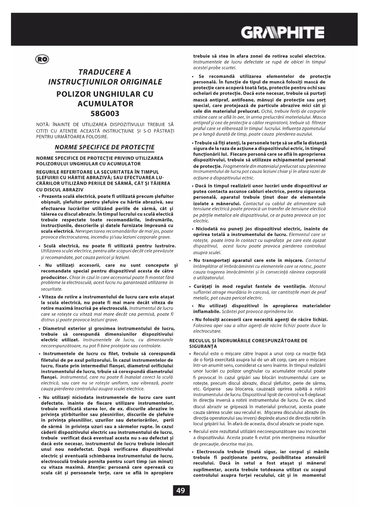 1. Citiți manualul, respectați avertizările și condițiile de siguranță conținute de acestea!.2. Folosiți echipament individual de protecţie (ochelari de protecţie, protecţie pentru urechi).3. Purtați mască antipraf. 4. Nu permiteţi copiilor accesul la instrument. 5. Protejați încărcătorul de umiditate și ploaie.6. Incărcătorul este conceput pentru folosire în spațiu uscat.7. Atenție la elemente ascuțite!8. Folosiți mănuși de protecție. 9. Reciclare.10. A doua clasă de protecţie. 11. Colectarea selectivă.12. Nu aruncaţi celule în foc.13. Reprezintă o amenințare pentru mediul acvatic.14. Temperatura maximă admisă a celulelor 50°C.CONSTRUCȚIA ȘI UTILIZAREPolizorul unghiular este un dispozitiv manual cu alimentare de la acumulator. Unitatea constă într-un motor de curent continuu cu magneți permanenți, a cărui viteză de rotație este transmisă prin intermediul angrenajului unghiular . Polizorul unghiular poate fi folosit, atât pentru tăierea cât şi pentru şlefuire. Acest tip de dispozitiv este utilizat pentru domeniu larg de aplicare, precum, eimnarea tuturor tipurilor de bavuri de pe suprafețele metalice, prelucrarea suprafețelor după sudura, tăierea țevilor cu pereți subțiri și pieselor din metal, etc Aplicând accesorii corespunzătoare, polizorul unghiular poate fi utilizat nu numai pentru tăiere și lustruire, dar şi la curățat, de exemplu, pentru îndepărtarea ruginei, vopselei, etcDomeniileul de utilizare a polizorului unghiular au un înțeles foarte larg. Polizorul unghiular poate fi de asemenea folosit pentru tăierea și şlefuirea materialelor constructii precum cărămidă, piatra de pavaj, plăci ceramice, etc. Uispozitivul este destinat exclusiv pentru lucru la uscat. Nu folosiți sculele electrice în dezacord cu destinţia lor.Utilizarea în dezacord cu destinţia sculei electrice.