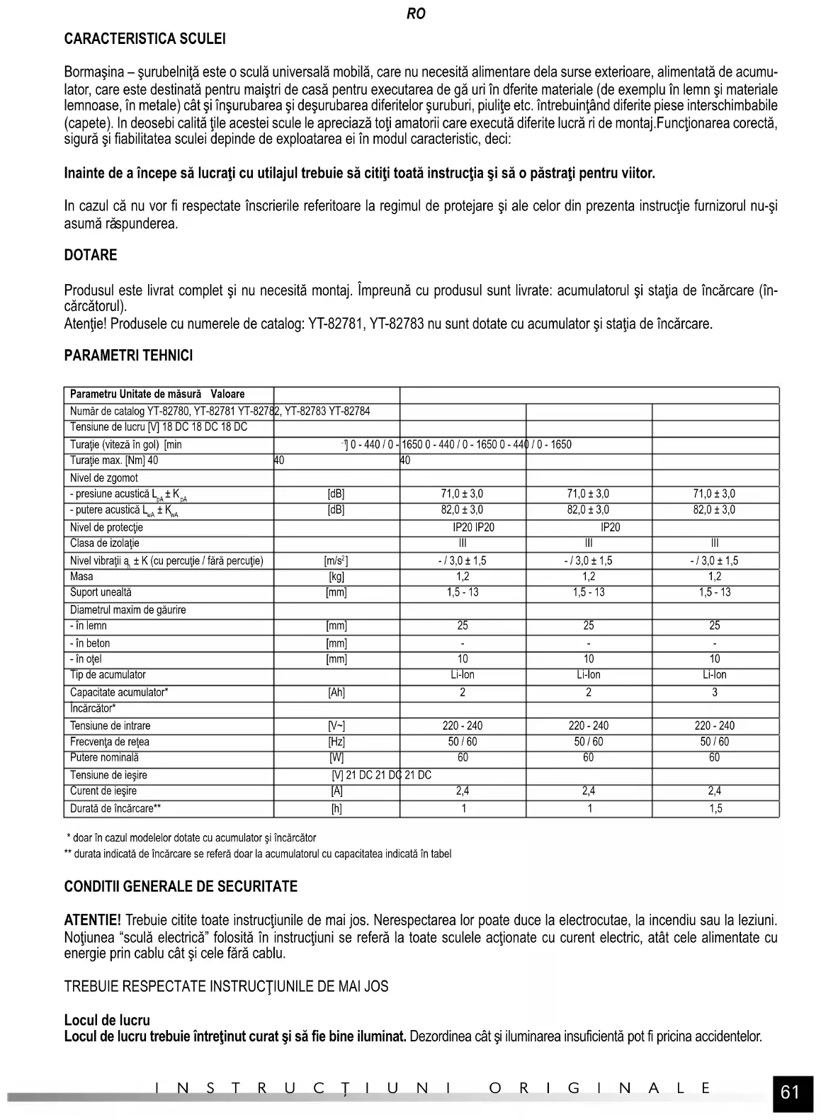CARACTERISTICA SCULEI Bormaşina – şurubelniţă este o sculă universală mobilă, care nu necesită alimentare dela surse exterioare, alimentată de acumu- lator, care este destinată pentru maiştri de casă pentru executarea de gă uri în dferite materiale (de exemplu în lemn şi materiale lemnoase, în metale) cât şi înşurubarea şi deşurubarea diferitelor şuruburi, piuliţe etc. întrebuinţând diferite piese interschimbabile (capete). In deosebi calită ţile acestei scule le apreciază toţi amatorii care execută diferite lucră ri de montaj.Funcţionarea corectă, sigură şi fiabilitatea sculei depinde de exploatarea ei în modul caracteristic, deci: Inainte de a începe să lucraţi cu utilajul trebuie să citiţi toată instrucţia şi să o păstraţi pentru viitor. In cazul că nu vor fi respectate înscrierile referitoare la regimul de protejare şi ale celor din prezenta instrucţie furnizorul nu-şi asumă ră spunderea. DOTARE Produsul este livrat complet şi nu necesită montaj. Împreună cu produsul sunt livrate: acumulatorul şi staţia de încărcare (în- cărcătorul). Atenţie! Produsele cu numerele de catalog: YT-82781, YT-82783 nu sunt dotate cu acumulator şi staţia de încărcare. PARAMETRI TEHNICI Parametru Unitate de măsură Valoare Număr de catalog YT-82780, YT-82781 YT-82782, YT-82783 YT-82784 Tensiune de lucru [V] 18 DC 18 DC 18 DC Turaţie (viteză în gol) [min