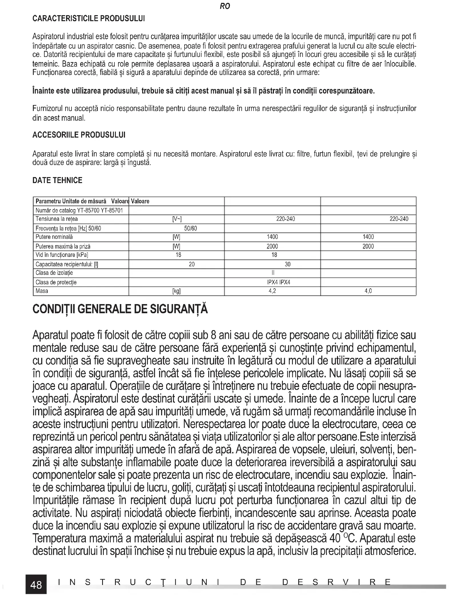 CARACTERISTICILE PRODUSULUI Aspiratorul industrial este folosit pentru curățarea impurităților uscate sau umede de la locurile de muncă, impurități care nu pot fi îndepărtate cu un aspirator casnic. De asemenea, poate fi folosit pentru extragerea prafului generat la lucrul cu alte scule electri- ce. Datorită recipientului de mare capacitate și furtunului fl exibil, este posibil să ajungeți în locuri greu accesibile și să le curățați temeinic. Baza echipată cu role permite deplasarea ușoară a aspiratorului. Aspiratorul este echipat cu fi ltre de aer înlocuibile. Funcționarea corectă, fi abilă și sigură a aparatului depinde de utilizarea sa corectă, prin urmare: Înainte este utilizarea produsului, trebuie să citiți acest manual și să îl păstrați în condiții corespunzătoare. Furnizorul nu acceptă nicio responsabilitate pentru daune rezultate în urma nerespectării regulilor de siguranță și instrucțiunilor din acest manual. ACCESORIILE PRODUSULUI Aparatul este livrat în stare completă și nu necesită montare. Aspiratorul este livrat cu: fi ltre, furtun fl exibil, țevi de prelungire și două duze de aspirare: largă și îngustă. DATE TEHNICE Parametru Unitate de măsură Valoare Valoare Număr de catalog YT-85700 YT-85701 Tensiunea la rețea [V~] 220-240 220-240 Frecvența la rețea [Hz] 50/60 50/60 Putere nominală [W] 1400 1400 Puterea maximă la priză [W] 2000 2000 Vid în funcționare [kPa] 18 18 Capacitatea recipientului: [l] 20 30 Clasa de izolație II Clasa de protecție IPX4 IPX4 Masa [kg] 4,2 4,0