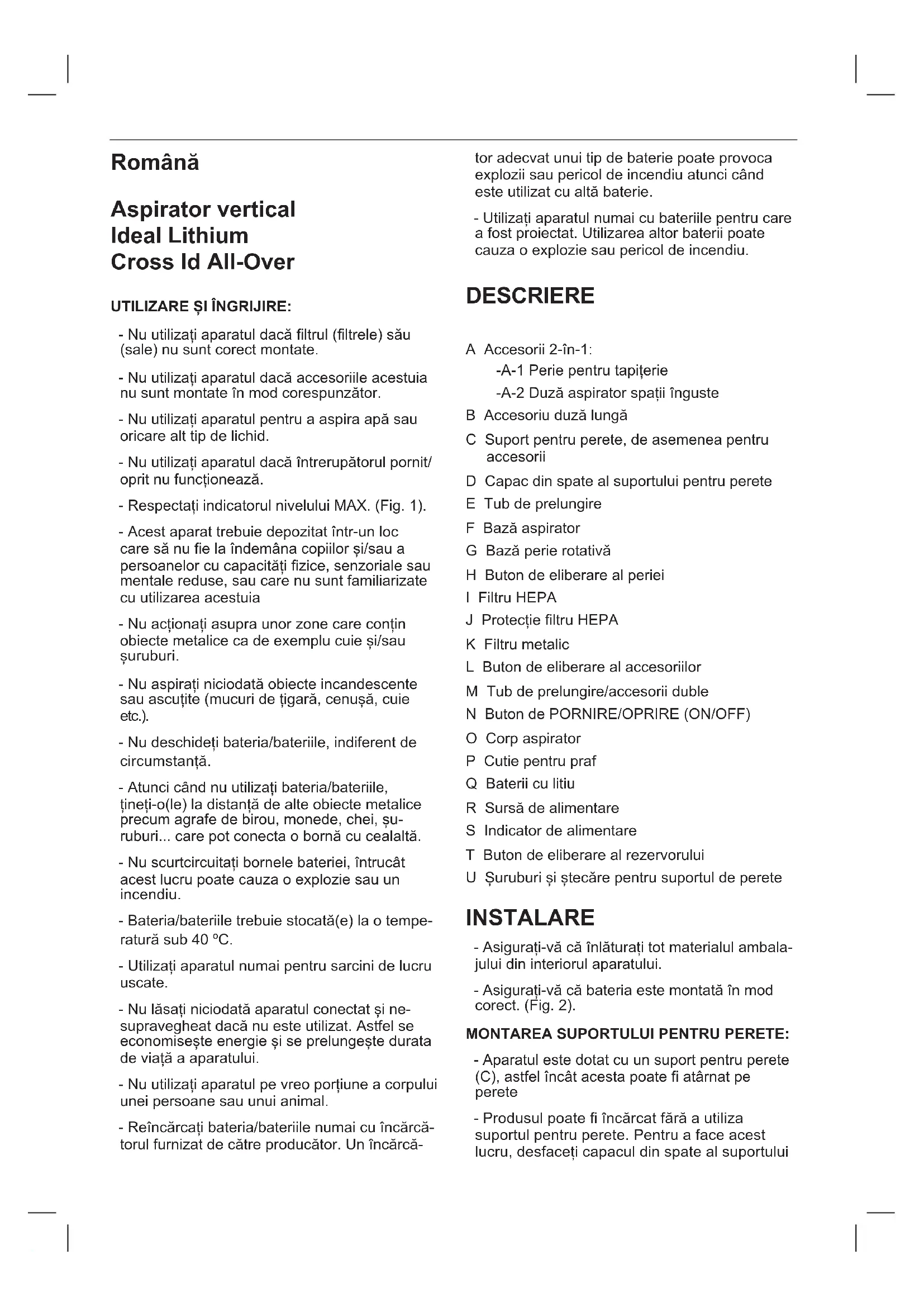 ЧТОБЫ ИЗВЛЕЧЬ АККУМУЛЯТОР ПО ОКОНЧАНИИ РАБОТОСПОСОБНОСТИ ПРИБОРА, СЛЕДУЙТЕ СЛЕДУЮЩЕМУ: - Потяните аккумулятор вверх, чтобы вынуть его из корпуса. (Fig. 11).Română Aspirator vertical Ideal Lithium Cross Id All-Over UTILIZARE ȘI ÎNGRIJIRE: - Nu utilizați aparatul dacă ltrul (ltrele) său (sale) nu sunt corect montate. - Nu utilizați aparatul dacă accesoriile acestuia nu sunt montate în mod corespunzător. - Nu utilizați aparatul pentru a aspira apă sau oricare alt tip de lichid. - Nu utilizați aparatul dacă întrerupătorul pornit/ oprit nu funcționează. - Respectați indicatorul nivelului MAX. (Fig. 1). - Acest aparat trebuie depozitat într-un loc care să nu e la îndemâna copiilor și/sau a persoanelor cu capacități zice, senzoriale sau mentale reduse, sau care nu sunt familiarizate cu utilizarea acestuia - Nu acționați asupra unor zone care conțin obiecte metalice ca de exemplu cuie și/sau șuruburi. - Nu aspirați niciodată obiecte incandescente sau ascuțite (mucuri de țigară, cenușă, cuie etc.). - Nu deschideți bateria/bateriile, indiferent de circumstanță. - Atunci când nu utilizați bateria/bateriile, țineți-o(le) la distanță de alte obiecte metalice precum agrafe de birou, monede, chei, șu- ruburi... care pot conecta o bornă cu cealaltă. - Nu scurtcircuitați bornele bateriei, întrucât acest lucru poate cauza o explozie sau un incendiu. - Bateria/bateriile trebuie stocată(e) la o tempe- ratură sub 40 ºC. - Utilizați aparatul numai pentru sarcini de lucru uscate. - Nu lăsați niciodată aparatul conectat și ne- supravegheat dacă nu este utilizat. Astfel se economisește energie și se prelungește durata de viață a aparatului. - Nu utilizați aparatul pe vreo porțiune a corpului unei persoane sau unui animal. - Reîncărcați bateria/bateriile numai cu încărcă- torul furnizat de către producător. Un încărcă- tor adecvat unui tip de baterie poate provoca explozii sau pericol de incendiu atunci când este utilizat cu altă baterie. - Utilizați aparatul numai cu bateriile pentru care a fost proiectat. Utilizarea altor baterii poate cauza o explozie sau pericol de incendiu. DESCRIERE A Accesorii 2-în-1: -A-1 Perie pentru tapițerie -A-2 Duză aspirator spații înguste B Accesoriu duză lungă C Suport pentru perete, de asemenea pentru accesorii D Capac din spate al suportului pentru perete E Tub de prelungire F Bază aspirator G Bază perie rotativă H Buton de eliberare al periei I Filtru HEPA J Protecție ltru HEPA K Filtru metalic L Buton de eliberare al accesoriilor M Tub de prelungire/accesorii duble N Buton de PORNIRE/OPRIRE (ON/OFF) O Corp aspirator P Cutie pentru praf Q Baterii cu litiu R Sursă de alimentare S Indicator de alimentare T Buton de eliberare al rezervorului U Șuruburi și ștecăre pentru suportul de perete INSTALARE - Asigurați-vă că înlăturați tot materialul ambala- jului din interiorul aparatului. - Asigurați-vă că bateria este montată în mod corect. (Fig. 2). MONTAREA SUPORTULUI PENTRU PERETE: - Aparatul este dotat cu un suport pentru perete (C), astfel încât acesta poate atârnat pe perete - Produsul poate încărcat fără a utiliza suportul pentru perete. Pentru a face acest lucru, desfaceți capacul din spate al suportuluipentru perete (D) și extrageți cablul încărcă- torului, care poate conectat direct în corpul aspiratorului. - Fixați suportul pentru perete după cum con- siderați că este adecvat, utilizând ștecăre de perete, șuruburi, adeziv… - Asigurați-vă că suportul este bine xat, acesta trebuie să poată suporta dublul greutății apa- ratului. - Fixați aparatul în suportul pentru perete.