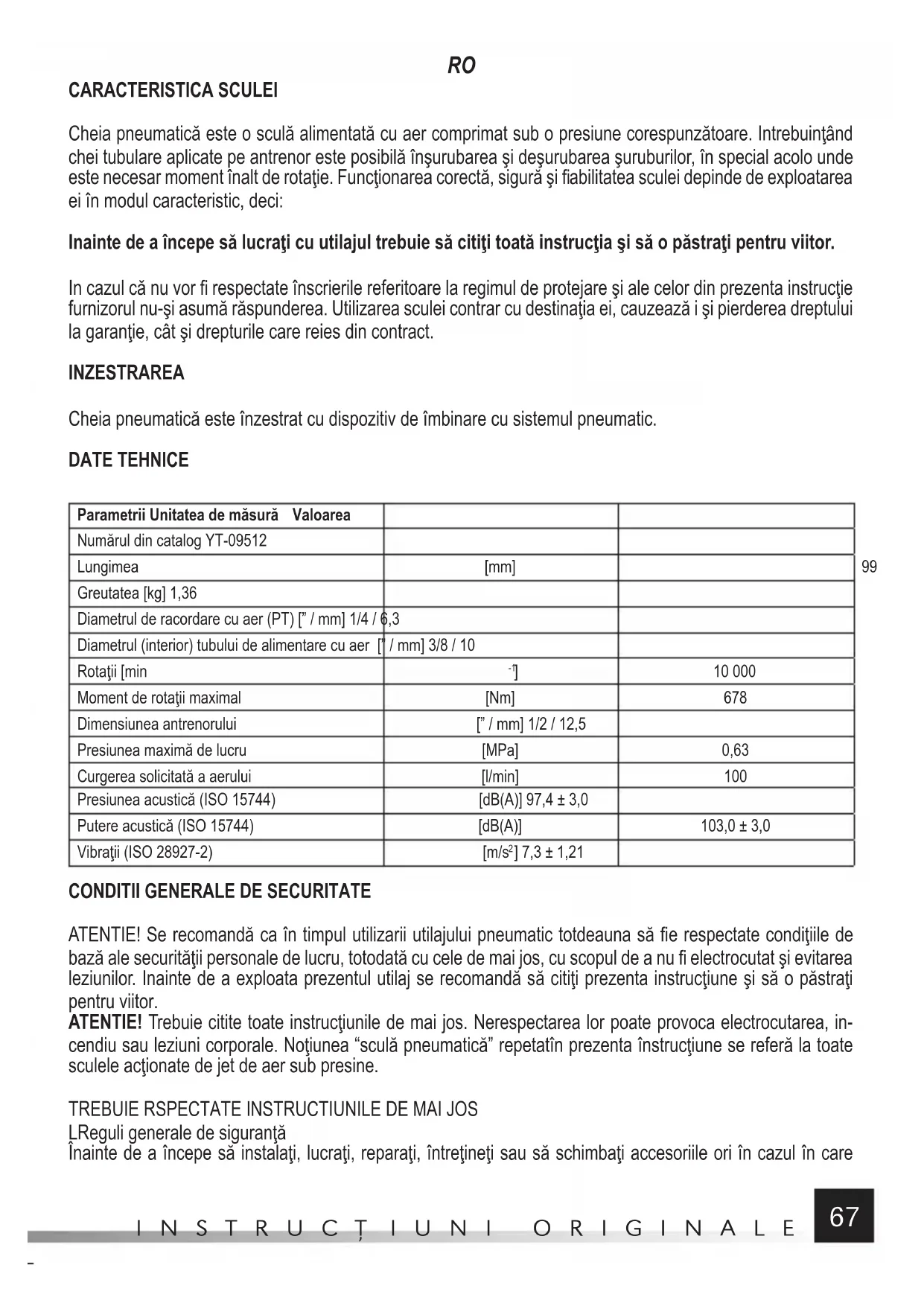 CARACTERISTICA SCULEI Cheia pneumatică este o sculă alimentată cu aer comprimat sub o presiune corespunzătoare. Intrebuinţând chei tubulare aplicate pe antrenor este posibilă înşurubarea şi deşurubarea şuruburilor, în special acolo unde este necesar moment înalt de rotaţie. Funcţionarea corectă, sigură şi fi abilitatea sculei depinde de exploatarea ei în modul caracteristic, deci: Inainte de a începe să lucraţi cu utilajul trebuie să citiţi toată instrucţia şi să o păstraţi pentru viitor. In cazul că nu vor fi respectate înscrierile referitoare la regimul de protejare şi ale celor din prezenta instrucţie furnizorul nu-şi asumă răspunderea. Utilizarea sculei contrar cu destinaţia ei, cauzează i şi pierderea dreptului la garanţie, cât şi drepturile care reies din contract. INZESTRAREA Cheia pneumatică este înzestrat cu dispozitiv de îmbinare cu sistemul pneumatic. DATE TEHNICE Parametrii Unitatea de măsură Valoarea Numărul din catalog YT-09512 Lungimea [mm] 99 Greutatea [kg] 1,36 Diametrul de racordare cu aer (PT) [” / mm] 1/4 / 6,3 Diametrul (interior) tubului de alimentare cu aer [” / mm] 3/8 / 10 Rotaţii [min