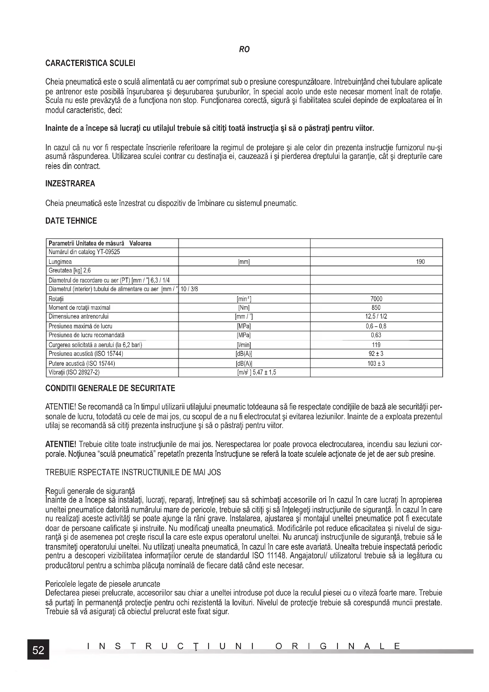CARACTERISTICA SCULEI Cheia pneumatică este o sculă alimentată cu aer comprimat sub o presiune corespunzătoare. Intrebuinţând chei tubulare aplicate pe antrenor este posibilă înşurubarea şi deşurubarea şuruburilor, în special acolo unde este necesar moment înalt de rotaţie. Scula nu este prevăzytă de a funcţiona non stop. Funcţionarea corectă, sigură şi fi abilitatea sculei depinde de exploatarea ei în modul caracteristic, deci: Inainte de a începe să lucraţi cu utilajul trebuie să citiţi toată instrucţia şi să o păstraţi pentru viitor. In cazul că nu vor fi respectate înscrierile referitoare la regimul de protejare şi ale celor din prezenta instrucţie furnizorul nu-şi asumă răspunderea. Utilizarea sculei contrar cu destinaţia ei, cauzează i şi pierderea dreptului la garanţie, cât şi drepturile care reies din contract. INZESTRAREA Cheia pneumatică este înzestrat cu dispozitiv de îmbinare cu sistemul pneumatic. DATE TEHNICE Parametrii Unitatea de măsură Valoarea Numărul din catalog YT-09525 Lungimea [mm] 190 Greutatea [kg] 2,6 Diametrul de racordare cu aer (PT) [mm / ”] 6,3 / 1/4 Diametrul (interior) tubului de alimentare cu aer [mm / ”] 10 / 3/8 Rotaţii [min