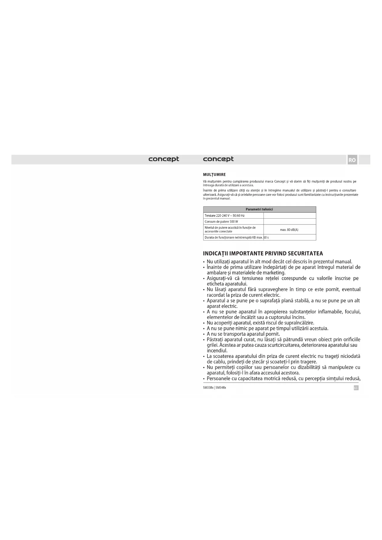 SM338x | SM348x MULȚUMIRE Vă mulțumim pentru cumpărarea produsului marca Concept și vă dorim să fiți mulțumiți de produsul nostru pe întreaga durată de utilizare a acestuia. Înainte de prima utilizare citiți cu atenție și în întregime manualul de utilizare și păstrați-l pentru o consultare ulterioară. Asigurați-vă că și celelalte persoane care vor folosi produsul sunt familiarizate cu instrucțiunile prezentate în prezentul manual. Parametri tehnici Tensiune 220-240 V ~ 50/60 Hz Consum de putere 500 W Nivelul de putere acustică în funcție de accesoriile conectate max. 80 dB(A) Durata de funcționare neîntreruptă KB max. 60 s