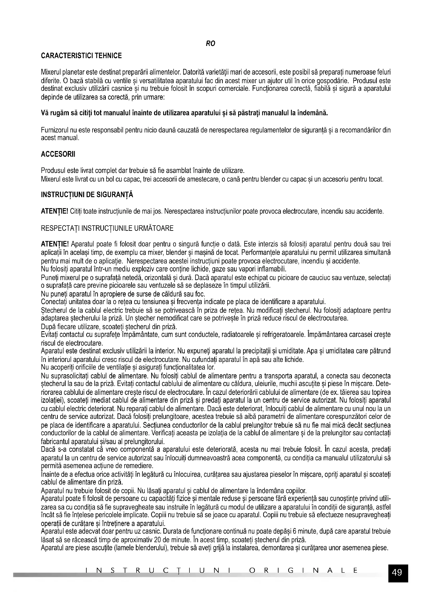 ATEN ȚIE! Aparatul poate fi folosit doar pentru o singură funcție o dată. Este interzis să folosiți aparatul pentru două sau trei aplicații în același timp, de exemplu ca mixer, blender și mașină de tocat. Performanțele aparatului nu permit utilizarea simultană pentru mai mult de o aplicație. Nerespectarea acestei instrucțiuni poate provoca electrocutare, incendiu și accidente. Nu folosiți aparatul într-un mediu exploziv care conține lichide, gaze sau vapori inflamabili. Puneți mixerul pe o suprafață netedă, orizontală și dură. Dacă aparatul este echipat cu picioare de cauciuc sau ventuze, selectați o suprafață care previne picioarele sau ventuzele să se deplaseze în timpul utilizării. Nu puneți aparatul în apropiere de surse de căldură sau foc. Conectați unitatea doar la o rețea cu tensiunea și frecvența indicate pe placa de identificare a aparatului. Ștecherul de la cablul electric trebuie să se potrivească în priza de rețea. Nu modificați ștecherul. Nu folosiți adaptoare pentru adaptarea ștecherului la priză. Un ștecher nemodificat care se potrivește în priză reduce riscul de electrocutarea. După fiecare utilizare, scoateți ștecherul din priză. Evitați contactul cu suprafețe împământate, cum sunt conductele, radiatoarele și refrigeratoarele. Împământarea carcasei crește riscul de electrocutare. Aparatul este destinat exclusiv utilizării la interior. Nu expuneți aparatul la precipitații și umiditate. Apa și umiditatea care pătrund în interiorul aparatului cresc riscul de electrocutare. Nu cufundați aparatul în apă sau alte lichide. Nu acoperiți orificiile de ventilație și asigurați funcționalitatea lor. Nu suprasolicitați cablul de alimentare. Nu folosiți cablul de alimentare pentru a transporta aparatul, a conecta sau deconecta ștecherul la sau de la priză. Evitați contactul cablului de alimentare cu căldura, uleiurile, muchii ascuțite și piese în mișcare. Dete- riorarea cablului de alimentare crește riscul de electrocutare. În cazul deteriorării cablului de alimentare (de ex. tăierea sau topirea izolației), scoateți imediat cablul de alimentare din priză și predați aparatul la un centru de service autorizat. Nu folosiți aparatul cu cablul electric deteriorat. Nu reparați cablul de alimentare. Dacă este deteriorat, înlocuiți cablul de alimentare cu unul nou la un centru de service autorizat. Dacă folosiți prelungitoare, acestea trebuie să aibă parametrii de alimentare corespunzători celor de pe placa de identificare a aparatului. Secțiunea conductorilor de la cablul prelungitor trebuie să nu fie mai mică decât secțiunea conductorilor de la cablul de alimentare. Verificați aceasta pe izolația de la cablul de alimentare și de la prelungitor sau contactați fabricantul aparatului și/sau al prelungitorului. Dacă s-a constatat că vreo componentă a aparatului este deteriorată, acesta nu mai trebuie folosit. În cazul acesta, predați aparatul la un centru de service autorizat sau înlocuiți dumneavoastră acea componentă, cu condiția ca manualul utilizatorului să permită asemenea acțiune de remediere. Înainte de a efectua orice activități în legătură cu înlocuirea, curățarea sau ajustarea pieselor în mișcare, opriți aparatul și scoateți cablul de alimentare din priză. Aparatul nu trebuie folosit de copii. Nu lăsați aparatul și cablul de alimentare la îndemâna copiilor. Aparatul poate fi folosit de persoane cu capacități fizice și mentale reduse și persoane fără experiență sau cunoștințe privind utili- zarea sa cu condiția să fie supravegheate sau instruite în legătură cu modul de utilizare a aparatului în condiții de siguranță, astfel încât să fie înțelese pericolele implicate. Copiii nu trebuie să se joace cu aparatul. Copiii nu trebuie să efectueze nesupravegheați operații de curățare și întreținere a aparatului. Aparatul este adecvat doar pentru uz casnic. Durata de funcționare continuă nu poate depăși 6 minute, după care aparatul trebuie lăsat să se răcească timp de aproximativ 20 de minute. În acest timp, scoateți ștecherul din priză. Aparatul are piese ascuțite (lamele blenderului), trebuie să aveți grijă la instalarea, demontarea și curățarea unor asemenea piese.50