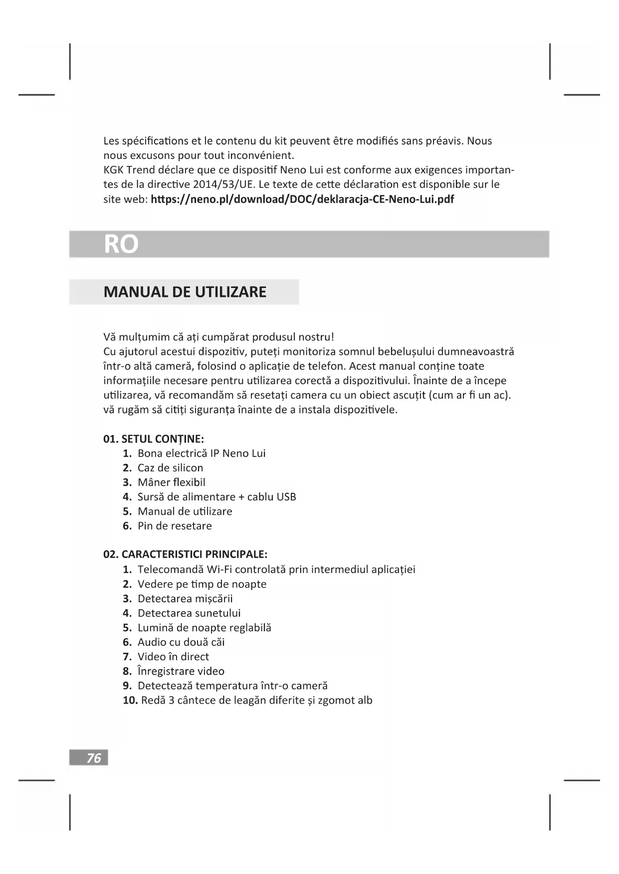 Produsul este acoperit de o garanție de 24 de luni. Termenii garanției pot găsiți la: hps://neno.pl/gwarancja Detalii, adresa de contact și adresa site-ului web pot găsite la: hps://neno.pl/kontakt Specicațiile și conținutul kitului pot modicate fără nocare prealabilă. Ne cerem scuze pentru orice inconvenient. KGK Trend declară că acest dispoziv Neno Lui este în conformitate cu cerințele semnicave ale Direcvei 2014/53/UE. Textul acestei declarații poate găsit pe site-ul web: hps://neno.pl/download/DOC/deklaracja-CE-Neno-Lui.pdfPL