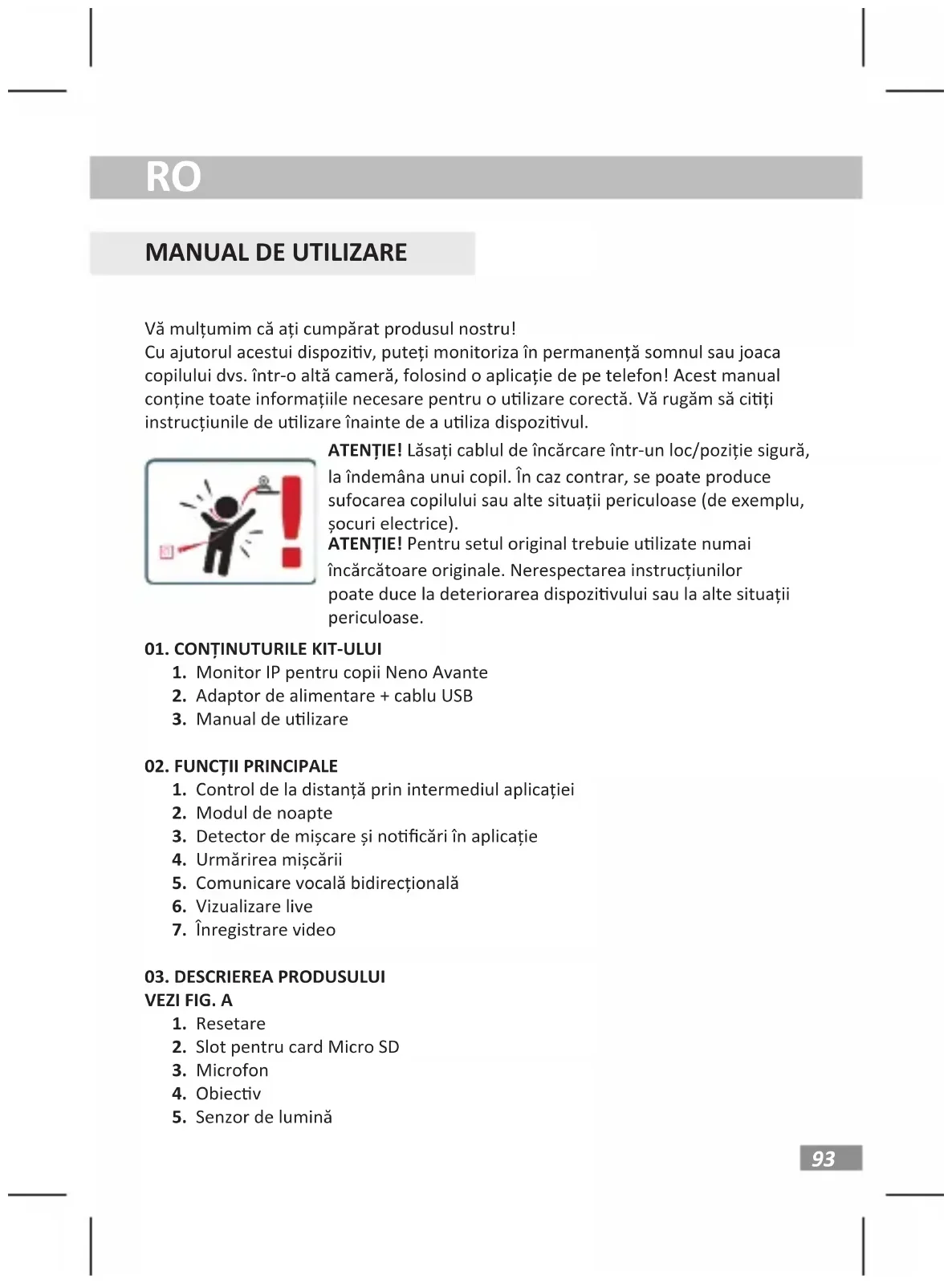 Vă mulțumim că ați cumpărat produsul nostru! Cu ajutorul acestui dispoziv, puteți monitoriza în permanență somnul sau joaca copilului dvs. într-o altă cameră, folosind o aplicație de pe telefon! Acest manual conține toate informațiile necesare pentru o ulizare corectă. Vă rugăm să ciți instrucțiunile de ulizare înainte de a uliza dispozivul. ATENȚIE! Lăsați cablul de încărcare într-un loc/poziție sigură, la îndemâna unui copil. În caz contrar, se poate produce sufocarea copilului sau alte situații periculoase (de exemplu, șocuri electrice). ATENȚIE! Pentru setul original trebuie ulizate numai încărcătoare originale. Nerespectarea instrucțiunilor poate duce la deteriorarea dispozivului sau la alte situații periculoase.