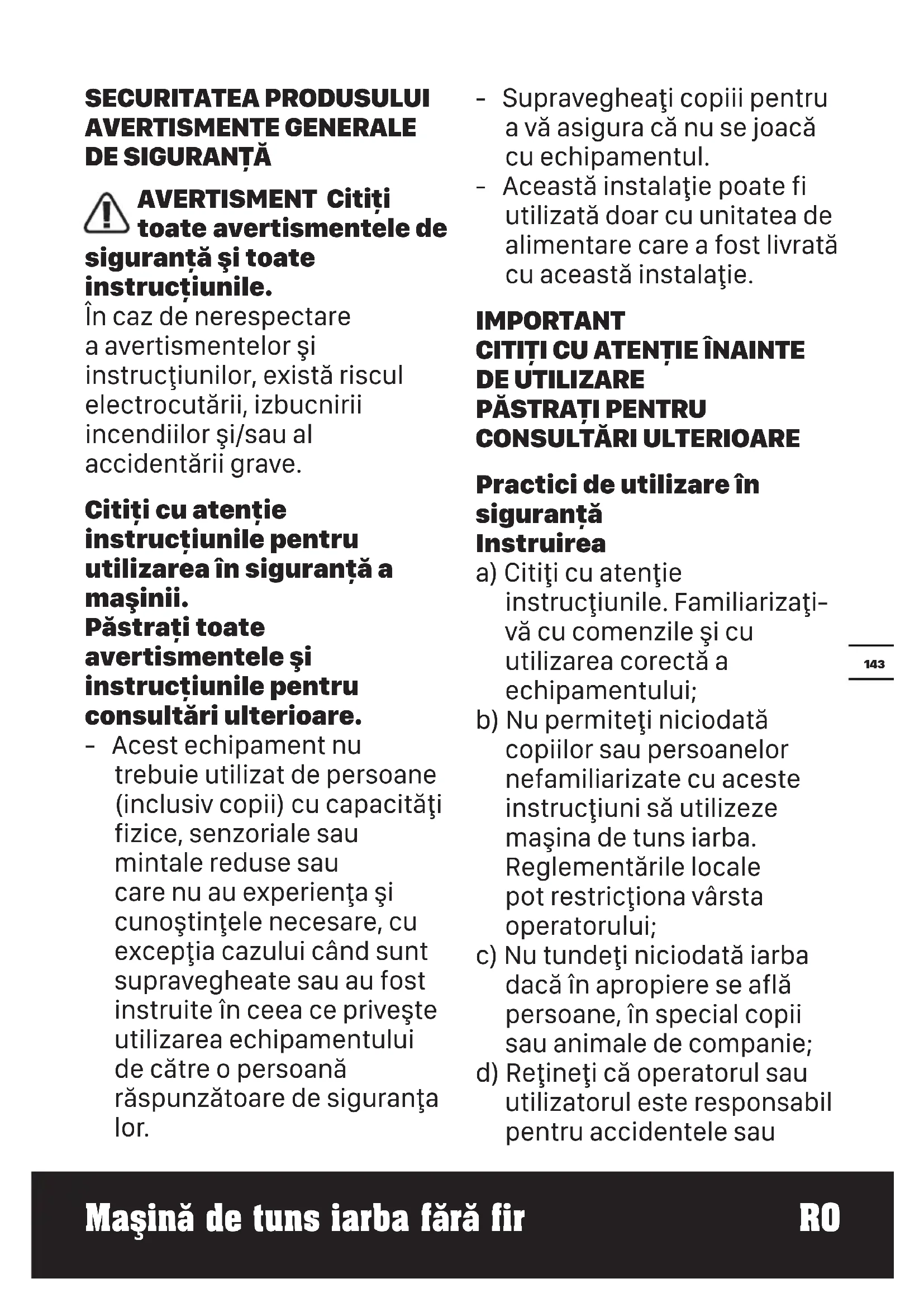 NOTĂ: Înainte de a utiliza unealta, citiţi cu atenţie manualul de instrucţiuni. Destinaţia de utilizare Acest produs este destinat pentru tunderea ierbii în sectorul domestic.