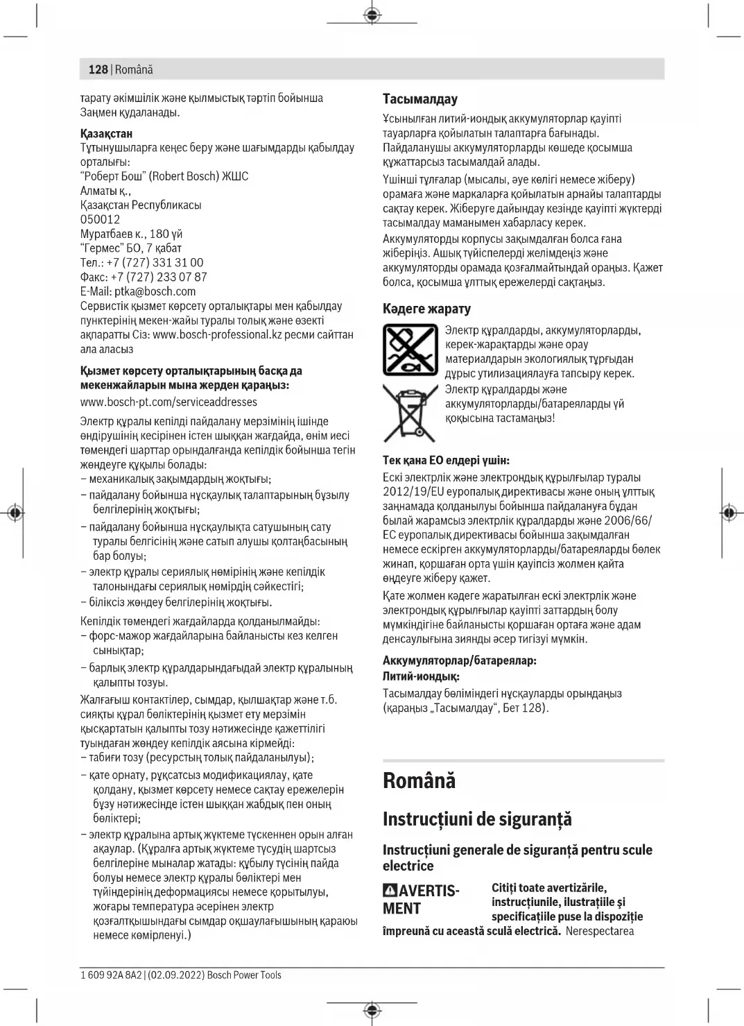 Ұсынылған литий-иондық аккумуляторлар қауіпті тауарларға қойылатын талаптарға бағынады. Пайдаланушы аккумуляторларды көшеде қосымша құжаттарсыз тасымалдай алады. Үшінші тұлғалар (мысалы, әуе көлігі немесе жіберу) орамаға және маркаларға қойылатын арнайы талаптарды сақтау керек. Жіберуге дайындау кезінде қауіпті жүктерді тасымалдау маманымен хабарласу керек. Аккумуляторды корпусы зақымдалған болса ғана жіберіңіз. Ашық түйіспелерді желімдеңіз және аккумуляторды орамада қозғалмайтындай ораңыз. Қажет болса, қосымша ұлттық ережелерді сақтаңыз. Кәдеге жарату Электр құралдарды, аккумуляторларды, керек-жарақтарды және орау материалдарын экологиялық тұрғыдан дұрыс утилизациялауға тапсыру керек. Электр құралдарды және аккумуляторларды/батареяларды үй қоқысына тастамаңыз! Тек қана ЕО елдері үшін: Ескі электрлік және электрондық құрылғылар туралы 2012/19/EU еуропалық директивасы және оның ұлттық заңнамада қолданылуы бойынша пайдалануға бұдан былай жарамсыз электрлік құралдарды және 2006/66/ ЕC еуропалық директивасы бойынша зақымдалған немесе ескірген аккумуляторларды/батареяларды бөлек жинап, қоршаған орта үшін қауіпсіз жолмен қайта өңдеуге жіберу қажет. Қате жолмен кәдеге жаратылған ескі электрлік және электрондық құрылғылар қауіпті заттардың болу мүмкіндігіне байланысты қоршаған ортаға және адам денсаулығына зиянды әсер тигізуі мүмкін. Аккумуляторлар/батареялар: Литий-иондық: Тасымалдау бөліміндегі нұсқауларды орындаңыз (қараңыз „Тасымалдау“, Бет128). Română Instrucţiuni de siguranţă Instrucţiuni generale de siguranţă pentru scule electrice AVERTIS- MENT Citiţi toate avertizările, instrucţiunile, ilustraţiile şi specificaţiile puse la dispoziţie împreună cu această sculă electrică. Nerespectarea 1 609 92A 8A2 | (02.09.2022) Bosch Power ToolsRomână | 129 instrucţiunilor menţionate mai jos poate duce la electrocutare, incendiu şi/sau vătămări corporale grave. Păstraţi toate indicaţiile de avertizare şi instrucţiunile în vederea utilizărilor viitoare. Termenul "sculă electrică" folosit în indicaţiile de avertizare se referă la sculele electrice alimentate de la reţea (cu cablu de alimentare) sau la sculele electrice cu acumulator (fără cablu de alimentare). Siguranţa la locul de muncă u Menţineţi‑vă sectorul de lucru curat şi bine iluminat. Dezordinea sau sectoarele de lucru neluminate pot duce la accidente. u Nu lucraţi cu sculele electrice în mediu cu pericol de explozie, în care există lichide, gaze sau pulberi inflamabile. Sculele electrice generează scântei care pot aprinde praful sau vaporii. u Nu permiteţi accesul copiilor şi al spectatorilor în timpul utilizării sculei electrice. Dacă vă este distrasă atenţia puteţi pierde controlul. Siguranţă electrică u Ştecherul sculei electrice trebuie să fie potrivit prizei electrice. Nu modificaţi niciodată ştecherul. Nu folosiţi fişe adaptoare la sculele electrice cu împământare (legate la masă). Ştecherele nemodificate şi prizele corespunzătoare diminuează riscul de electrocutare. u Evitaţi contactul corporal cu suprafeţe împământate sau legate la masă ca ţevi, instalaţii de încălzire, plite şi frigidere. Există un risc crescut de electrocutare atunci când corpul vă este împământat sau legat la masă. u Feriţi sculele electrice de ploaie sau umezeală. Pătrunderea apei într‑o sculă electrică măreşte riscul de electrocutare. u Nu schimbaţi destinaţia cablului. Nu folosiţi niciodată cablul pentru transportarea sau suspendarea sculei electrice ori pentru a trage ştecherul afară din priză. Feriţi cablul de căldură, ulei, muchii ascuţite sau componente aflate în mişcare. Cablurile deteriorate sau încurcate măresc riscul de electrocutare. u Atunci când lucraţi cu o sculă electrică în aer liber, folosiţi numai cabluri prelungitoare adecvate pentru mediul exterior. Folosirea unui cablu prelungitor adecvat pentru mediul exterior diminuează riscul de electrocutare. u Dacă nu poate fi evitată folosirea sculei electrice în mediu umed, folosiţi o alimentare protejată printr-un dispozitiv de curent rezidual (RCD). Utilizarea unui dispozitiv RCD reduce riscul de electrocutare. Siguranţa persoanelor u Fiţi atenţi, aveţi grijă de ceea ce faceţi şi procedaţi raţional atunci când lucraţi cu o sculă electrică. Nu folosiţi scula electrică atunci când sunteţi obosiţi sau vă aflaţi sub influenţa drogurilor, a alcoolului sau a medicamentelor. Un moment de neatenţie în timpul utilizării sculelor electrice poate duce la răniri grave. u Purtaţi echipament personal de protecţie. Purtaţi întoteauna ochelari de protecţie. Purtarea echipamentului personal de protecţie, ca masca pentru p