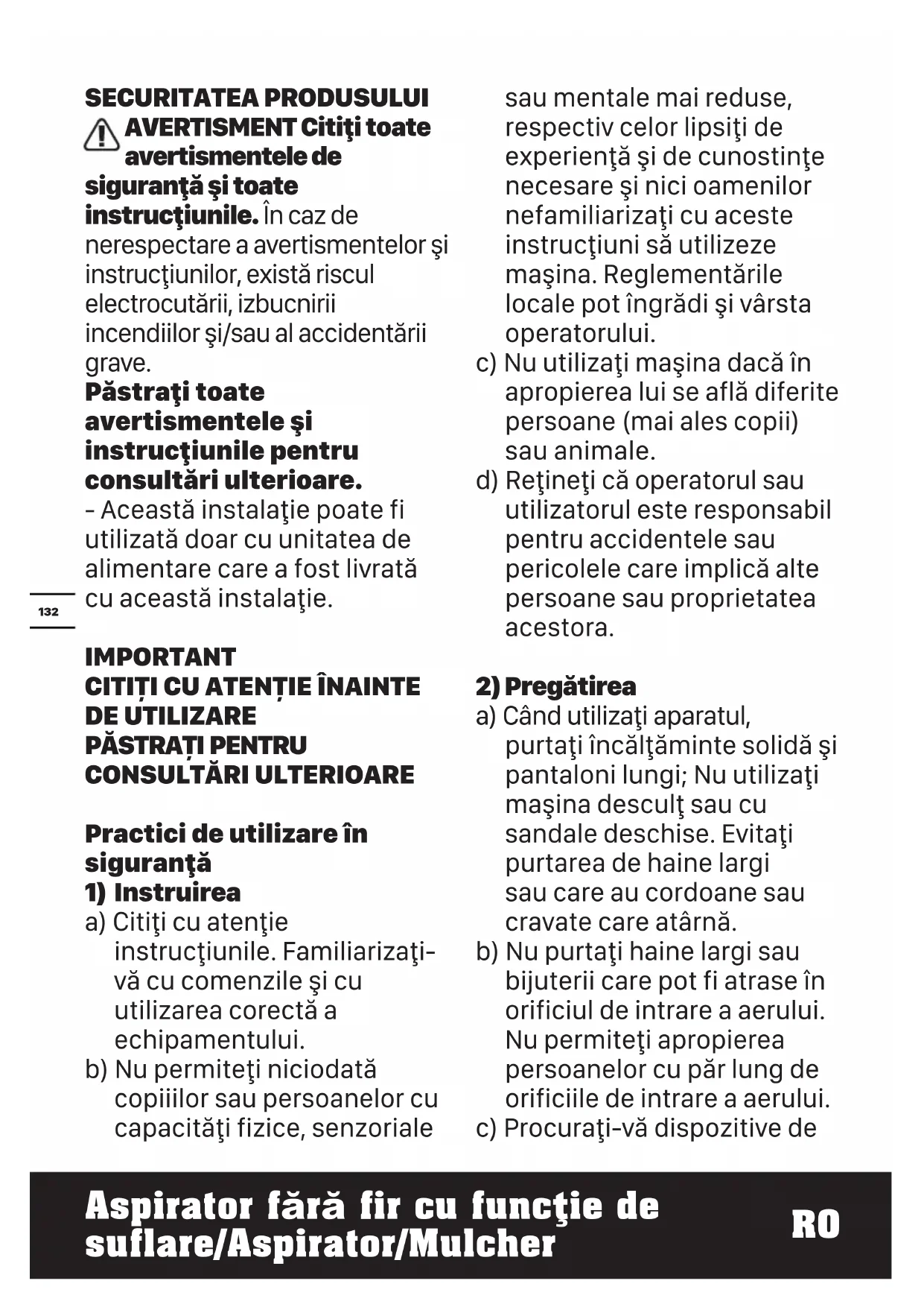Aspirator fĆrĆ fir cu funcĦie de suflare/Aspirator/Mulcher SECURITATEA PRODUSULUI AVERTISMENT Citiţi toate avertismentele de siguranţă şi toate instrucţiunile. În caz de nerespectare a avertismentelor şi instrucţiunilor, există riscul electrocutării, izbucnirii incendiilor şi/sau al accidentării grave. Păstraţi toate avertismentele şi instrucţiunile pentru consultări ulterioare. - Această instalaţie poate fi utilizată doar cu unitatea de alimentare care a fost livrată cu această instalaţie. IMPORTANT