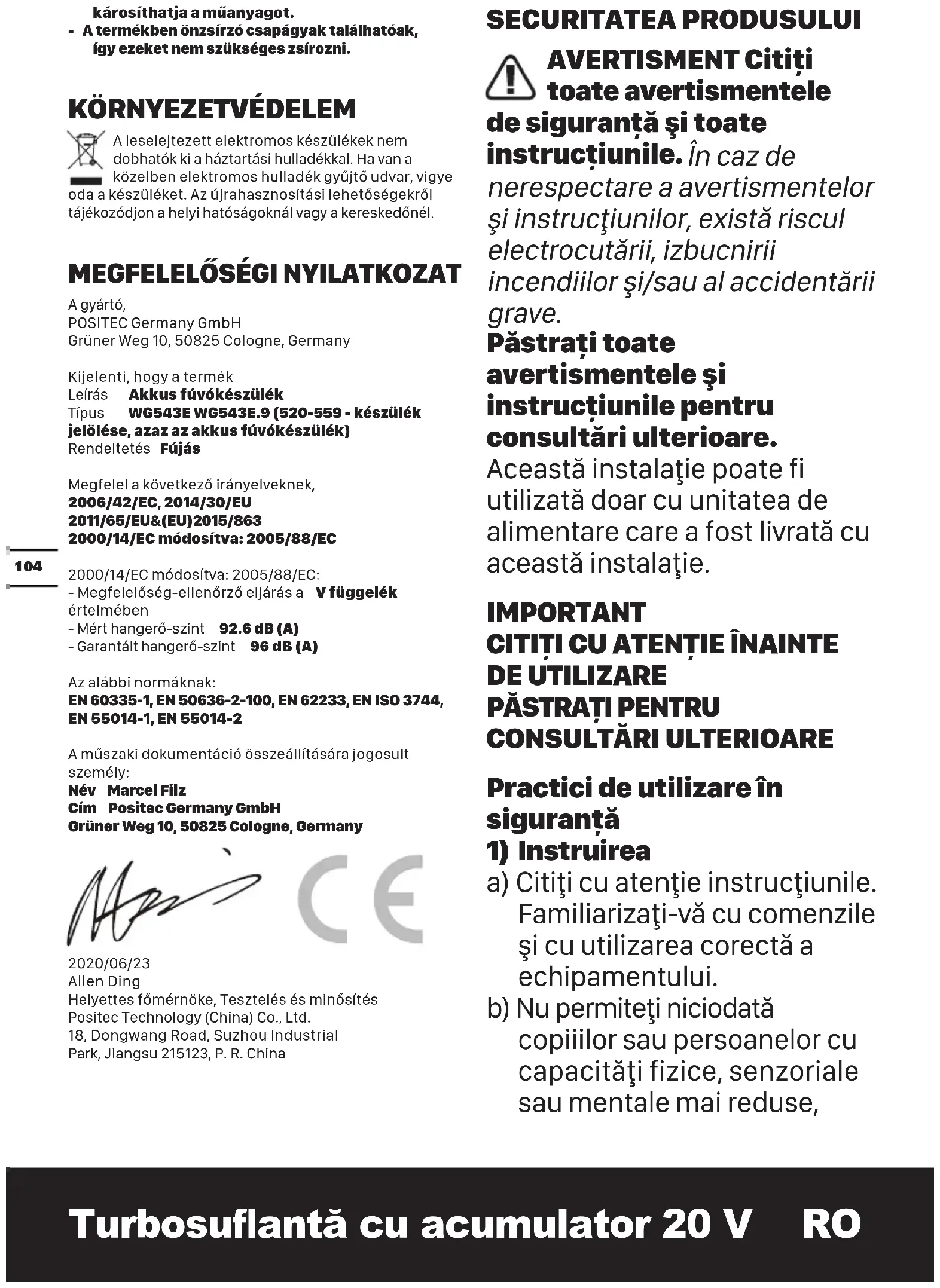 CONFORMITATE Noi, POSITEC Germany GmbH Grüner Weg 10, 50825 Cologne, Germany Declarăm că produsul, Descriere Turbosuflantă cu acumulator Tip WG543E WG543E.9 (520-559 - denumirea echipamentului, respectiv a turbosuflantei cu acumulator) Funcţie Îndepărtarea prin suflare Este conform cu următoarele Directive, 2006/42/EC, 2014/30/EU 2011/65/EU&(EU)2015/863 2000/14/EC modificată prin 2005/88/EC 2000/14/EC modificată prin 2005/88/EC: - Procedură de evaluare a conformităţii conformă cu Anexa V - Nivel de putere sonoră măsurat 92.6 dB (A) - Nivel de putere sonoră garantat declarat 96 dB (A) Standardele sunt conforme cu, EN 60335-1, EN 50636-2-100, EN 62233, EN ISO 3744, EN 55014-1, EN 55014-2 Persoana autorizată să compileze fişierul tehnic, Denumire Marcel Filz Adresă Positec Germany GmbH Grüner Weg 10, 50825 Cologne, Germany 2020/06/23 Allen Ding Adjunct Inginer Şef, Testare si certificare Positec Technology (China) Co., Ltd 18, Dongwang Road, Suzhou Industrial Park, Jiangsu 215123, P. R. China112 20V akumulátorový fukar CZ
