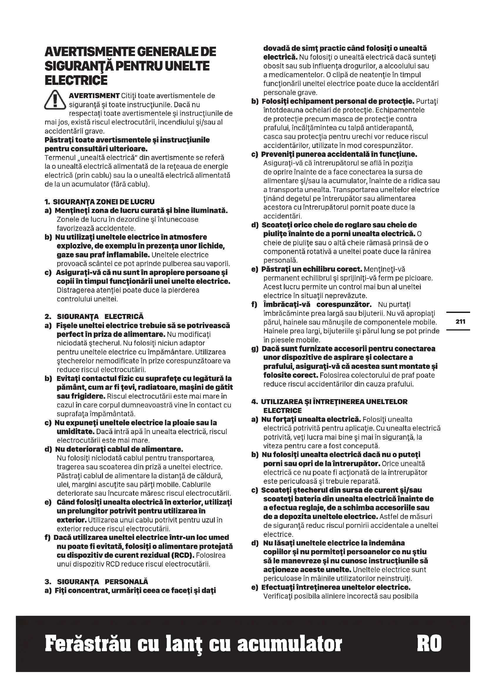 numai pentru acele operaţii pentru care este destinat. Exemplu: nu folosiţi ferăstrăul cu lanţ pentru a tăia material plastic, zidărie sau materiale de construcţii care nu sunt confecţionate din lemn. Utilizarea ferăstrăului cu lanţ pentru executarea operaţiilor neconforme destinaţiei poate duce la situaţii periculoase.213 Ferăstrău cu lanţ cu acumulator RO