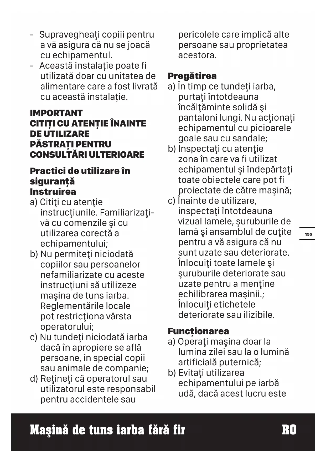 Practici de utilizare în siguranţă Instruirea a) Citiţi cu atenţie instrucţiunile. Familiarizaţi- vă cu comenzile şi cu utilizarea corectă a echipamentului; b) Nu permiteţi niciodată copiilor sau persoanelor nefamiliarizate cu aceste instrucţiuni să utilizeze maşina de tuns iarba. Reglementările locale pot restricţiona vârsta operatorului; c) Nu tundeţi niciodată iarba dacă în apropiere se află persoane, în special copii sau animale de companie; d) Reţineţi că operatorul sau utilizatorul este responsabil pentru accidentele sau pericolele care implică alte persoane sau proprietatea acestora. Pregătirea a) În timp ce tundeţi iarba, purtaţi întotdeauna încălţăminte solidă şi pantaloni lungi. Nu acţionaţi echipamentul cu picioarele goale sau cu sandale; b) Inspectaţi cu atenţie zona în care va fi utilizat echipamentul şi îndepărtaţi toate obiectele care pot fi proiectate de către maşină; c) Înainte de utilizare, inspectaţi întotdeauna vizual lamele, şuruburile de lamă şi ansamblul de cuţite pentru a vă asigura că nu sunt uzate sau deteriorate. Înlocuiţi toate lamele şi şuruburile deteriorate sau uzate pentru a menţine echilibrarea maşinii.; Înlocuiţi etichetele deteriorate sau ilizibile. Funcţionarea a) Operaţi maşina doar la lumina zilei sau la o lumină artificială puternică; b) Evitaţi utilizarea echipamentului pe iarbă udă, dacă acest lucru este156 Maşină de tuns iarba fără fir RO posibil; c) Acordaţi întotdeauna atenţie atunci când vă deplasaţi pe suprafeţe înclinate; d) Mergeţi, nu alergaţi niciodată; e) În cazul maşinilor rotative cu roţi, tundeţi iarba de-a lungul pantei, niciodată în sus sau în jos; f) Acordaţi atenţie maximă când schimbaţi direcţia pe pante; g) Nu tundeţi iarba pe pante excesiv de abrupte; h) Acordaţi atenţie maximă când vă deplasaţi în marşarier sau când trageţi maşina de tuns iarba către dvs.;