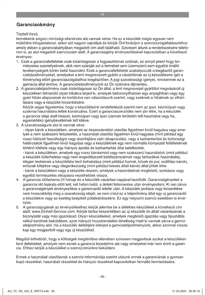 www.Einhell-Service.com. Vă rugăm să aveţi pregătit bonul de cumpărare sau altă dovadă de cumpărare a aparatului dvs. nou. Aparate trimise fără dovadă corespunzătoare sau f ără plăcuţă de identifi care sunt excluse de la prestaţia de garanţie datorită posibilităţilor insufi ciente de alocare. Dacă defectul aparatului este cuprins în prestaţiile noastre de garanţie, veţi primi imediat înapoi aparatul reparat sau un aparat nou. Bineînţeles că remediem cu plăcere contra cost şi defecte la aparate care nu sunt sau nu mai sunt cup- rinse în prestaţiile de garanţie. Pentru aceasta trimiteţi va rugăm aparatul la adresa noastră service: La piesele de uzură, de consum şi piesele lipsă vă informăm în mod expres, că trebuie avute în vedere restricţiile garanţiei menţionate în informaţiile de service ale acestor instrucţiuni de utilizare. Anl_TC_RS_425_E_SPK13.indb 102Anl_TC_RS_425_E_SPK13.indb 102 31.03.2022 08:46:1931.03.2022 08:46:19GR