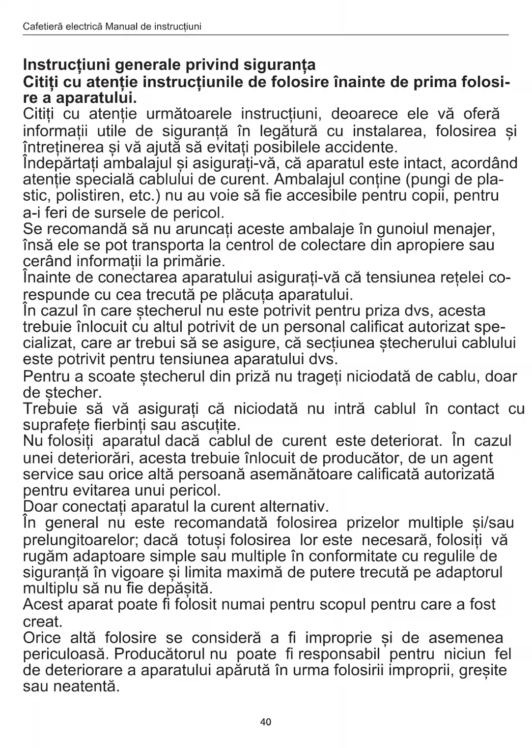 Instrucțiuni generale privind siguranța Citiți cu atenție instrucțiunile de folosire înainte de prima folosi- re a aparatului. Citiți cu atenție următoarele instrucțiuni, deoarece ele vă oferă informații utile de siguranță în legătură cu instalarea, folosirea și întreținerea și vă ajută să evitați posibilele accidente. Îndepărtați ambalajul și asigurați-vă, că aparatul este intact, acordând atenție specială cablului de curent. Ambalajul conține (pungi de pla- stic, polistiren, etc.) nu au voie să e accesibile pentru copii, pentru a-i feri de sursele de pericol. Se recomandă să nu aruncați aceste ambalaje în gunoiul menajer, însă ele se pot transporta la centrol de colectare din apropiere sau cerând informații la primărie. Înainte de conectarea aparatului asigurați-vă că tensiunea rețelei co- respunde cu cea trecută pe plăcuța aparatului. În cazul în care ștecherul nu este potrivit pentru priza dvs, acesta trebuie înlocuit cu altul potrivit de un personal calicat autorizat spe- cializat, care ar trebui să se asigure, că secțiunea ștecherului cablului este potrivit pentru tensiunea aparatului dvs. Pentru a scoate ștecherul din priză nu trageți niciodată de cablu, doar de ștecher. Trebuie să vă asigurați că niciodată nu intră cablul în contact cu suprafețe erbinți sau ascuțite. Nu folosiți aparatul dacă cablul de curent este deteriorat. În cazul unei deteriorări, acesta trebuie înlocuit de producător, de un agent service sau orice altă persoană asemănătoare calicată autorizată pentru evitarea unui pericol. Doar conectați aparatul la curent alternativ. În general nu este recomandată folosirea prizelor multiple și/sau prelungitoarelor; dacă totuși folosirea lor este necesară, folosiți vă rugăm adaptoare simple sau multiple în conformitate cu regulile de siguranță în vigoare și limita maximă de putere trecută pe adaptorul multiplu să nu e depășită. Acest aparat poate folosit numai pentru scopul pentru care a fost creat. Orice altă folosire se consideră a improprie și de asemenea periculoasă. Producătorul nu poate responsabil pentru niciun fel de deteriorare a aparatului apărută în urma folosirii improprii, greșite sau neatentă.Cafetieră electrică Manual de instrucțiuni