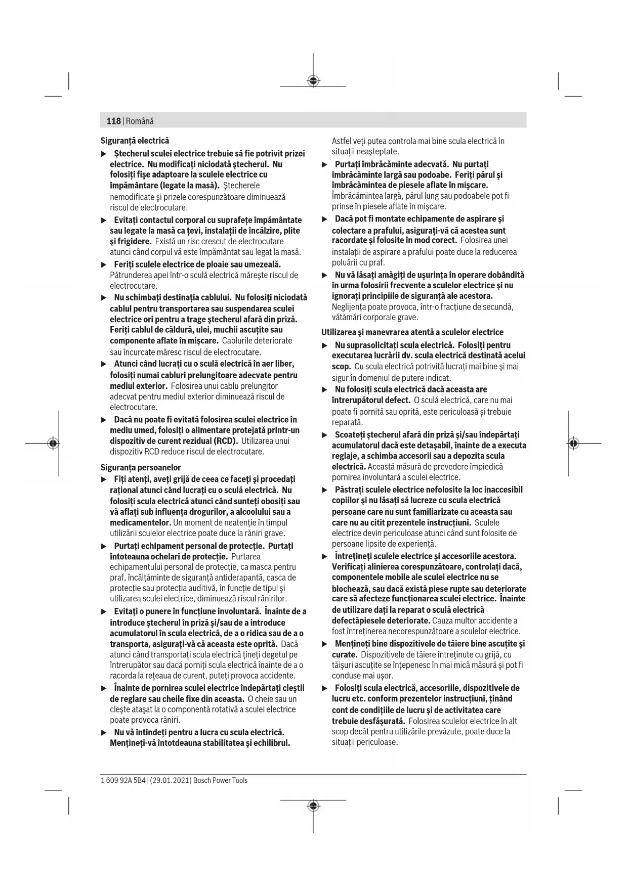 – электр құралына артық жүктеме түскеннен орын алған ақаулар. (Құралға артық жүктеме түсудің шартсыз белгілеріне мыналар жатады: құбылу түсінің пайда болуы немесе электр құралы бөліктері мен түйіндерінің деформациясы немесе қорытылуы, жоғары температура әсерінен электр қозғалтқышындағы сымдар оқшаулағышының қараюы немесе көмірленуі.) Кәдеге жарату Электр құралдар, жабдықтар және бумаларын айналаны қорғайтын кәдеге жаратуға апару қажет. Электр құралдарды үй қоқысына тастамаңыз! Тек қана ЕО елдері үшін: Электр және электрондық ескі құралдар бойынша Еуропа 2012/19/EU ережесі және ұлттық заңдарға сайкес пайдалануға жарамсыз электр құралдары бөлек жиналып, кәдеге жаратылуы қажет. Română Instrucţiuni de siguranţă Instrucţiuni generale de siguranţă pentru scule electrice AVERTIS- MENT Citiţi toate avertizările, instrucţiunile, ilustraţiile şi specificaţiile puse la dispoziţie împreună cu această sculă electrică. Nerespectarea instrucţiunilor menţionate mai jos poate duce la electrocutare, incendiu şi/sau vătămări corporale grave. Păstraţi toate indicaţiile de avertizare şi instrucţiunile în vederea utilizărilor viitoare. Termenul "sculă electrică" folosit în indicaţiile de avertizare se referă la sculele electrice alimentate de la reţea (cu cablu de alimentare) sau la sculele electrice cu acumulator (fără cablu de alimentare). Siguranţa la locul de muncă u Menţineţi‑vă sectorul de lucru curat şi bine iluminat. Dezordinea sau sectoarele de lucru neluminate pot duce la accidente. u Nu lucraţi cu sculele electrice în mediu cu pericol de explozie, în care există lichide, gaze sau pulberi inflamabile. Sculele electrice generează scântei care pot aprinde praful sau vaporii. u Nu permiteţi accesul copiilor şi al spectatorilor în timpul utilizării sculei electrice. Dacă vă este distrasă atenţia puteţi pierde controlul. Bosch Power Tools 1 609 92A 5B4 | (29.01.2021)118 | Română Siguranţă electrică u Ştecherul sculei electrice trebuie să fie potrivit prizei electrice. Nu modificaţi niciodată ştecherul. Nu folosiţi fişe adaptoare la sculele electrice cu împământare (legate la masă). Ştecherele nemodificate şi prizele corespunzătoare diminuează riscul de electrocutare. u Evitaţi contactul corporal cu suprafeţe împământate sau legate la masă ca ţevi, instalaţii de încălzire, plite şi frigidere. Există un risc crescut de electrocutare atunci când corpul vă este împământat sau legat la masă. u Feriţi sculele electrice de ploaie sau umezeală. Pătrunderea apei într‑o sculă electrică măreşte riscul de electrocutare. u Nu schimbaţi destinaţia cablului. Nu folosiţi niciodată cablul pentru transportarea sau suspendarea sculei electrice ori pentru a trage ştecherul afară din priză. Feriţi cablul de căldură, ulei, muchii ascuţite sau componente aflate în mişcare. Cablurile deteriorate sau încurcate măresc riscul de electrocutare. u Atunci când lucraţi cu o sculă electrică în aer liber, folosiţi numai cabluri prelungitoare adecvate pentru mediul exterior. Folosirea unui cablu prelungitor adecvat pentru mediul exterior diminuează riscul de electrocutare. u Dacă nu poate fi evitată folosirea sculei electrice în mediu umed, folosiţi o alimentare protejată printr-un dispozitiv de curent rezidual (RCD). Utilizarea unui dispozitiv RCD reduce riscul de electrocutare. Siguranţa persoanelor u Fiţi atenţi, aveţi grijă de ceea ce faceţi şi procedaţi raţional atunci când lucraţi cu o sculă electrică. Nu folosiţi scula electrică atunci când sunteţi obosiţi sau vă aflaţi sub influenţa drogurilor, a alcoolului sau a medicamentelor. Un moment de neatenţie în timpul utilizării sculelor electrice poate duce la răniri grave. u Purtaţi echipament personal de protecţie. Purtaţi întoteauna ochelari de protecţie. Purtarea echipamentului personal de protecţie, ca masca pentru praf, încălţăminte de siguranţă antiderapantă, casca de protecţie sau protecţia auditivă, în funcţie de tipul şi utilizarea sculei electrice, diminuează riscul rănirilor. u Evitaţi o punere în funcţiune involuntară. Înainte de a introduce ştecherul în priză şi/sau de a introduce acumulatorul în scula electrică, de a o ridica sau de a o transporta, asiguraţi‑vă că aceasta este oprită. Dacă atunci când transportaţi scula electrică ţineţi degetul pe întrerupător sau dacă porniţi scula electrică înainte de a o racorda la reţeaua de curent, puteţi provoca accidente. u Înainte de pornirea sculei electrice îndepărtaţi cleştii de reglare sau cheile fixe din aceasta. O cheie sau un cleşte ataşat la o componentă rotativă a sculei electrice poate provoca răniri. u Nu vă întindeţi pentru a lucra cu scula electrică. Menţineţi-vă întotdeauna stabilitatea şi echilibrul. Astfel veţi putea controla mai bine scula electrică în situaţii neaşteptate. u Purtaţi îmbrăcăminte adecvată. Nu purtaţi îmbrăcăminte largă sau podoabe. Feriţi părul şi îmbrăcămintea de piesele aflate în mişcare. Îmbrăcămintea largă, părul lung sau podoabele pot fi prinse în piesele aflate în mişcare. u Dacă pot fi montate echipamente de aspirare şi colectare a prafului, asiguraţi‑vă că acestea sunt racordate şi folosite în mod corect. Folosirea unei instalaţii de aspirare a praful