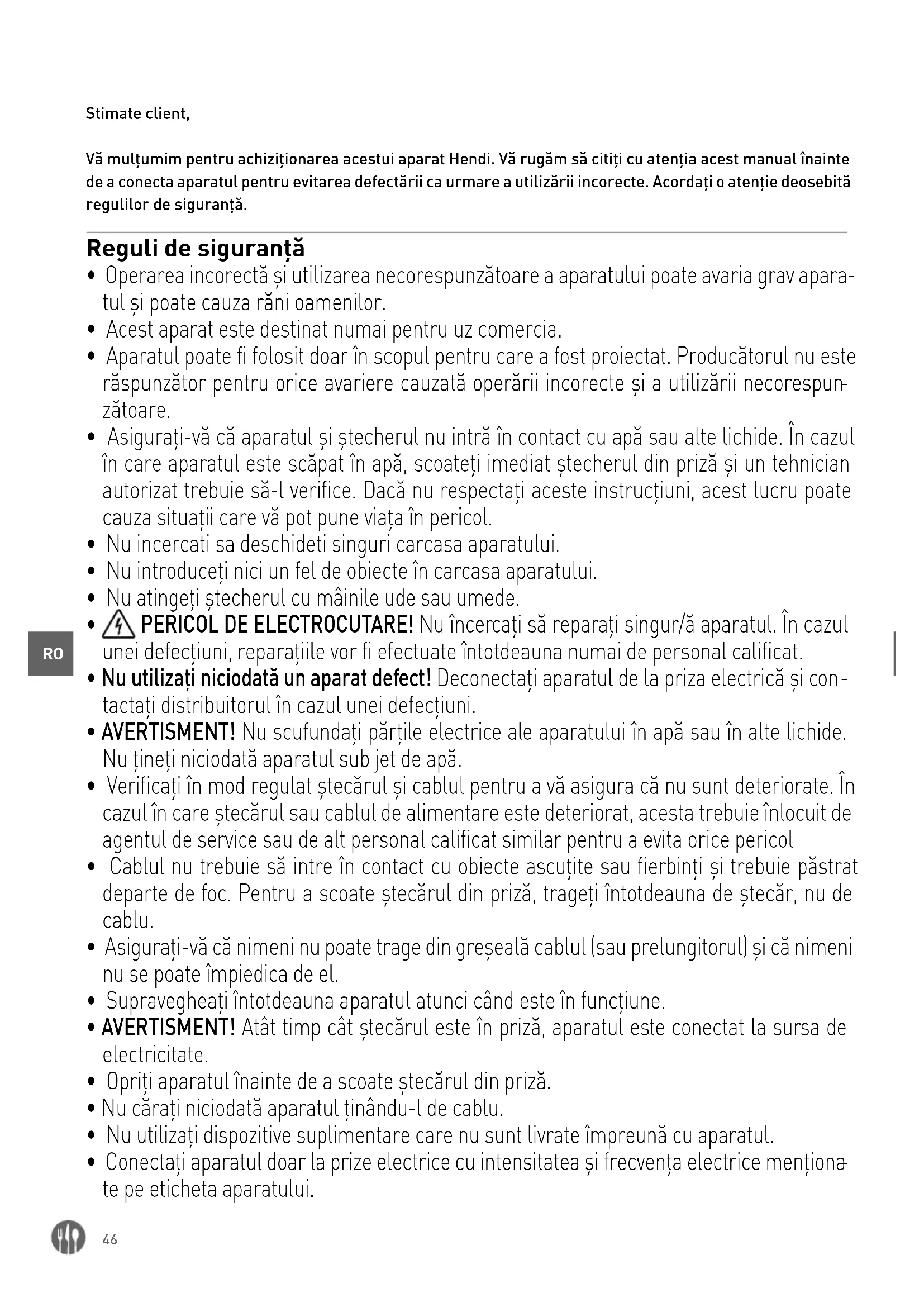 Stimate client, Vă mulțumim pentru achiziționarea acestui aparat Hendi. Vă rugăm să citiți cu atenția acest manual înainte de a conecta aparatul pentru evitarea defectării ca urmare a utilizării incorecte. Acordați o atenție deosebită regulilor de siguranță. Reguli de siguranță