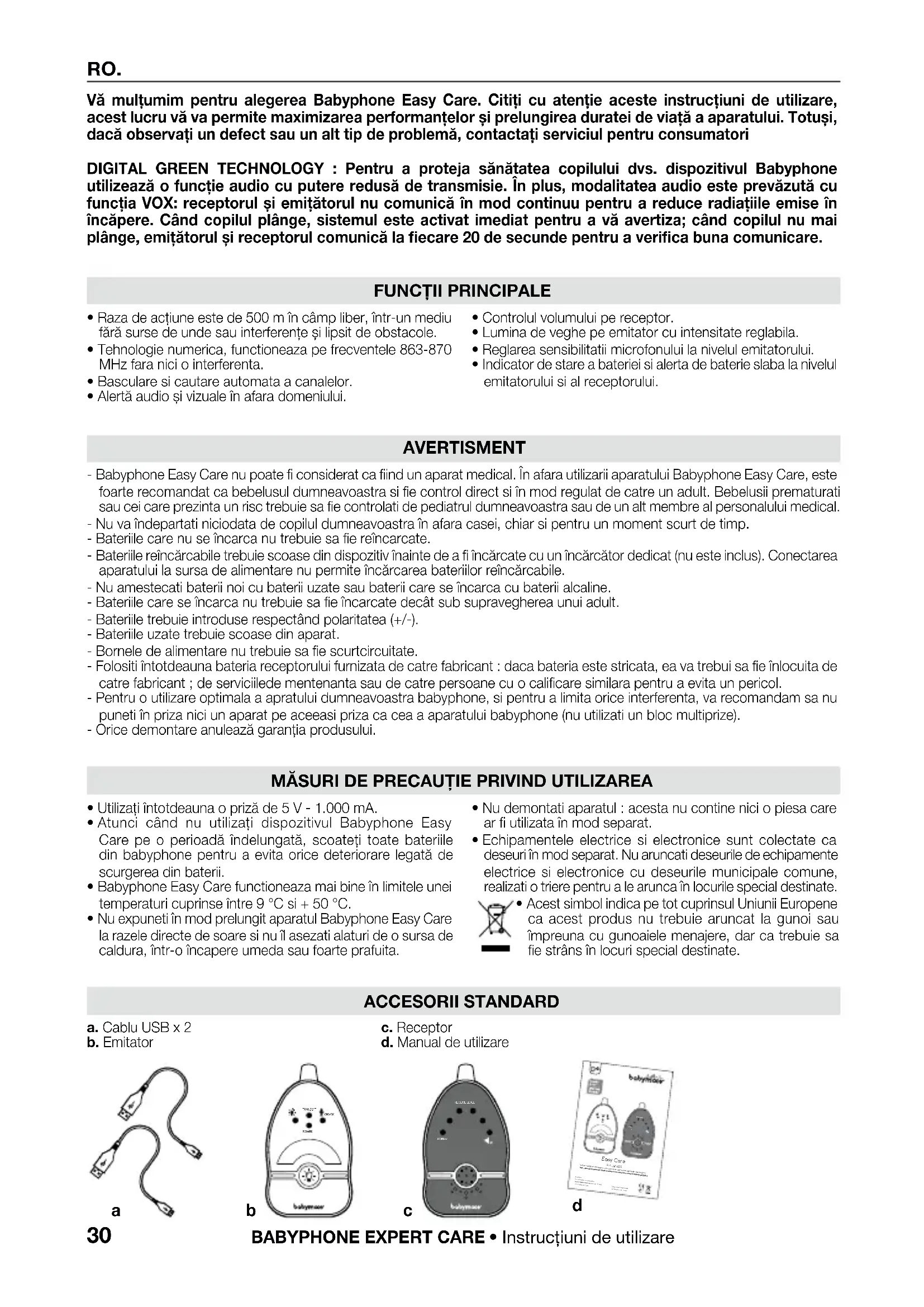 RO. Vă mulțumim pentru alegerea Babyphone Easy Care. Citiți cu atenție aceste instrucțiuni de utilizare, acest lucru vă va permite maximizarea performanțelor și prelungirea duratei de viață a aparatului. Totuși, dacă observați un defect sau un alt tip de problemă, contactați serviciul pentru consumatori DIGITAL GREEN TECHNOLOGY : Pentru a proteja sănătatea copilului dvs. dispozitivul Babyphone utilizează o funcție audio cu putere redusă de transmisie. În plus, modalitatea audio este prevăzută cu funcția VOX: receptorul și emițătorul nu comunică în mod continuu pentru a reduce radiațiile emise în încăpere. Când copilul plânge, sistemul este activat imediat pentru a vă avertiza; când copilul nu mai plânge, emițătorul și receptorul comunică la fiecare 20 de secunde pentru a verifica buna comunicare.