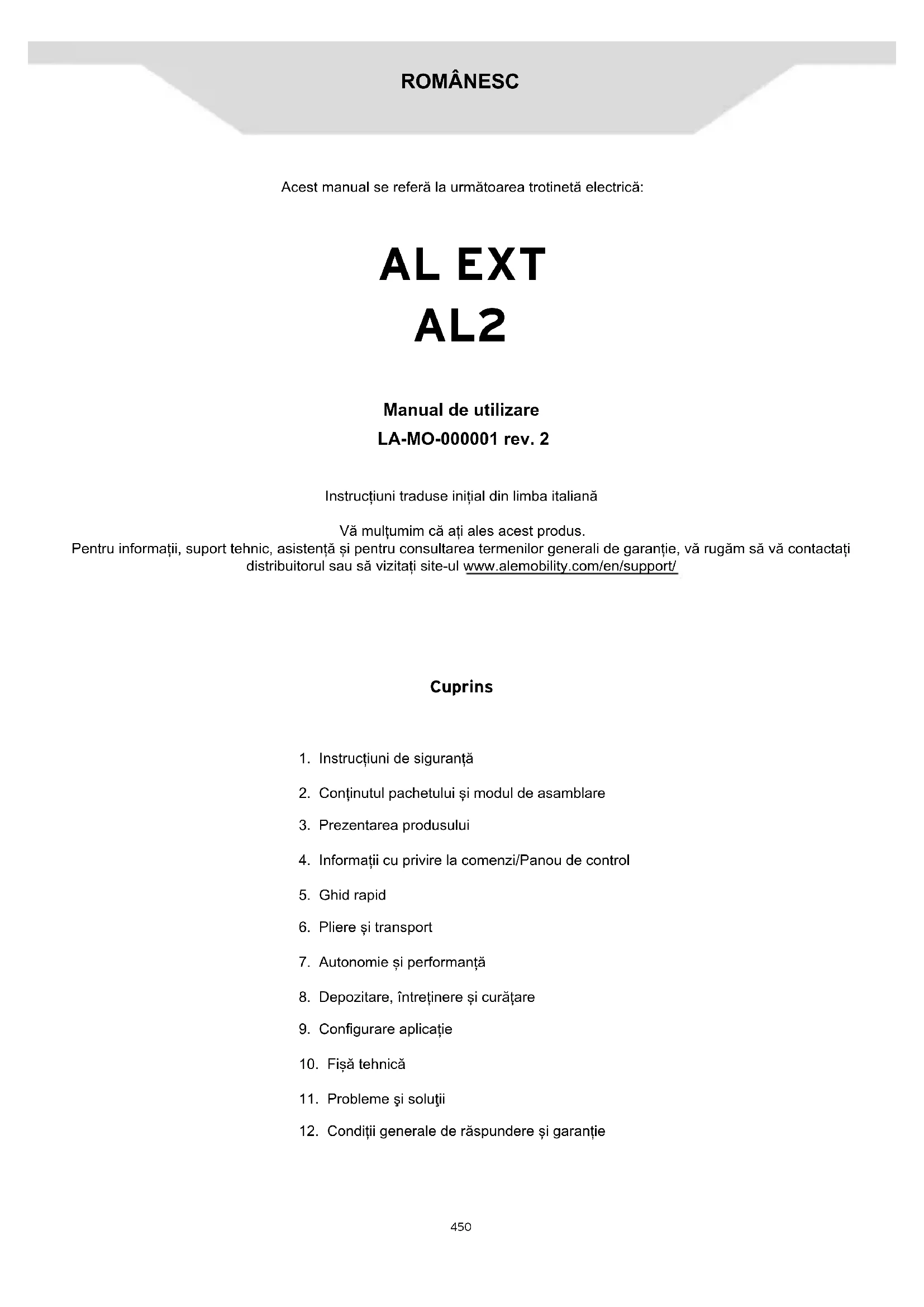 Conducătorul este, de asemenea, obligat să păstreze produsul curat și într-o stare perfectă de eciență și întreținere, să efectueze cu diligență vericările de siguranță de care este responsabil, astfel cum este descris în secțiunile anterioare, să nu modice produsul în vreun fel și să păstreze toată documentația cu privire la întreținere. Societatea nu este responsabilă pentru daunele cauzate și nu este în niciun fel responsabilă pentru daunele cauzate lucrurilor sau persoanelor în situațiile în care: - produsul este utilizat necorespunzător sau fără respectarea instrucțiunilor din manualul de instrucțiuni; - după achiziționare, produsul este modicat sau folosit necorespunzător în toate sau o parte dintre componentele sale. IÎn cazul unei defecțiuni a produsului din motive care nu pot atribuite unui comportament incorect al conducătorului și în cazul în care doriți să consultați termenii generali de garanție, vă rugăm să contactați distribuitorul propriu sau să vizitați site-ul web www.alemobility.com/en/ Sunt întotdeauna excluse din domeniul de aplicare al garanției legale a produselor orice defecțiuni sau utilizări necorespunzătoare cauzate de evenimente accidentale și/sau care pot atribuite responsabilității Cumpărătorului sau utilizării produsului care nu respectă utilizarea prevăzută și/sau indicațiile menționate în documentația tehnică atașată produsului, sau ca urmare a nereglării pieselor mecanice, uzurii naturale a materialelor consumabile sau cauzate de erori de asamblare, lipsa întreținerii și/sau folosirea acestuia fără respectarea instrucțiunilor. De exemplu, următoarele sunt considerate ca ind excluse din garanția legală în ceea ce privește produsele: