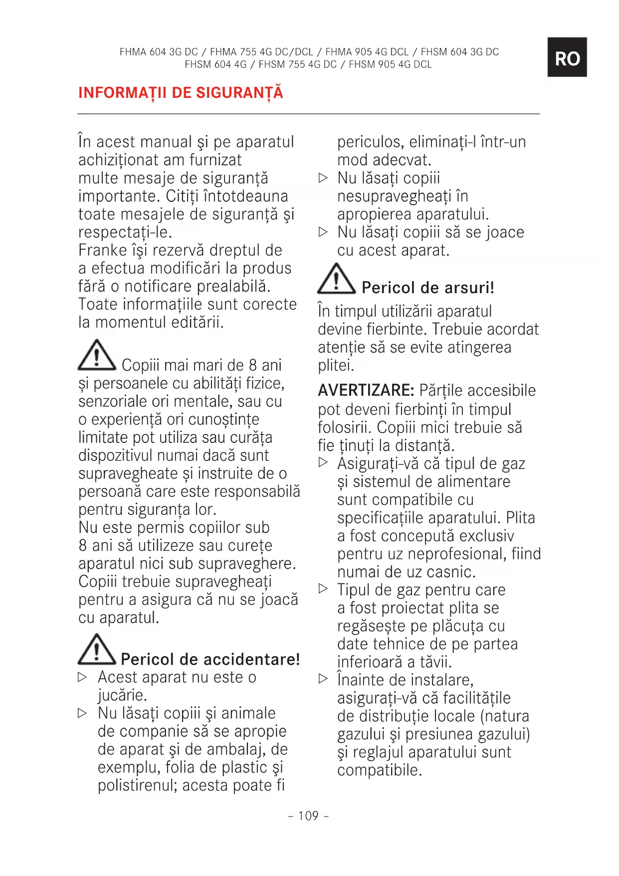 În acest manual şi pe aparatul achiziţionat am furnizat multe mesaje de siguranţă importante. Citiţi întotdeauna toate mesajele de siguranţă şi respectaţi-le. Franke îşi rezervă dreptul de a efectua modificări la produs fără o notificare prealabilă. Toate informaţiile sunt corecte la momentul editării. Copiii mai mari de 8 ani și persoanele cu abilităţi fizice, senzoriale ori mentale, sau cu o experienţă ori cunoștinţe limitate pot utiliza sau curăţa dispozitivul numai dacă sunt supravegheate și instruite de o persoană care este responsabilă pentru siguranţa lor. Nu este permis copiilor sub 8 ani să utilizeze sau cureţe aparatul nici sub supraveghere. Copiii trebuie supravegheaţi pentru a asigura că nu se joacă cu aparatul. Pericol de accidentare!