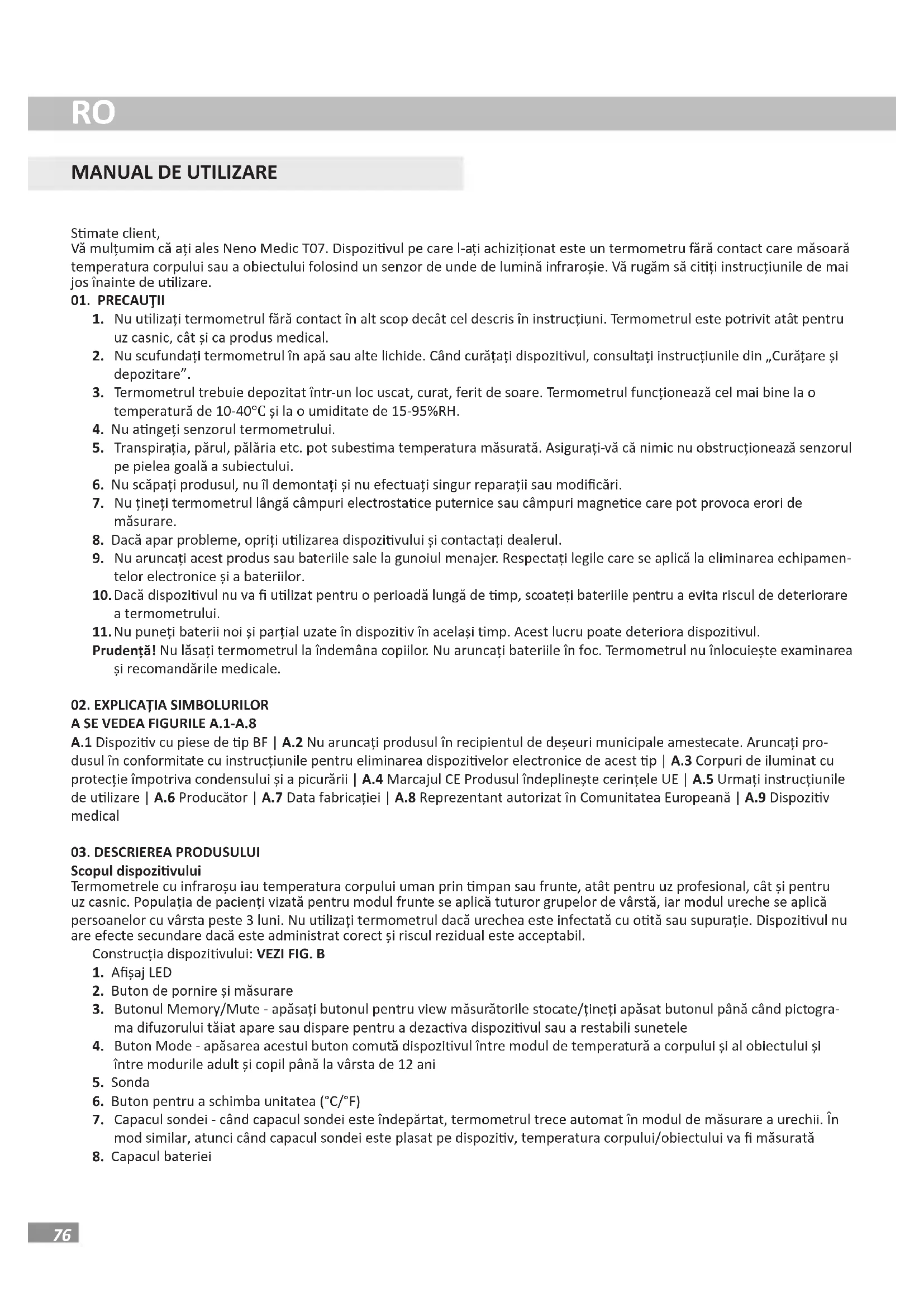 Scopul dispozivului Termometrelecuinfraroșuiautemperaturacorpuluiumanprinmpansaufrunte,atâtpentruuzprofesional,câtșipentru uzcasnic.Populațiadepaciențivizatăpentrumodulfrunteseaplicătuturorgrupelordevârstă,iarmodulurecheseaplică persoanelorcuvârstapeste3luni.Nuulizațitermometruldacăurecheaesteinfectatăcuotăsausupurație.Dispozivulnu areefectesecundaredacăesteadministratcorectșirisculrezidualesteacceptabil. Construcțiadispozivului:VEZI FIG. B