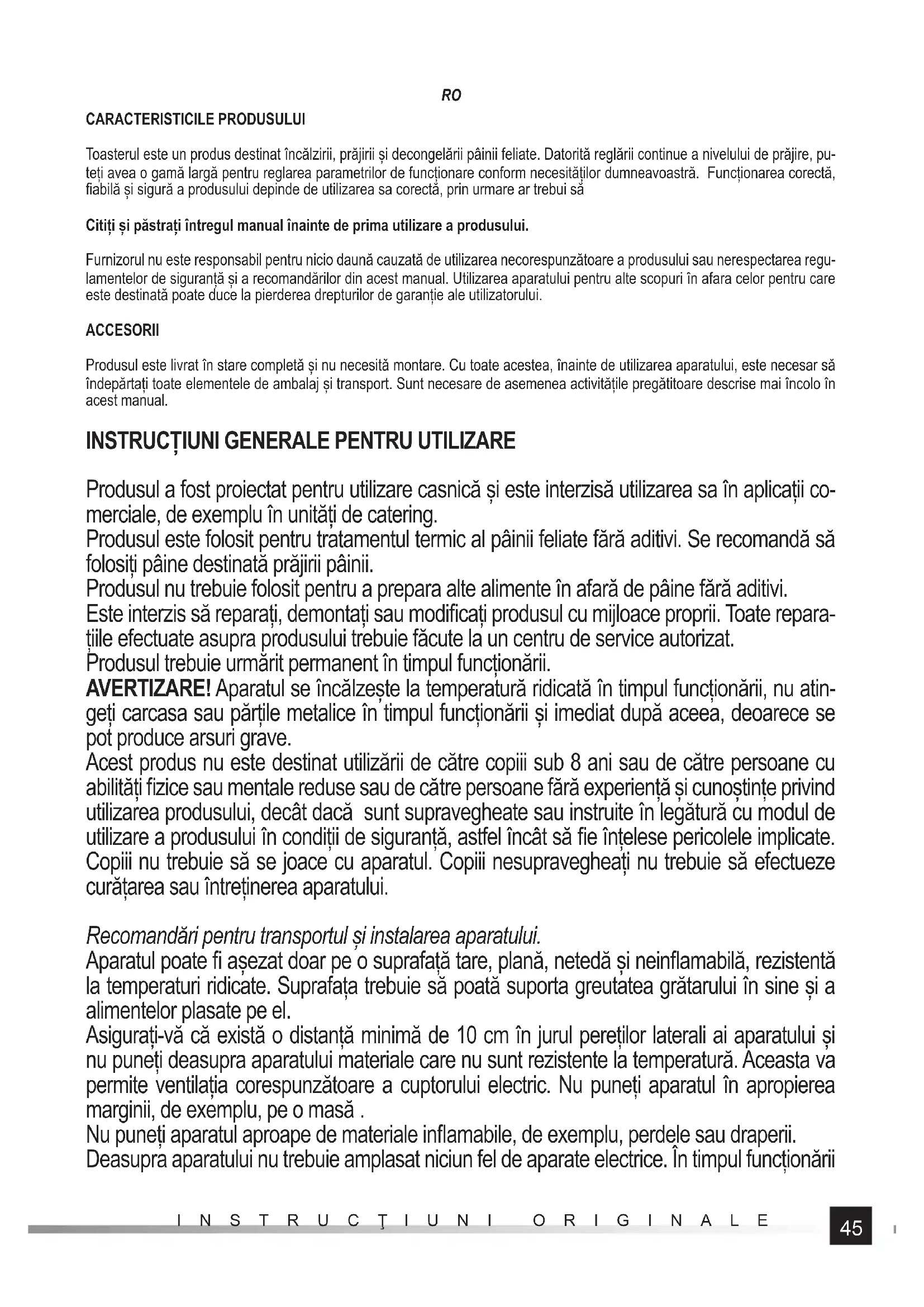 C, umiditatea relativă trebuie să fi e sub 90% fără condensarea vaporilor de apă. Aparatul este destinat exclusiv utilizării la interior. Nu-l expuneți la precipitații sau apă în ni- ciun fel. Instrucțiuni pentru conectarea produsului la sursa de alimentare electrică Înainte de conectarea aparatului la rețeaua electrică, trebuie să vă asigurați că tensiunea, frecvența și performanțele rețelei corespund valorilor de pe placa de identifi care a aparatului. Ștecherul de la cablul electric trebuie să se potrivească în priză. Este interzis să modifi cați ștecherul sau priza pentru a le face să se potrivească. Aparatul trebuie conectat direct la o priză simplă de perete a rețelei de alimentare elec- trică. Este interzis să folosiți prelungitoare, triplu-ștechere sau prize duble. Rețeaua de alimentare electrică trebuie echipată cu conductor de împământare și siguranță de 16 A. Evitați contactul cablului electric cu muchii ascuțite, obiecte și suprafețe fi erbinți. În timpul funcționării, cablul de alimentare trebuie să fi e întotdeauna întins complet și poziția sa trebuie aleasă astfel încât cablul de alimentare să nu devină un obstacol timpul utilizării aparatului. Cablul electric trebuie plasat astfel încât să nu prezinte risc de împiedicare. Priza electrică de alimentare trebuie amplasată într-o poziție unde este întotdeauna posibil să scoateți rapid ștecherul cablului de alimentare din priză. Trageți întotdeauna ștecherul din priză ținând doar de carcasă, niciodată nu trageți de cablu. Dacă cablul electric sau ștecherul sunt deteriorate, trebuie să deconectați imediat de la rețea și să contactați centrul de service autorizat al producătorului pentru înlocuirea lor. Nu folosiți aparatul cu cablu sau ștecher deteriorate. Cablul de alimentare și ștecherul cablului de ali- mentare nu se pot repara și trebuie să le înlocuiți cu un cablu de alimentare nou dacă aceste componente sunt deteriorate. Instrucțiuni pentru utilizare AVERTIZARE! Părțile metalice și carcasa pot fi fi erbinți după utilizare. Nu le atingeți, deoa- rece pot provoca arsuri grave. Lăsați elementele aparatului să se răcească. Folosiți mănuși pentru protecție împotriva temperaturilor ridicate dacă trebuie să îl deplasați înainte de răcire. Asigurați-vă că pardoseala în vecinătatea locului de utilizare a aparatului nu este alunecoa- să. Aceasta va reduce riscul de alunecare, care poate cauza accidente grave. Nu puneți felii groase de pâine în toaster. Contactul pâinii cu rezistența produsului poate provoca incendiu. Țineți sub observație permanent pâinea pentru a preveni arderea sa în timpul preparării. Dacă nu este supravegheată, pâinea se poate arde, provocând incendii și arsuri grave. În cazul în care produsul este echipat cu o tavă pentru fi rimituri, goliți-o conform instrucțiunilor din manualul utilizatorului.47