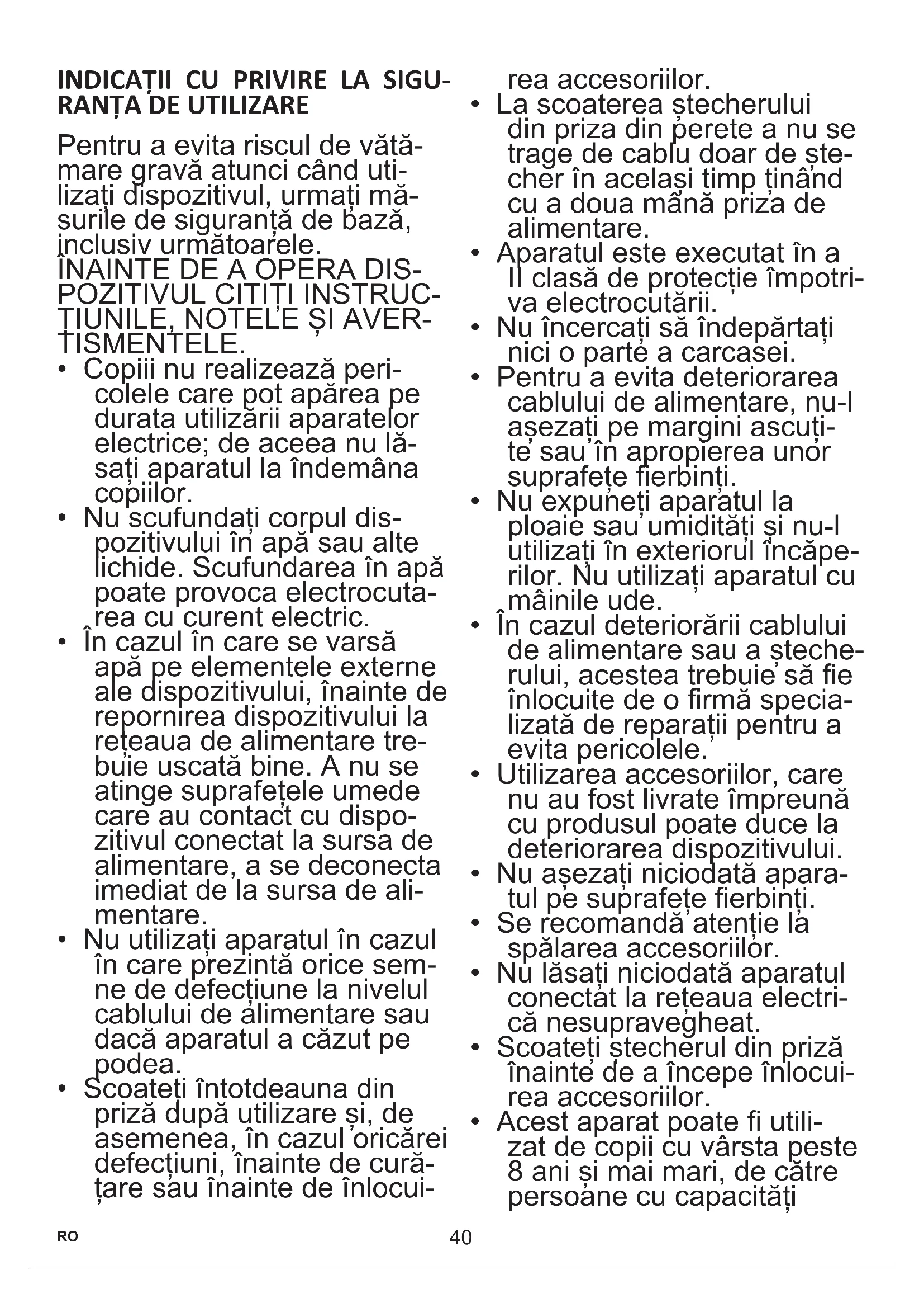 - Lamele sunt foarte ascuțite, vă rugăm să aveți grijă când curățați. RO43