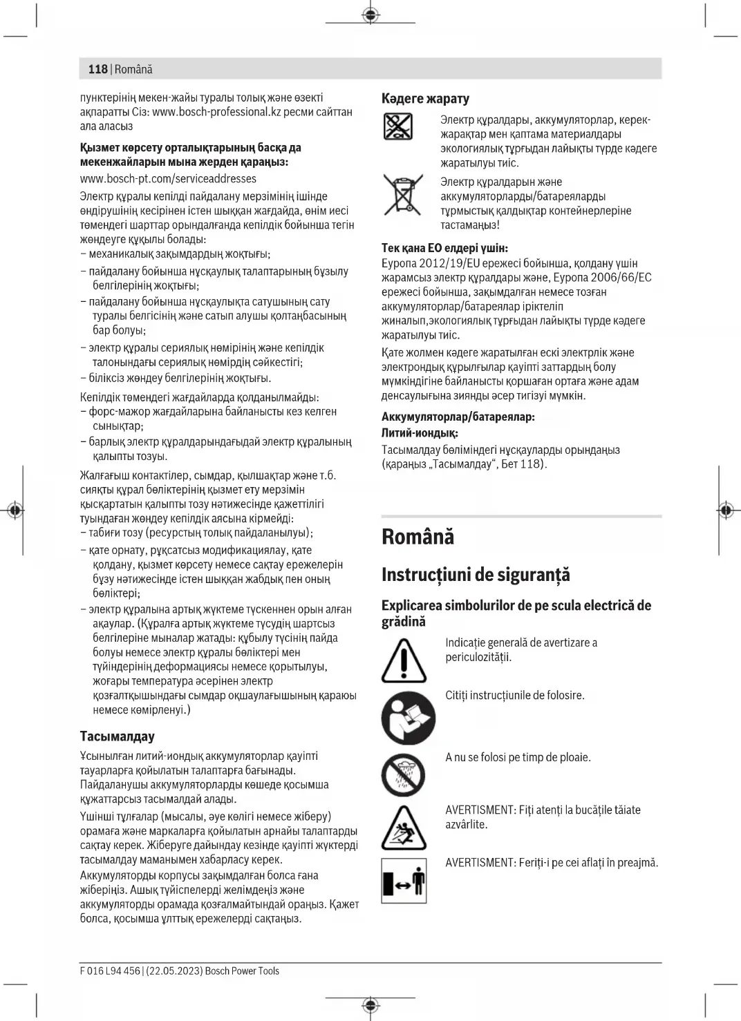 Ұсынылған литий-иондық аккумуляторлар қауіпті тауарларға қойылатын талаптарға бағынады. Пайдаланушы аккумуляторларды көшеде қосымша құжаттарсыз тасымалдай алады. Үшінші тұлғалар (мысалы, әуе көлігі немесе жіберу) орамаға және маркаларға қойылатын арнайы талаптарды сақтау керек. Жіберуге дайындау кезінде қауіпті жүктерді тасымалдау маманымен хабарласу керек. Аккумуляторды корпусы зақымдалған болса ғана жіберіңіз. Ашық түйіспелерді желімдеңіз және аккумуляторды орамада қозғалмайтындай ораңыз. Қажет болса, қосымша ұлттық ережелерді сақтаңыз. Кәдеге жарату Электр құралдары, аккумуляторлар, керек- жарақтар мен қаптама материалдары экологиялық тұрғыдан лайықты түрде кәдеге жаратылуы тиіс. Электр құралдарын және аккумуляторларды/батареяларды тұрмыстық қалдықтар контейнерлеріне тастамаңыз! Тек қана ЕО елдері үшін: Еуропа 2012/19/EU ережесі бойынша, қолдану үшін жарамсыз электр құралдары және, Еуропа 2006/66/EC ережесі бойынша, зақымдалған немесе тозған аккумуляторлар/батареялар іріктеліп жиналып,экологиялық тұрғыдан лайықты түрде кәдеге жаратылуы тиіс. Қате жолмен кәдеге жаратылған ескі электрлік және электрондық құрылғылар қауіпті заттардың болу мүмкіндігіне байланысты қоршаған ортаға және адам денсаулығына зиянды әсер тигізуі мүмкін. Аккумуляторлар/батареялар: Литий-иондық: Тасымалдау бөліміндегі нұсқауларды орындаңыз (қараңыз „Тасымалдау“, Бет118). Română Instrucţiuni de siguranţă Explicarea simbolurilor de pe scula electrică de grădină Indicaţie generală de avertizare a periculozităţii. Citiţi instrucţiunile de folosire. A nu se folosi pe timp de ploaie. AVERTISMENT: Fiți atenți la bucățile tăiate azvârlite. AVERTISMENT: Feriți-i pe cei aflați în preajmă. F 016 L94 456 | (22.05.2023) Bosch Power ToolsRomână | 119 Nu introduceţi mâinile, picioarele sau îmbrăcămintea largă în orificiile produsului, în timpul funcţionării acestuia. Suflantă care se roteşte. Nu introduceţi mâinile, picioarele, părul lung sau îmbrăcămintea largă în orificiile produsului, în timpul funcţionării acestuia. Purtaţi ochelari de protecţie și antifoane. AVERTISMENT: Scoateți acumulatorul înaintea lucrărilor de întreținere. Instrucţiuni generale de siguranţă pentru scule electrice AVERTIS- MENT Citiţi toate avertizările, instrucţiunile, ilustraţiile şi specificaţiile puse la dispoziţie împreună cu această sculă electrică. Nerespectarea instrucţiunilor menţionate mai jos poate duce la electrocutare, incendiu şi/sau vătămări corporale grave. Păstraţi toate indicaţiile de avertizare şi instrucţiunile în vederea utilizărilor viitoare. Termenul "sculă electrică" folosit în indicaţiile de avertizare se referă la sculele electrice alimentate de la reţea (cu cablu de alimentare) sau la sculele electrice cu acumulator (fără cablu de alimentare). Siguranţa la locul de muncă u Menţineţi‑vă sectorul de lucru curat şi bine iluminat. Dezordinea sau sectoarele de lucru neluminate pot duce la accidente. u Nu permiteţi accesul copiilor şi al spectatorilor în timpul utilizării sculei electrice. Dacă vă este distrasă atenţia puteţi pierde controlul. u În timpul funcţionării sculei electrice nu este permisă staţionarea persoanelor sau animalelor într-un perimetru cu raza de 3metri în jurul acesteia. Nu suflați niciodată murdăria în direcția persoanelor aflate în jur. u La utilizarea produsului fiți atenți la pericolele care nu sunt semnalizate prin zgomote perceptibile. u Atunci când puneți pe jos scula electrică de grădină, aveți grijă să nu existe pericol de a vă împedica de aceasta. u Operatorul sau utilizatorul este ţinut răspunzător pentru accidente sau pagube provocate altor oameni sau bunurilor acestora. Siguranţă electrică u Evitaţi contactul corporal cu suprafeţe împământate sau legate la masă ca ţevi, instalaţii de încălzire, plite şi frigidere. Există un risc crescut de electrocutare atunci când corpul vă este împământat sau legat la masă. u Feriţi scula electrică de ploaie sau umezeală. Pătrunderea apei într‑o sculă electrică măreşte riscul de electrocutare. u Evitați condițiile meteo nefavorabile, în special atunci când există pericol de furtună. Siguranţa persoanelor u Fiţi atenţi, aveţi grijă de ceea ce faceţi şi procedaţi raţional atunci când lucraţi cu o sculă electrică. Nu folosiţi scula electrică atunci când sunteţi obosiţi sau vă aflaţi sub influenţa drogurilor, a alcoolului sau a medicamentelor. Un moment de neatenţie în timpul utilizării sculelor electrice poate duce la răniri grave. u Purtaţi echipament personal de protecţie. Purtaţi întoteauna ochelari de protecţie. Purtarea echipamentului personal de protecţie, ca masca pentru praf, încălţăminte de siguranţă antider
