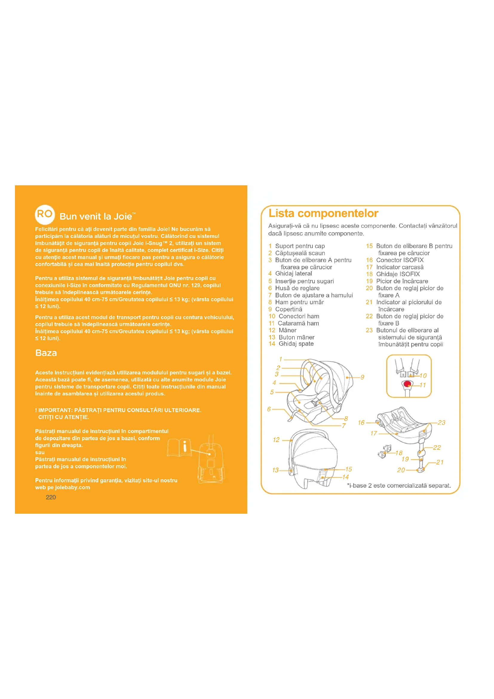 Felicitări pentru că ați devenit parte din familia Joie! Ne bucurăm să participăm la călătoria alături de micuțul vostru. Călătorind cu sistemul îmbunătățit de siguranță pentru copii Joie i-Snug™ 2, utilizați un sistem de siguranță pentru copii de înaltă calitate, complet certificat i-Size. Citiți cu atenție acest manual și urmați fiecare pas pentru a asigura o călătorie confortabilă și cea mai înaltă protecție pentru copilul dvs.Pentru a utiliza sistemul de siguranță îmbunătățit Joie pentru copii cu conexiunile i-Size în conformitate cu Regulamentul ONU nr. 129, copilul trebuie să îndeplinească următoarele cerințe.Înălțimea copilului 40 cm-75 cm/Greutatea copilului ≤ 13 kg; (vârsta copilului ≤ 12 luni).Pentru a utiliza acest modul de transport pentru copii cu centura vehiculului, copilul trebuie să îndeplinească următoarele cerințe.Înălțimea copilului 40 cm-75 cm/Greutatea copilului ≤ 13 kg; (vârsta copilului ≤ 12 luni). Baza Aceste instrucțiuni evidențiază utilizarea modulului pentru sugari și a bazei. Această bază poate fi, de asemenea, utilizată cu alte anumite module Joie pentru sisteme de transportare copii. Citiți toate instrucțiunile din manual înainte de asamblarea și utilizarea acestui produs.! IMPORTANT: PĂSTRAȚI PENTRU CONSULTĂRI ULTERIOARE.CITIȚI CU ATENȚIE.Păstrați manualul de instrucțiuni în compartimentul de depozitare din partea de jos a bazei, conform figurii din dreapta. sau Păstrați manualul de instrucțiuni înpartea de jos a componentelor moi.Pentru informații privind garanția, vizitați site-ul nostru web pe joiebaby.com *i-base 2 este comercializată separat.