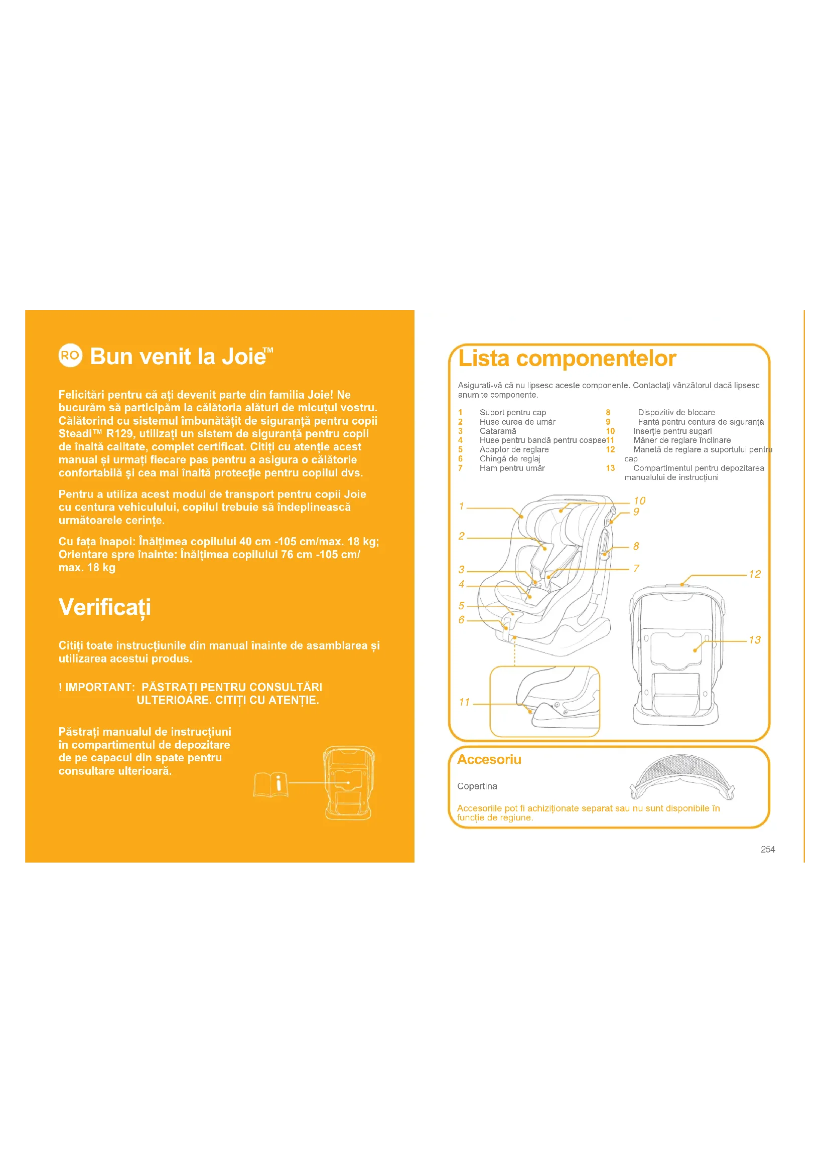 Felicitări pentru că ați devenit parte din familia Joie! Ne bucurăm să participăm la călătoria alături de micuțul vostru. Călătorind cu sistemul îmbunătățit de siguranță pentru copii Steadi™ R129, utilizați un sistem de siguranță pentru copii de înaltă calitate, complet certificat. Citiți cu atenție acest manual și urmați fiecare pas pentru a asigura o călătorie confortabilă și cea mai înaltă protecție pentru copilul dvs.Pentru a utiliza acest modul de transport pentru copii Joie cu centura vehiculului, copilul trebuie să îndeplinească următoarele cerințe.Cu fața înapoi: Înălțimea copilului 40 cm -105 cm/max. 18 kg; Orientare spre înainte: Înălțimea copilului 76 cm -105 cm/max. 18 kg Verificați Citiți toate instrucțiunile din manual înainte de asamblarea și utilizarea acestui produs.! IMPORTANT: PĂSTRAȚI PENTRU CONSULTĂRI ULTERIOARE. CITIȚI CU ATENȚIE.Păstrați manualul de instrucțiuni în compartimentul de depozitare de pe capacul din spate pentru consultare ulterioară.
