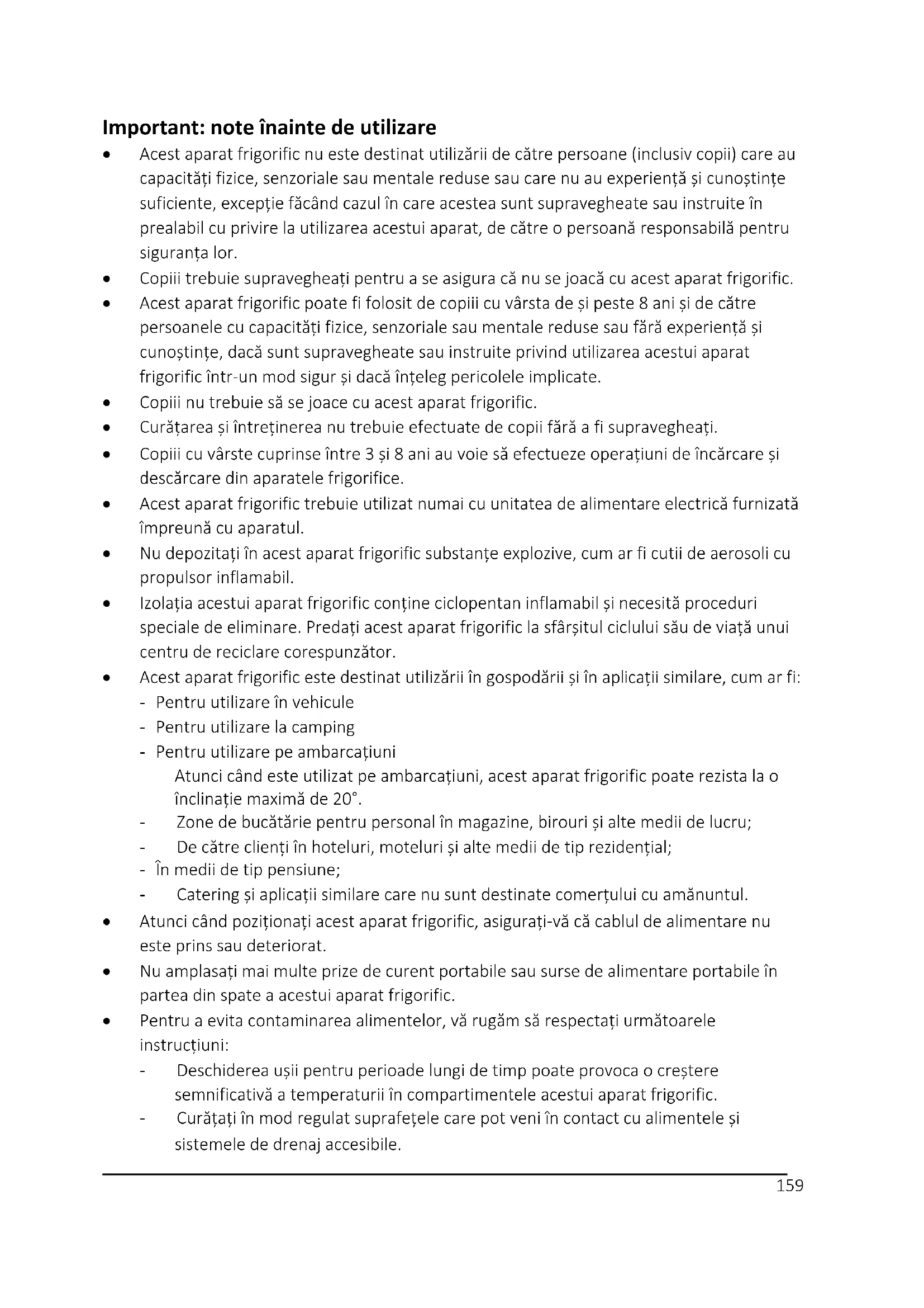 - Acest aparat frigorific nu este destinat utilizării de către persoane (inclusiv copii) care au capacități fizice, senzoriale sau mentale reduse sau care nu au experiență și cunoștințe suficiente, excepție făcând cazul în care acestea sunt supravegheate sau instruite în prealabil cu privire la utilizarea acestui aparat, de către o persoană responsabilă pentru siguranța lor.