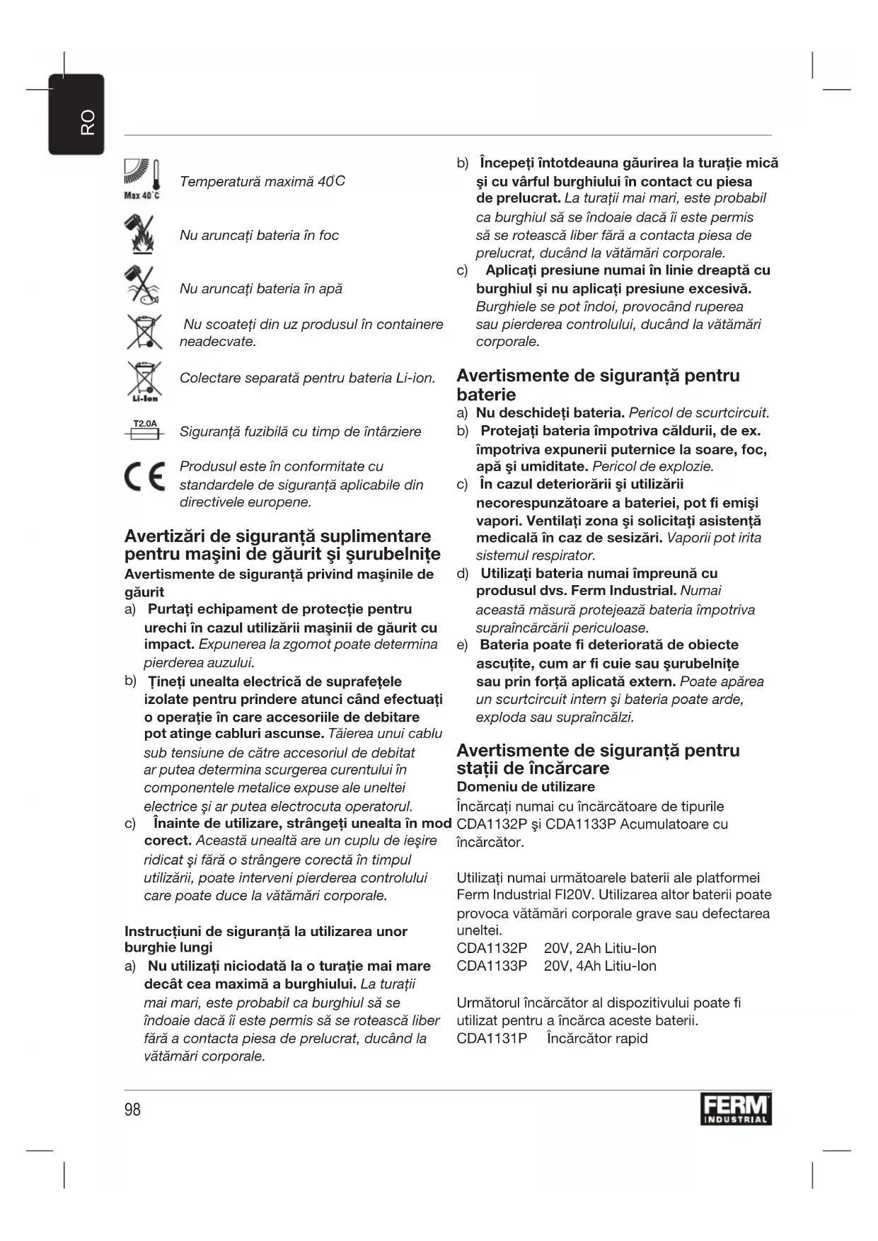 Începeţi întotdeauna găurirea la turaţie mică şi cu vârful burghiului în contact cu piesa de prelucrat. La turaţii mai mari, este probabil ca burghiul să se îndoaie dacă îi este permis să se rotească liber fără a contacta piesa de prelucrat, ducând la vătămări corporale. c) Aplicaţi presiune numai în linie dreaptă cu burghiul şi nu aplicaţi presiune excesivă. Burghiele se pot îndoi, provocând ruperea sau pierderea controlului, ducând la vătămări corporale. Avertismente de siguranţă pentru baterie a) Nu deschideţi bateria. Pericol de scurtcircuit. b) Protejaţi bateria împotriva căldurii, de ex. împotriva expunerii puternice la soare, foc, apă şi umiditate. Pericol de explozie. c) În cazul deteriorării şi utilizării necorespunzătoare a bateriei, pot fi emişi vapori. Ventilaţi zona şi solicitaţi asistenţă medicală în caz de sesizări. Vaporii pot irita sistemul respirator. d) Utilizaţi bateria numai împreună cu produsul dvs. Ferm Industrial. Numai această măsură protejează bateria împotriva supraîncărcării periculoase. e) Bateria poate fi deteriorată de obiecte ascuţite, cum ar fi cuie sau şurubelniţe sau prin forţă aplicată extern. Poate apărea un scurtcircuit intern şi bateria poate arde, exploda sau supraîncălzi. Avertismente de siguranţă pentru staţii de încărcare Domeniu de utilizare Încărcaţi numai cu încărcătoare de tipurile CDA1132P şi CDA1133P Acumulatoare cu încărcător. Utilizaţi numai următoarele baterii ale platformei Ferm Industrial FI20V. Utilizarea altor baterii poate provoca vătămări corporale grave sau defectarea uneltei. CDA1132P 20V, 2Ah Litiu-Ion CDA1133P 20V, 4Ah Litiu-Ion Următorul încărcător al dispozitivului poate fi utilizat pentru a încărca aceste baterii. CDA1131P Încărcător rapid99