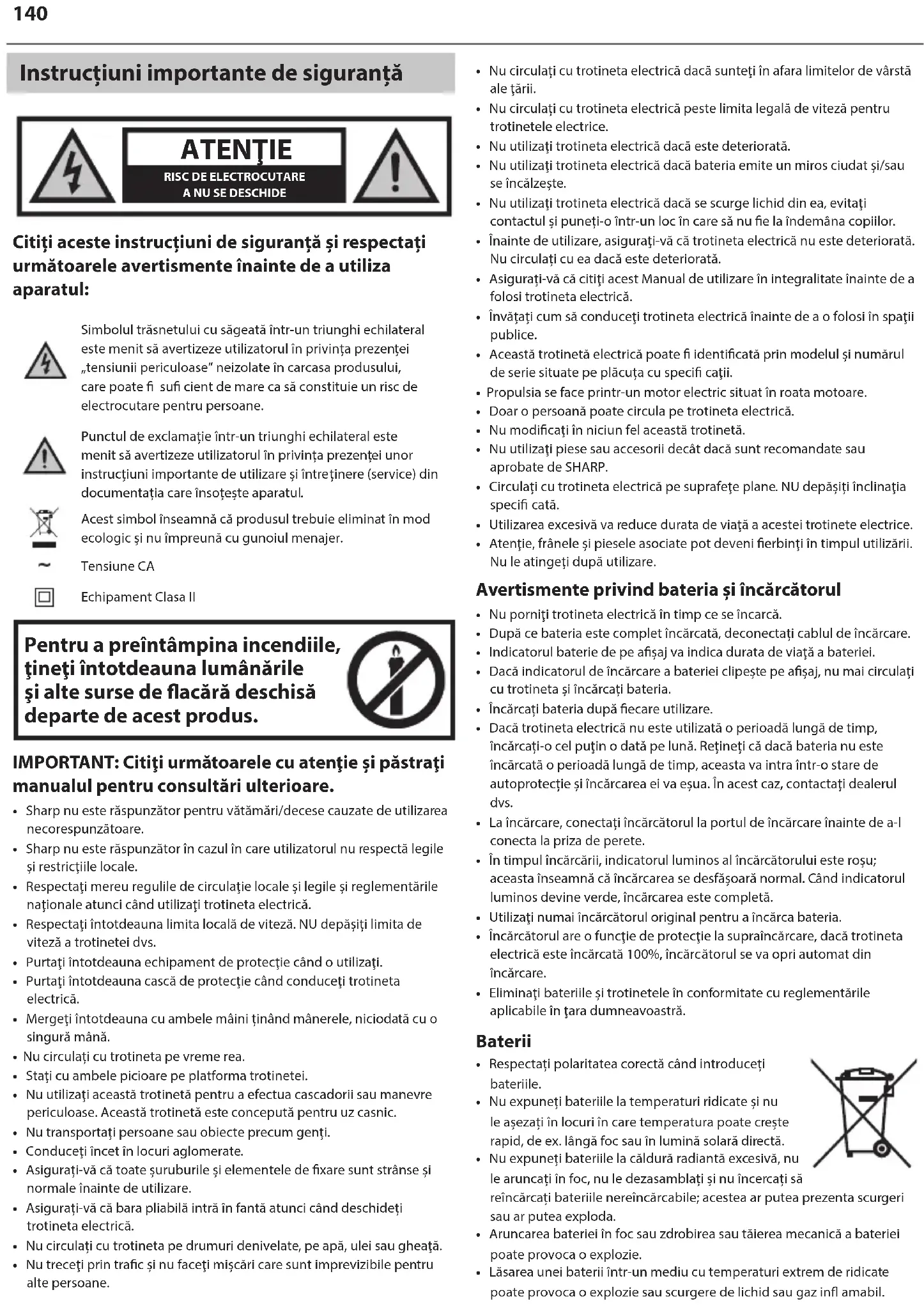 - Prin prezenta, Sharp Consumer Electronics Poland sp. z o.o. declară că această trotinetă electrică este în conformitate cu cerinţele esenţiale și cu alte prevederi relevante din Directiva 2014/53/UE privind echipamentele radio (RED), din Reglementările din 2017 privind echipamentele radio din Regatul Unit și din PN-EN 17128: 2021-03