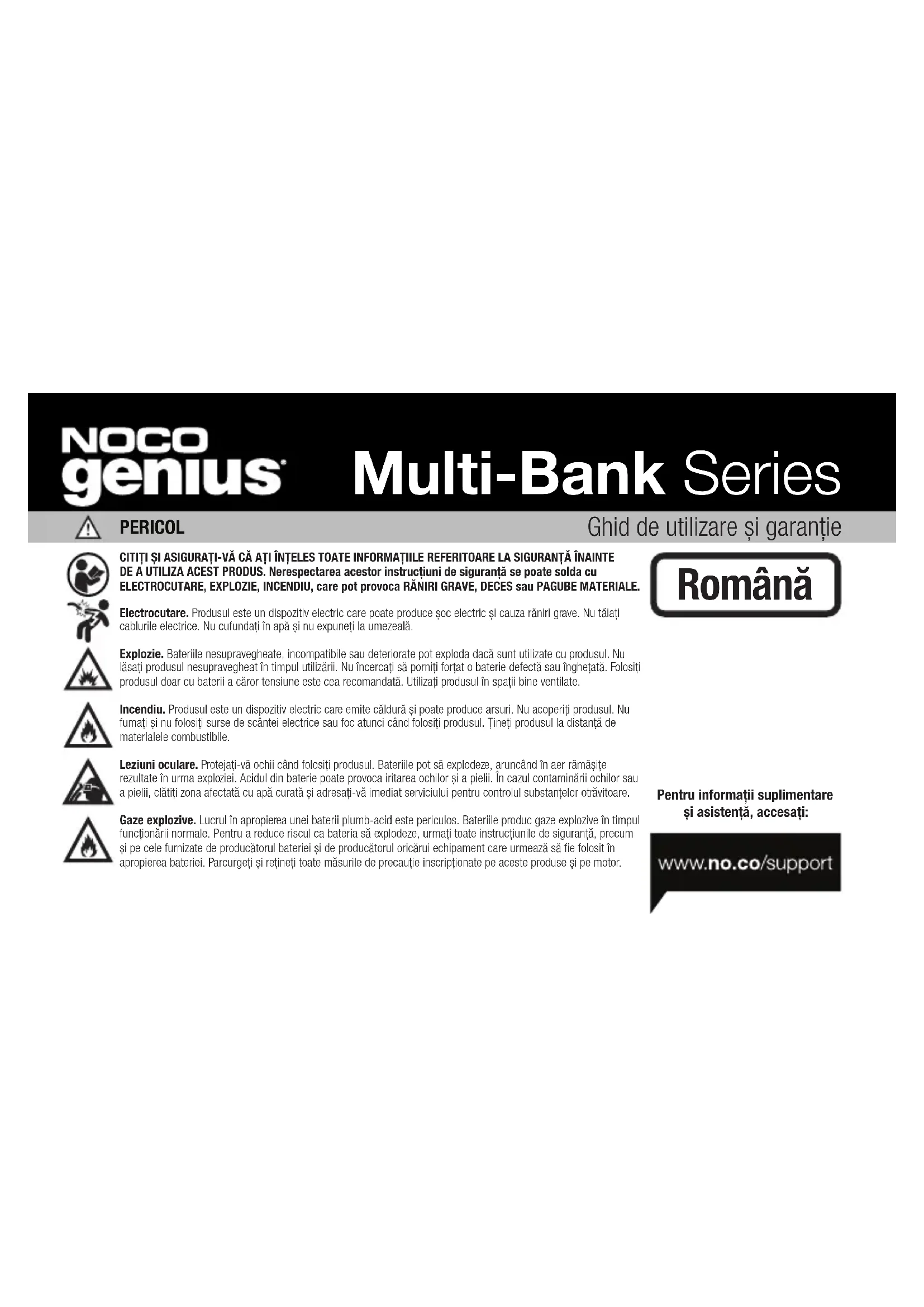 Tieto podmienky sa uplatňujú iba na Produkt počas Záručnej doby. Záruka bez starostí stráca platnosť buď vypršaním času od dátumu zakúpenia (bez poskytnutia dokladu o predaji ide o čas, ktorý uplynul od dátumu vzniku sériového čísla), alebo na základe podmienok uvedených vyššie v tomto dokumente. Produkt vráťte aj s príslušnou dokumentáciou. S bločkom: 0 – 3 roky: BEZ poplatku. S dokladom o kúpe, záručná doba začína plynúť od dátumu zakúpenia. BEZ bločku: 0 – 3 roky: BEZ poplatku. BEZ dokladu o kúpe, záručná doba začína plynúť od dátumu vzniku sériového čísla. Váš produkt spoločnosti NOCO vám odporúčame registrovať, aby ste mohli nahrať doklad o kúpe a predĺžiť tak účinnosť záručnej doby. Svoj produkt spoločnosti NOCO môžete registrovať online na no.co/register. V prípade otázok týkajúcich sa záruky alebo produktu kontaktujte podporu spoločnosti NOCO (e-mail a telefónne číslo sú uvedené vyššie), prípadne napíšte na adresu The NOCO Company, 30339 Diamond Parkway, #102, Glenwillow, OH 44139 USA. SKGhid de utilizare și garanție PERICOL CITIȚI ȘI ASIGURAȚI-VĂ CĂ AȚI ÎNȚELES TOATE INFORMAȚIILE REFERITOARE LA SIGURANȚĂ ÎNAINTE DE A UTILIZA ACEST PRODUS. Nerespectarea acestor instrucțiuni de siguranță se poate solda cu ELECTROCUTARE, EXPLOZIE, INCENDIU, care pot provoca RĂNIRI GRAVE, DECES sau PAGUBE MATERIALE. Electrocutare. Produsul este un dispozitiv electric care poate produce șoc electric și cauza răniri grave. Nu tăiați cablurile electrice. Nu cufundați în apă și nu expuneți la umezeală. Explozie. Bateriile nesupravegheate, incompatibile sau deteriorate pot exploda dacă sunt utilizate cu produsul. Nu lăsați produsul nesupravegheat în timpul utilizării. Nu încercați să porniți forțat o baterie defectă sau înghețată. Folosiți produsul doar cu baterii a căror tensiune este cea recomandată. Utilizați produsul în spații bine ventilate. Incendiu. Produsul este un dispozitiv electric care emite căldură și poate produce arsuri. Nu acoperiți produsul. Nu fumați și nu folosiți surse de scântei electrice sau foc atunci când folosiți produsul. Țineți produsul la distanță de materialele combustibile. Leziuni oculare. Protejați-vă ochii când folosiți produsul. Bateriile pot să explodeze, aruncând în aer rămășițe rezultate în urma exploziei. Acidul din baterie poate provoca iritarea ochilor și a pielii. În cazul contaminării ochilor sau a pielii, clătiți zona afectată cu apă curată și adresați-vă imediat serviciului pentru controlul substanțelor otrăvitoare. Gaze explozive. Lucrul în apropierea unei baterii plumb-acid este periculos. Bateriile produc gaze explozive în timpul funcționării normale. Pentru a reduce riscul ca bateria să explodeze, urmați toate instrucțiunile de siguranță, precum și pe cele furnizate de producătorul bateriei și de producătorul oricărui echipament care urmează să fie folosit în apropierea bateriei. Parcurgeți și rețineți toate măsurile de precauție inscripționate pe aceste produse și pe motor. Pentru informații suplimentare și asistență, accesați: Multi-Bank Series RomânăDespre Genius Multi-Bank. NOCO Genius Multi-Bank reprezintă una dintre cele mai inovatoare și avansate tehnologii de pe piață, făcând fiecare încărcare simplă și ușoară. Destul de probabil că acest încărcător e cel mai sigur și eficient dintre cele pe care le-ați folosit vreodată. Seria Genius multi-bank este proiectată pentru încărcarea tuturor tipurilor de baterii cu plumb de 6V și 12V, incluzând bateriile umede (Wet), bateriile cu gel (Gel), bateriile fără întreținere (MF), bateriile cu calciu (CA), bateriile umede îmbunătățite (EFB) și bateriile cu separator din fibră de sticlă (AGM), pe lângă bateriile cu litiu de 12V (LiFePO4). Seria este recomandată pentru încărcarea bateriilor cu capacități de până la 40 de amperi pe oră și pentru întreținerea bateriilor de toate dimensiunile. Noțiuni de bază. Înainte de a utiliza încărcătorul, citiți cu atenție precauțiile specifice ale fabricantului de baterii și rata recomandată de încărcare a bateriei. Determinați tensiunea și tipul chimic al bateriei, consultând manualul de utilizare al bateriei înainte de încărcare. Montare. Este important să țineți cont de distanța până la baterie. Lungimea cablului de curent continuu de la încărcător, fie cu cleme, fie cu conectori cu ochi de prindere, este de aproximativ 863,6 cm (34 inchi). Cablul de extensie are o lungime de aproximativ 3,0 m (10 picioare). Cu oricare dintre tipurile de conectori, vă rugăm să l[sa’i o lungime de cablu de 304 mm (12 inchi) între conexiuni. Enunțul 65. Bornele bateriei, clemele și accesoriile aferente conțin substanțe chimice, inclusiv plumb. Aceste materiale sunt cunoscute în Statul California ca substanțe care produc cancer, malformații, precum și alte daune ale organelor reproductive. Măsuri personale de precauție. Utilizați produsul doar în conformitate cu utilizarea preconizată. Este necesară prezența unei persoane suficient de aproape pentru a vă auzi și a veni în ajutorul dumneavoastră în caz de urgență. Păstrați în apropiere o rezervă de apă curată și săpun pentru cazul în care vă contaminați cu acid din baterie. Utilizați ochelari de protecție și purtați îmbrăcăminte de protecție când lucrați în apropierea unei baterii. Spălați-vă întotdeauna pe mâini după ce ați manipulat baterii sau materiale aferente acestora. Nu manipulați și nu purtați obiecte din metal, inclusiv unelte, ceasuri sau bijuterii, atunci când lucrați cu baterii. Un obiect metalic căzut pe baterie poate produce scântei sau crea un scurt circuit care se poate solda cu electrocutare, incendiu sau explozie, producând rănire, deces sau pagube materiale. Minori. În caz