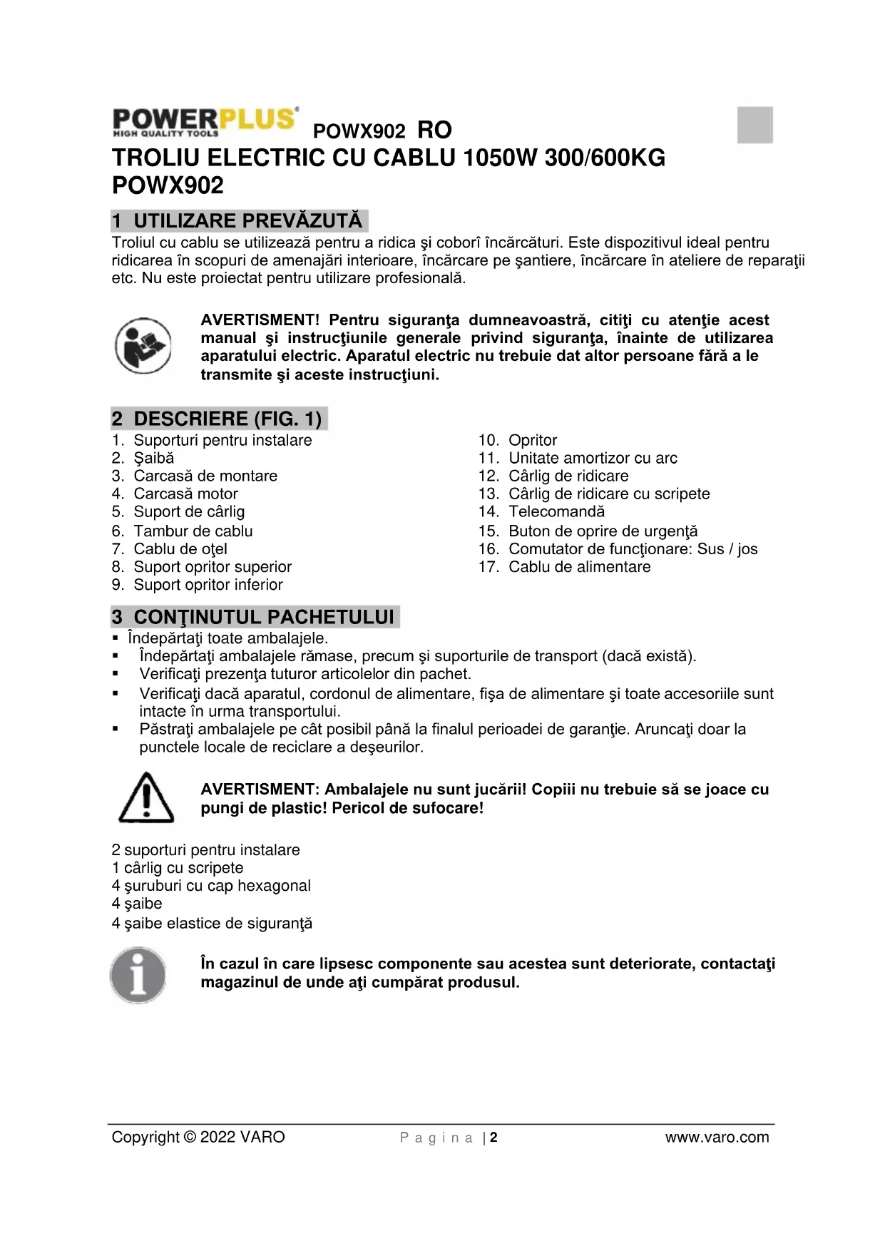 - Este interzisă înlocuirea oricărei componente a scripetelui sau demontarea acestuia.POWX902 RO Copyright © 2022 VARO P a g i n a | 6 www.varo.com