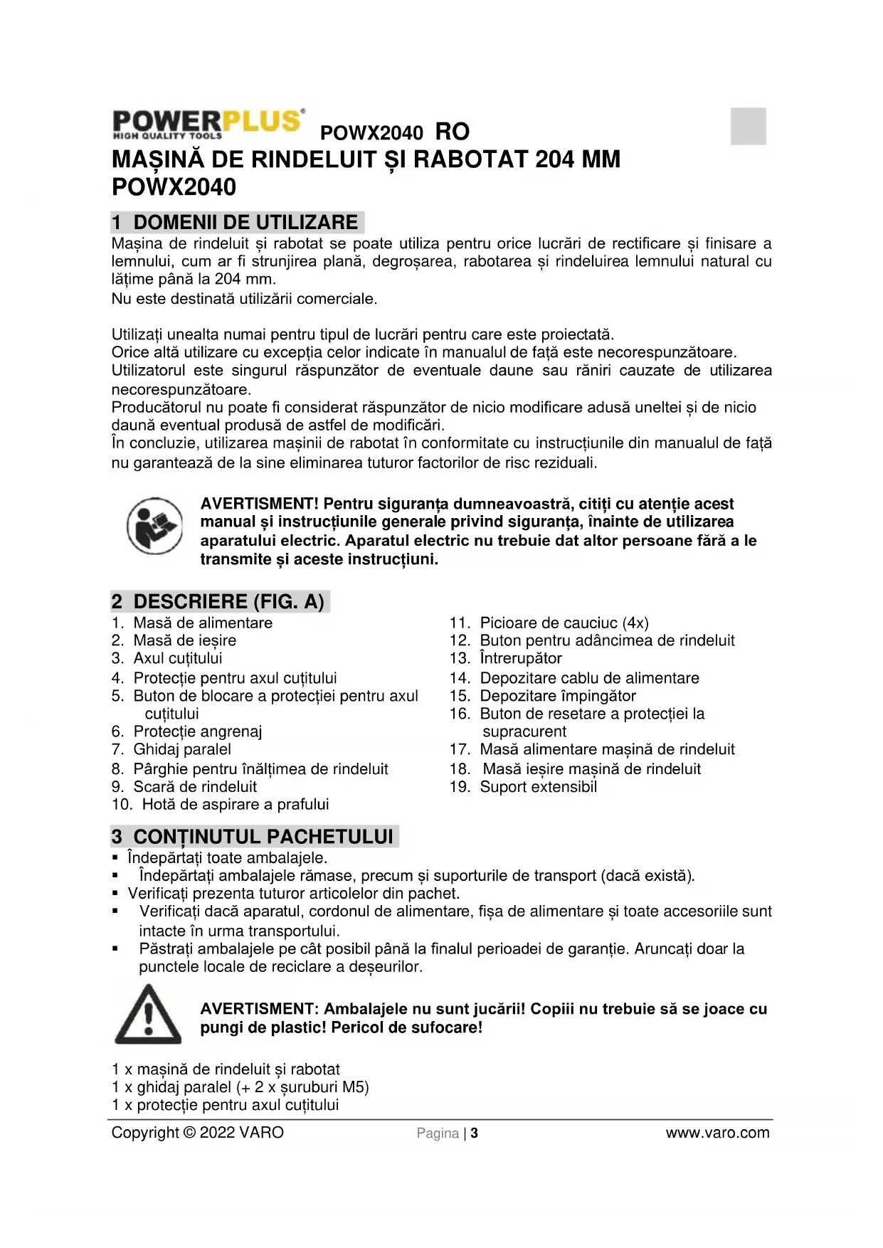 - Păstrați ambalajele pe cât posibil până la finalul perioadei de garanție. Aruncați doar la punctele locale de reciclare a deșeurilor. AVERTISMENT: Ambalajele nu sunt jucării! Copiii nu trebuie să se joace cu pungi de plastic! Pericol de sufocare! 1 x mașină de rindeluit și rabotat 1 x ghidaj paralel (+ 2 x șuruburi M5) 1 x protecție pentru axul cuțituluiPOWX2040 RO Copyright © 2022 VARO Pagina | 4 www.varo.com 1 x protecție a axului cuțitului (+ 1 x șurub & șaibă + 1 x șurub M6 & piuliță-fluture) 1 x piuliță-fluture pentru axul cuțitului 1 x hotă de aspirare a prafului 1 x adaptor de 100 mm pentru aspirarea prafului 2 x bloc împingător 1 x tijă împingător 4 x picioare de cauciuc (+ 4 x șuruburi & șaibe M8) 1 x dispozitiv de fixare a cuțitului 3 x cheie hexagonală (4, 5 & 6 mm) 1 x pârghie pentru înălțimea de rindeluire 1 x buton de blocare a protecției axului cuțitului (+ șaibă) 1 x manual În cazul în care lipsesc componente sau acestea sunt deteriorate, contactați magazinul de unde ați cumpărat produsul. 4 SIMBOLURI În acest manual și sau pe mașină se folosesc următoarele simboluri: