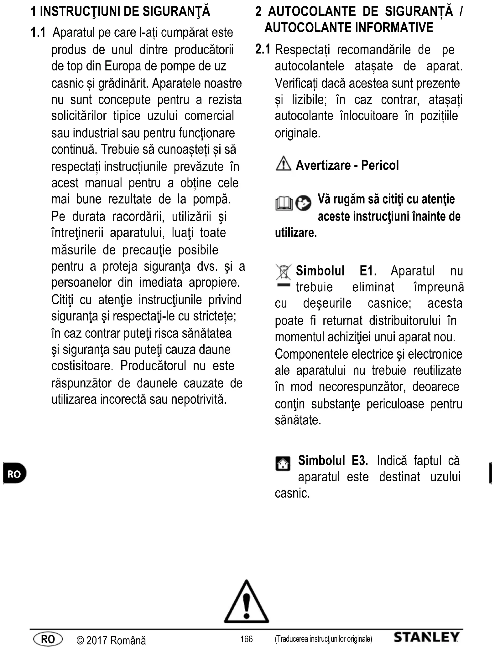 Respectați recomandările de pe autocolantele atașate de aparat. Verificați dacă acestea sunt prezente și lizibile; în caz contrar, atașați autocolante înlocuitoare în pozițiile originale. Avertizare - Pericol Vă rugăm să citiţi cu atenţie aceste instrucţiuni înainte de utilizare. Simbolul E1. Aparatul nu trebuie eliminat împreună cu deşeurile casnice; acesta poate fi returnat distribuitorului în momentul achiziţiei unui aparat nou. Componentele electrice şi electronice ale aparatului nu trebuie reutilizate în mod necorespunzător, deoarece conţin substanţe periculoase pentru sănătate. Simbolul E3. Indică faptul că aparatul este destinat uzului casnic.167 (Traducerea instrucţiunilor originale) Română (Traducerea instrucţiunilor originale) © 2017 Română