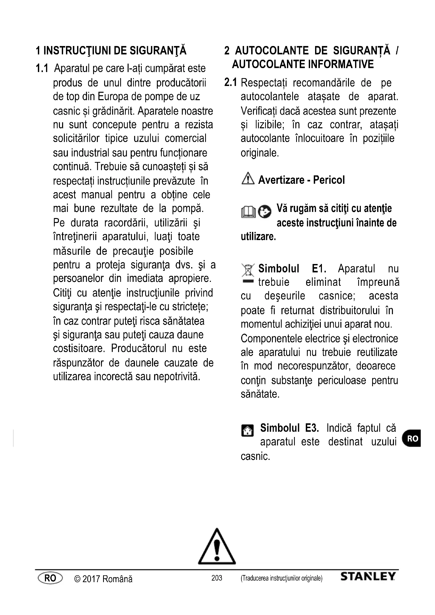 Respectați recomandările de pe autocolantele atașate de aparat. Verificați dacă acestea sunt prezente și lizibile; în caz contrar, atașați autocolante înlocuitoare în pozițiile originale. Avertizare - Pericol Vă rugăm să citiţi cu atenţie aceste instrucţiuni înainte de utilizare. Simbolul E1. Aparatul nu trebuie eliminat împreună cu deşeurile casnice; acesta poate fi returnat distribuitorului în momentul achiziţiei unui aparat nou. Componentele electrice şi electronice ale aparatului nu trebuie reutilizate în mod necorespunzător, deoarece conţin substanţe periculoase pentru sănătate. Simbolul E3. Indică faptul că aparatul este destinat uzului casnic.204 (Traducerea instrucţiunilor originale) © 2017 Română (Traducerea instrucţiunilor originale) Română