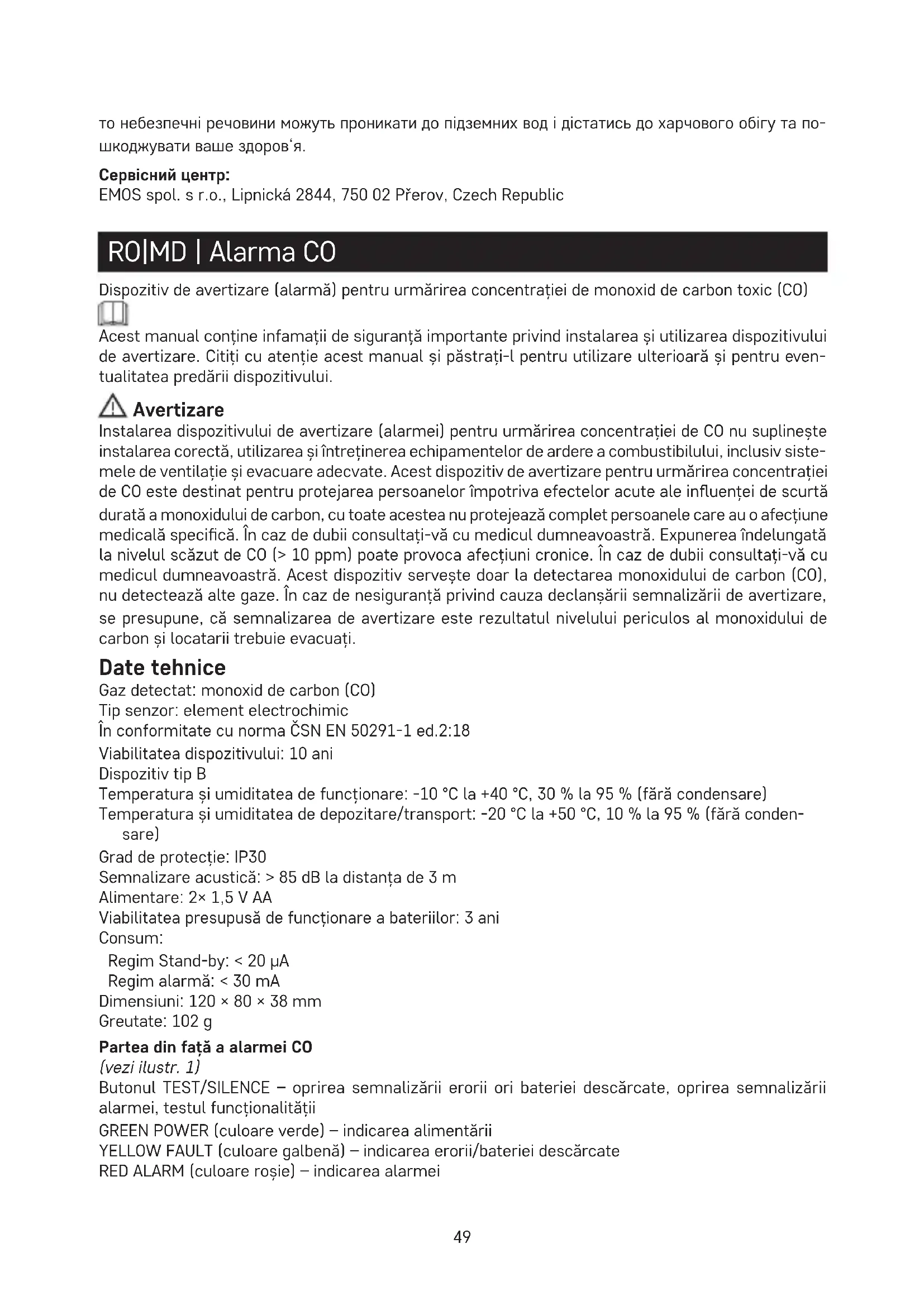 - Цей пристрій не призначений для користування особам (включно дітей), для котрих фізична, почуттєва чи розумова нездібність, чи не достаток досвіду та знань забороняє ним безпечно користуватися, якщо така особа не буде під доглядом, чи якщо не була проведена для неї інструктаж щодо користування споживачем відповідною особою, котра відповідає за її без- печність. Необхідно дивитися за дітьми та забезпечити, щоб вони з пристроєм не гралися. Не викидуйте електричні пристрої як несортовані комунальні відходи, користуйтесь місцями збору комунальних відходів. За актуальною інформацією про місця збору звертайтесь до установ за місцем проживання. Якщо електричні присторої розміщені на місцях з відходами,49 то небезпечні речовини можуть проникати до підземних вод і дістатись до харчового обігу та по- шкоджувати ваше здоров‘я. Сервісний центр: EMOS spol. s r.o., Lipnická 2844, 750 02 Přerov, Czech Republic RO|MD | Alarma CO Dispozitiv de avertizare (alarmă) pentru urmărirea concentrației de monoxid de carbon toxic (CO) Acest manual conține infamații de siguranță importante privind instalarea și utilizarea dispozitivului de avertizare. Citiți cu atenție acest manual și păstrați-l pentru utilizare ulterioară și pentru even- tualitatea predării dispozitivului. Avertizare Instalarea dispozitivului de avertizare (alarmei) pentru urmărirea concentrației de CO nu suplinește instalarea corectă, utilizarea și întreținerea echipamentelor de ardere a combustibilului, inclusiv siste- mele de ventilație și evacuare adecvate. Acest dispozitiv de avertizare pentru urmărirea concentrației de CO este destinat pentru protejarea persoanelor împotriva efectelor acute ale inuenței de scurtă durată a monoxidului de carbon, cu toate acestea nu protejează complet persoanele care au o afecțiune medicală specică. În caz de dubii consultați-vă cu medicul dumneavoastră. Expunerea îndelungată la nivelul scăzut de CO (> 10 ppm) poate provoca afecțiuni cronice. În caz de dubii consultați-vă cu medicul dumneavoastră. Acest dispozitiv servește doar la detectarea monoxidului de carbon (CO), nu detectează alte gaze. În caz de nesiguranță privind cauza declanșării semnalizării de avertizare, se presupune, că semnalizarea de avertizare este rezultatul nivelului periculos al monoxidului de carbon și locatarii trebuie evacuați. Date tehnice Gaz detectat: monoxid de carbon (CO) Tip senzor: element electrochimic În conformitate cu norma ČSN EN 50291-1 ed.2:18 Viabilitatea dispozitivului: 10 ani Dispozitiv tip B Temperatura și umiditatea de funcționare: -10 °C la +40 °C, 30 % la 95 % (fără condensare) Temperatura și umiditatea de depozitare/transport: -20 °C la +50 °C, 10 % la 95 % (fără conden- sare) Grad de protecție: IP30 Semnalizare acustică: > 85 dB la distanța de 3 m Alimentare: 2× 1,5 V AA Viabilitatea presupusă de funcționare a bateriilor: 3 ani Consum: Regim Stand-by: < 20 µA Regim alarmă: < 30 mA Dimensiuni: 120 × 80 × 38 mm Greutate: 102 g Partea din față a alarmei CO (vezi ilustr. 1) Butonul TEST/SILENCE – oprirea semnalizării erorii ori bateriei descărcate, oprirea semnalizării alarmei, testul funcționalității GREEN POWER (culoare verde) – indicarea alimentării YELLOW FAULT (culoare galbenă) – indicarea erorii/bateriei descărcate RED ALARM (culoare roșie) – indicarea alarmei50 Ce este monoxidul de carbon (CO) Monoxidul de carbon (CO) este un gaz invizibil fără miros, care este extrem de toxic. Rezultă din arderea incompletă a combustibililor, de exemplu a lemnului, cărbunelui din lemn, cărbunelui, uleiului de încălzire, paranei, benzinei, gazelor naturale, propanului, butanului etc. și din fum de țigară. Concentrația periculoasă de CO poate să apară dacă echipamentul este defect sau cu între- ținere incorectă, la blocarea coșului de fum sau în cazul aerisirii insuciente a încăperii. Gravitatea intoxicării prin inhalarea CO depinde de concentrație (prezentată ca număr de particule la un milion, ppm) și durata expoziției. Concentrația Simptome 100 ppm Niciun fel de simptome – fără pericol 200 ppm Dureri ușoare ale capului 400 ppm Dureri puternice ale capului după 1–2 ore 800 ppm Dureri puternice ale capului după 45 de minute, greață, leșin și inconștiență după 2 ore 1 000 ppm Concentrație periculoasă – inconștiență după 1 oră 1 600 ppm Greață, dureri puternice ale capului și amețeli după 20 de minute 3 200 ppm Greață, dureri puternice ale capului și amețeli după 5–10 minute, inconștiență după 30 de minute 6 400 ppm Dureri puternice ale capului și amețeli după 1–2 minute, inconștiență după 10–15 minute 12 800 ppm Inconștiență imediată, pericol de moarte după 1–2 minute În privința simptomelor intoxicării cu CO ar trebui să e instruite toate persoanele, care se aă în clădire! Dispozitivul de urmărire a concentrației de CO activează alarma, dacă în perioada stabilită detectează o anumită concentrație de CO: Concentrația CO în unități ppm Activarea alarmei ≥ 30 120 min ≥ 50 60 la 90 min ≥ 100 10 la 40 min ≥ 300 în 3 min Instalarea Instalarea trebuie executată de către o persoană competentă. În caz ideal dispozitiv