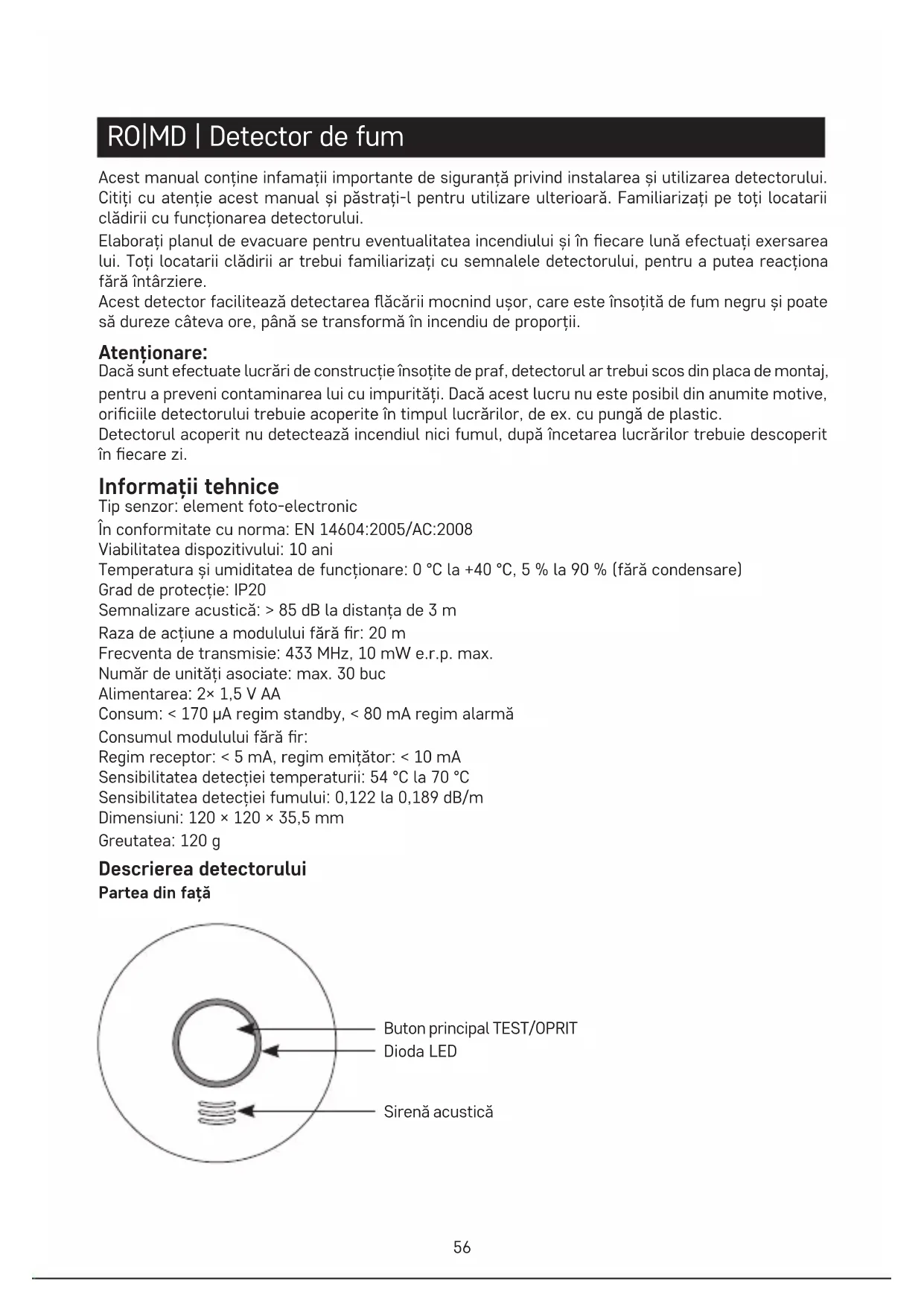 Siterwell Electronics CO., limited No.666 Qingfeng Road, Jiangbei District, Ningbo, Zhejiang Province, China Цим підприємство EMOS spol. s r. o. проголошує, що тип радіообладнання GS558 відповідає Ди- рективам 2014/53/EU. Повний текст ЄС проголошення про відповідність можна знайти на цьому сайті http://www.emos.eu/download.56 RO|MD | Detector de fum Acest manual conține infamații importante de siguranță privind instalarea și utilizarea detectorului. Citiți cu atenție acest manual și păstrați-l pentru utilizare ulterioară. Familiarizați pe toți locatarii clădirii cu funcționarea detectorului. Elaborați planul de evacuare pentru eventualitatea incendiului și în ecare lună efectuați exersarea lui. Toți locatarii clădirii ar trebui familiarizați cu semnalele detectorului, pentru a putea reacționa fără întârziere. Acest detector facilitează detectarea ăcării mocnind ușor, care este însoțită de fum negru și poate să dureze câteva ore, până se transformă în incendiu de proporții. Atenționare: Dacă sunt efectuate lucrări de construcție însoțite de praf, detectorul ar trebui scos din placa de montaj, pentru a preveni contaminarea lui cu impurități. Dacă acest lucru nu este posibil din anumite motive, oriciile detectorului trebuie acoperite în timpul lucrărilor, de ex. cu pungă de plastic. Detectorul acoperit nu detectează incendiul nici fumul, după încetarea lucrărilor trebuie descoperit în ecare zi. Informații tehnice Tip senzor: element foto-electronic În conformitate cu norma: EN 14604:2005/AC:2008 Viabilitatea dispozitivului: 10 ani Temperatura și umiditatea de funcționare: 0 °C la +40 °C, 5 % la 90 % (fără condensare) Grad de protecție: IP20 Semnalizare acustică: > 85 dB la distanța de 3 m Raza de acțiune a modulului fără r: 20 m Frecventa de transmisie: 433 MHz, 10 mW e.r.p. max. Număr de unități asociate: max. 30 buc Alimentarea: 2× 1,5 V AA Consum: < 170 µA regim standby, < 80 mA regim alarmă Consumul modulului fără r: Regim receptor: < 5 mA, regim emițător: < 10 mA Sensibilitatea detecției temperaturii: 54 °C la 70 °C Sensibilitatea detecției fumului: 0,122 la 0,189 dB/m Dimensiuni: 120 × 120 × 35,5 mm Greutatea: 120 g Descrierea detectorului Partea din față Buton principal TEST/OPRIT Dioda LED Sirenă acustică57 Partea din spate Modul de atașare a capacului de monta Modul de introducere a bateriilo