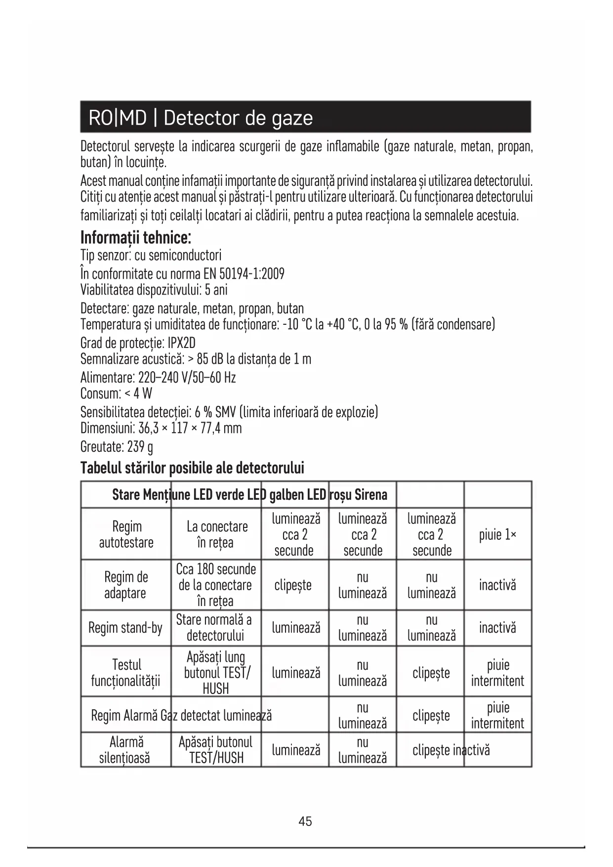luminează clipește inactivă46 Stare Mențiune LED verde LED galben LED roșu Sirena Senzor de gaze defect Înlocuiți detectorul luminează luminează