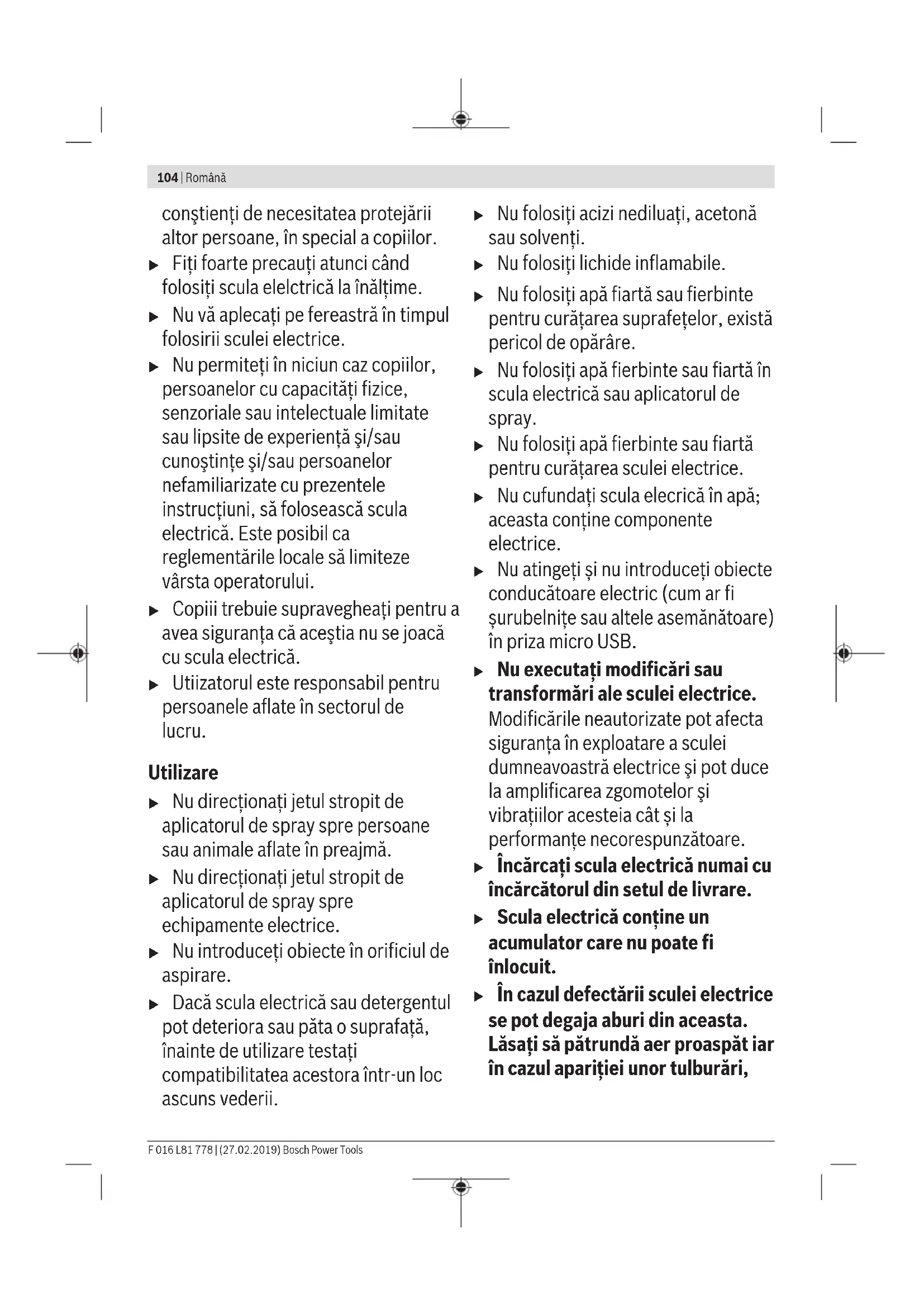 Құралды тұрмыстық қалдықтар контейнеріне тастамаңыз! Тек қана ЕО елдері үшін: Еуропа 2012/19/EU ережесі бойынша, қолдану үшін жарамсыз электр құралдары және, Еуропа 2006/66/EC ережесі бойынша, зақымдалған немесе тозған аккумуляторлар/батареялар бөлек жиналып, кәдеге жаратылуы тиіс. Аккумуляторлар/батареялар: u Біріктіріліп құрастырылған аккумуляторлар, оларды кәдеге жарату үшін, электр құралдан тек қана арнайы техникалық мамандар арқылы шығарылуы тиіс. Тұрқы қаптамасын ашу электр құралының бұзылуына апара алады. Аккумуляторларды/батареяларды тұрмыстық қалдықтар контейнерлеріне, өртке немесе суға тастамаңыз. Аккумулятор/батареялары, мүмкіндігінше қуатсыздандырылып қойылған қалыпта, жиналып, қайта өңделіп немесе қоршаған ортаға зиян келтірмейтіндей түрде кәдеге жаратылуы тиіс. Română Instrucţiuni privind siguranţa şi protecţia muncii AVERTISMENT! Citiţi toate instrucţiunile şi indicaţiile privind siguranţa. Nerespectarea instrucţiunilor şi indicaţiiloror privind siguranţa poate provoca răniri grave. Simboluri Următoarele simboluri sunt importante pentru citirea şi înţelegerea instrucţiunilor de folosire. Reţineţi simbolurile şi semnificaţia acestora. Interpretarea corectă a simbolurilor vă ajută să folosiţi mai bine şi mai sigur scula electrică. Simbol Semnificaţie Indicaţie generală de avertizare a periculozităţii Citiţi instrucţiunile de folosire Direcţia reacţiei Direcţie de deplasare Pornire Oprire CLICK! Zgomot perceptibil Volum maxim de umplere Accesorii Manevrare u Utilizatorul poate folosi scula electrică numai conform destinaţiei. Trebuie luate în considerare condiţiile locale. În timpul lucrului fiţi Bosch Power Tools F 016 L81 778 | (27.02.2019)104 | Română conştienţi de necesitatea protejării altor persoane, în special a copiilor. u Fiți foarte precauți atunci când folosiți scula elelctrică la înălțime. u Nu vă aplecați pe fereastră în timpul folosirii sculei electrice. u Nu permiteţi în niciun caz copiilor, persoanelor cu capacităţi fizice, senzoriale sau intelectuale limitate sau lipsite de experienţă şi/sau cunoştinţe şi/sau persoanelor nefamiliarizate cu prezentele instrucţiuni, să folosească scula electrică. Este posibil ca reglementările locale să limiteze vârsta operatorului. u Copiii trebuie supravegheaţi pentru a avea siguranţa că aceştia nu se joacă cu scula electrică. u Utiizatorul este responsabil pentru persoanele aflate în sectorul de lucru. Utilizare u Nu direcționați jetul stropit de aplicatorul de spray spre persoane sau animale aflate în preajmă. u Nu direcționați jetul stropit de aplicatorul de spray spre echipamente electrice. u Nu introduceți obiecte în orificiul de aspirare. u Dacă scula electrică sau detergentul pot deteriora sau păta o suprafață, înainte de utilizare testați compatibilitatea acestora într-un loc ascuns vederii. u Nu folosiți acizi nediluați, acetonă sau solvenți. u Nu folosiţi lichide inflamabile. u Nu folosiți apă fiartă sau fierbinte pentru curățarea suprafețelor, există pericol de opărâre. u Nu folosiți apă fierbinte sau fiartă în scula electrică sau aplicatorul de spray. u Nu folosiți apă fierbinte sau fiartă pentru curățarea sculei electrice. u Nu cufundați scula elecrică în apă; aceasta conține componente electrice. u Nu atingeți și nu introduceți obiecte conducătoare electric (cum ar fi șurubelnițe sau altele asemănătoare) în priza micro USB. u Nu executaţi modificări sau transformări ale sculei electrice. Modificările neautorizate pot afecta siguranţa în exploatare a sculei dumneavoastră electrice şi pot duce la amplificarea zgomotelor şi vibraţiilor acesteia cât și la performanțe necorespunzătoare. u Încărcaţi scula electrică numai cu încărcătorul din setul de livrare. u Scula electrică conține un acumulator care nu poate fi înlocuit. u În cazul defectării sculei electrice se pot degaja aburi din aceasta. Lăsați să pătrundă aer proaspăt iar în cazul apariției unor tulburări, F 016 L81 778 | (27.02.2019) Bosch Power ToolsRomână | 105 solicitați asistență medicală. Vaporii pot irita căile respiratorii Instrucţiuni privind siguranţa pentru încărcătoare Citiţi toate instrucţiunile şi indicaţiile privind siguranţa. Nerespectarea instrucţiunilor şi indicaţiilor privind siguranţa poate provoca electrocutare, incendiu şi/sau răniri grave. Păstrați prezentele instrucțuni pentru o utilizare viitoare. u Nu permiteţi în niciun caz copiilor, persoanelor cu capacităţi fizice, senzoriale sau intelectuale limitate sau lipsite de experienţă şi/sau cunoştinţe şi/sau persoanelor nefamiliarizate cu prezentele instrucţiuni, să folosească încărcătorul. Este posibil ca prescripţiile naţionale să limiteze vârsta operatorului. u Supravegheaţi copiii. Astfel veţi avea siguranţa că, copiii nu se joacă cu încărcătorul. u Feriți încărcătorul de ploaie și umezeală. Pătrunderea apei în încărcător măreşte riscul de electrocutare. u Menţineţi curat încărcătorul. Din cauza murdăriei există pericol de electrocutare. u Înainte de fiecare utilizare controlați încărcătorul și cablul USB. Dacă se constată o deteriorare a acestora, nu mai folosiți încărcătorul. N
